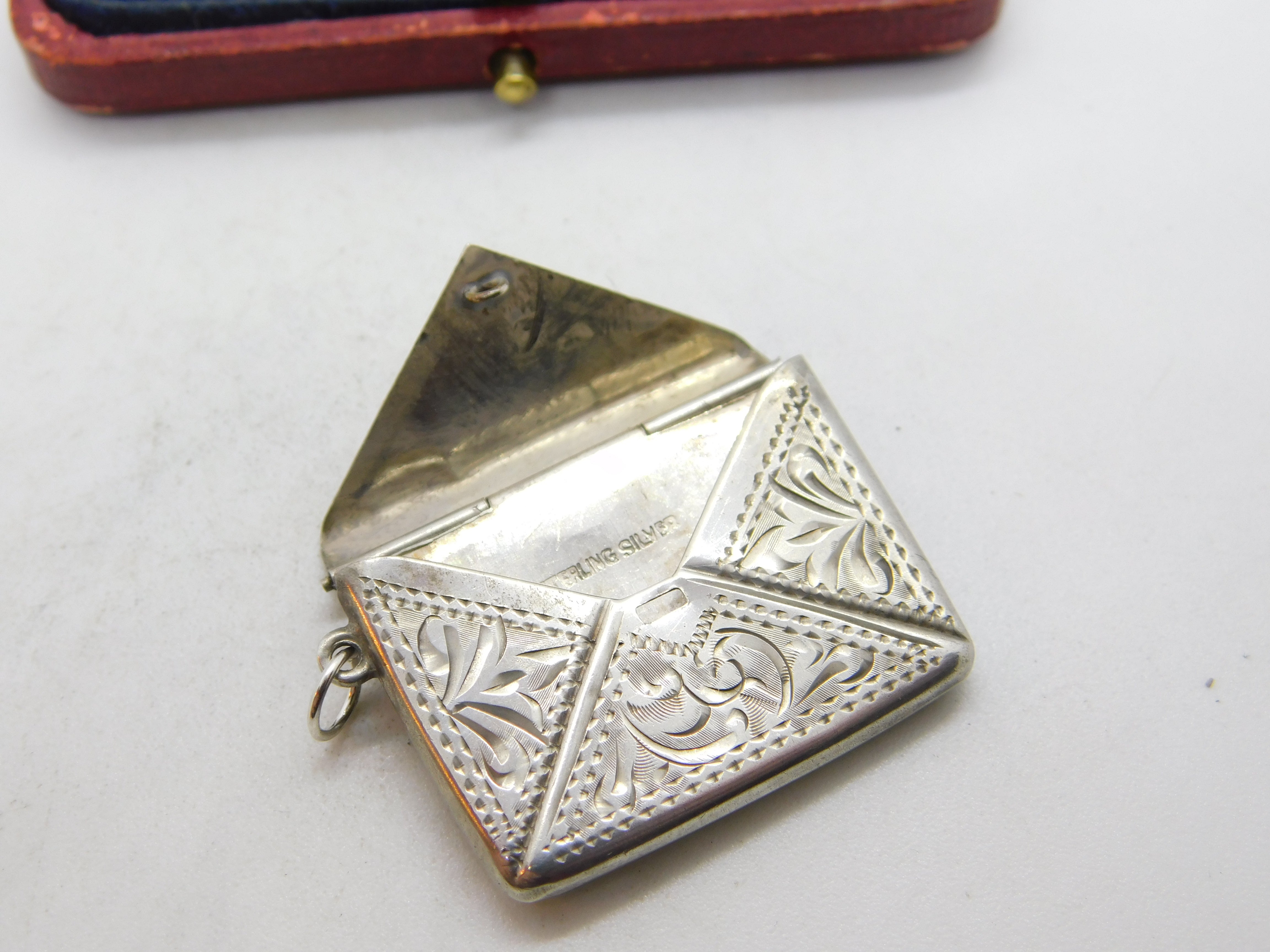 Sterling Silver Floral Pattern Envelope Form Stamp Case Fob Pendant Antique