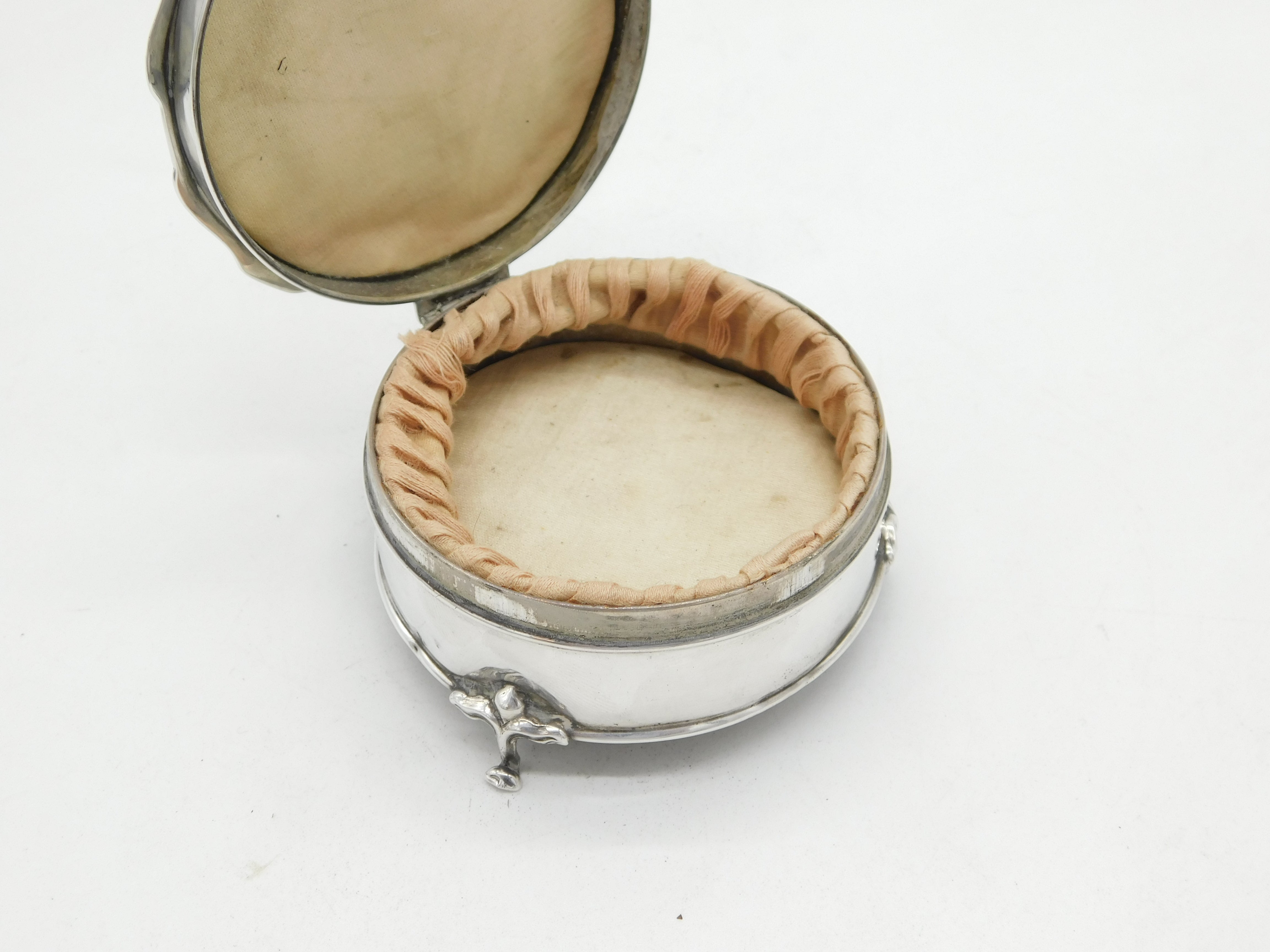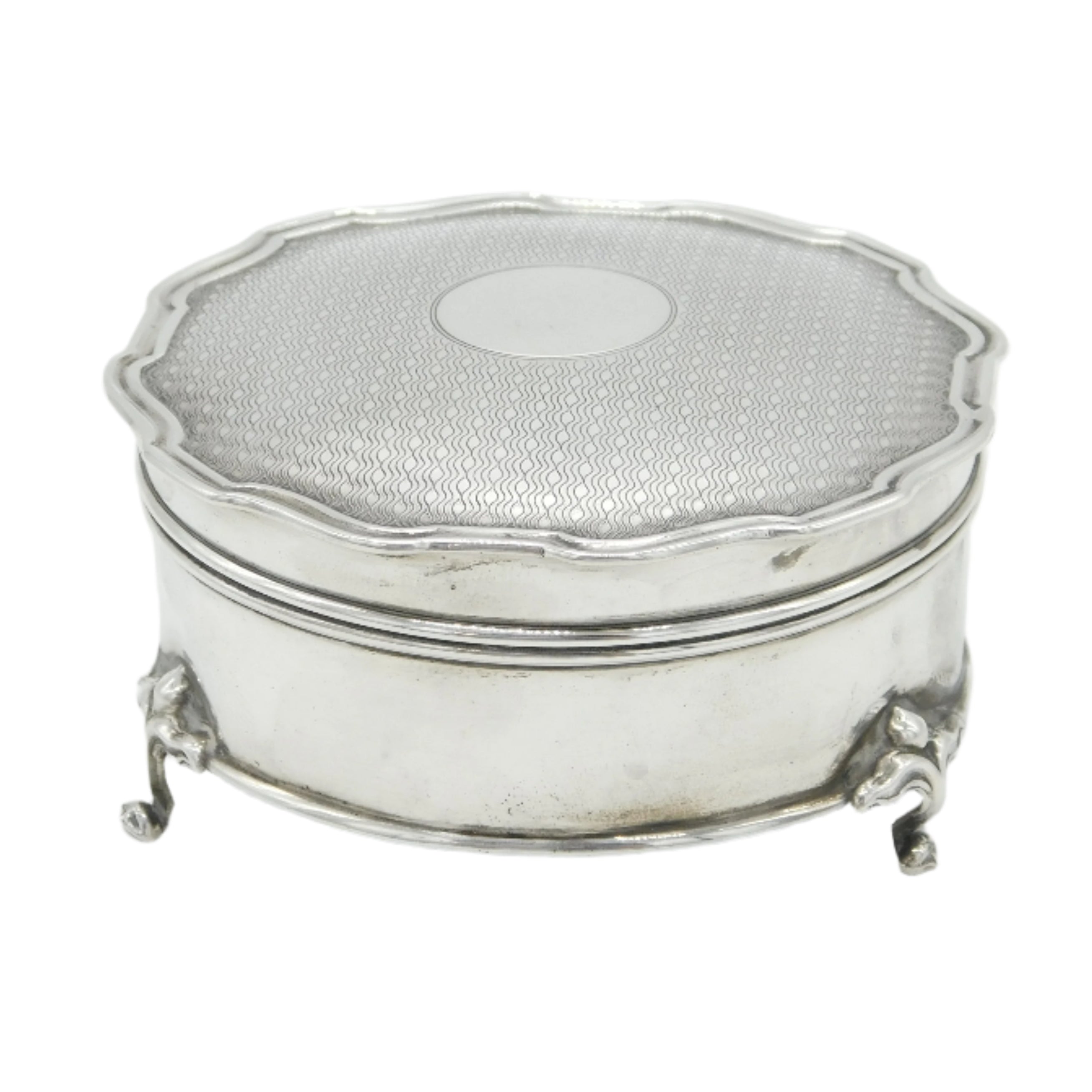 Details: A fantastic and wonderfully designed antique art deco sterling silver engine turned flower patterned jewellery box on paw feet with charming liner hallmarked Birmingham 1939 to the edge. This is a wonderful item that would make a perfect gift or addition to any collection.