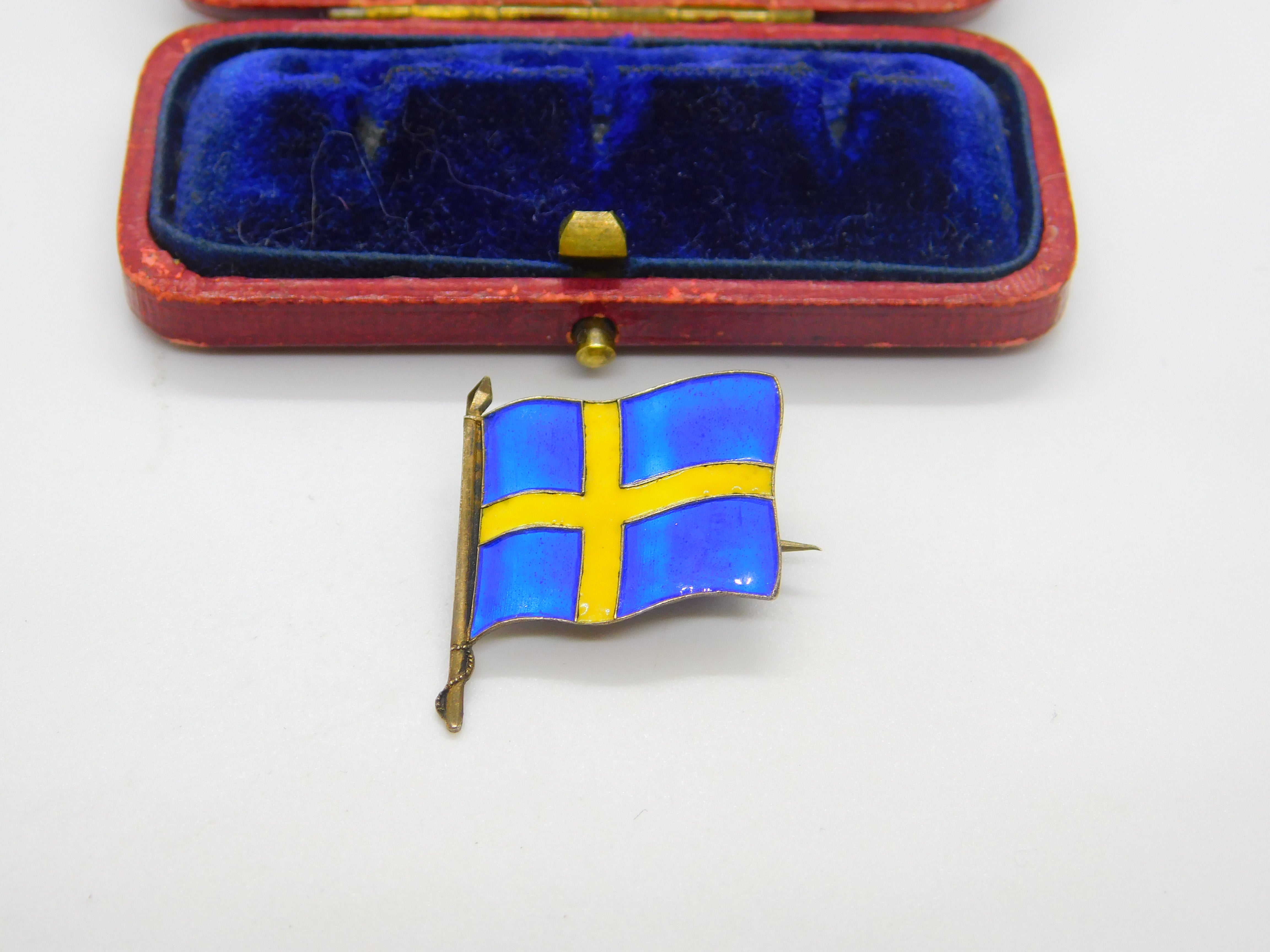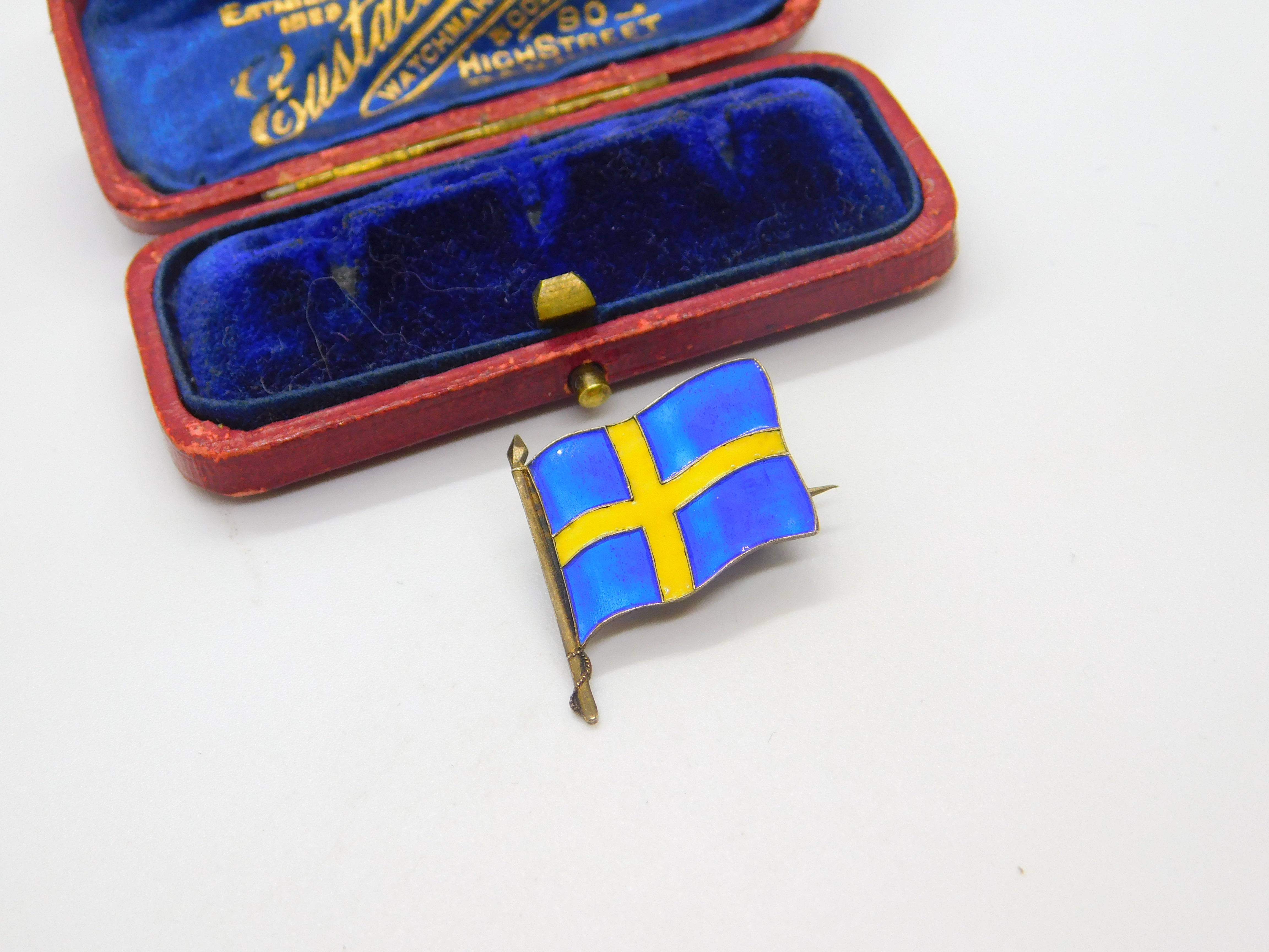 Sterling Silver Gilt & Colourful Enamel Swedish Flag Brooch Antique c1920 Deco