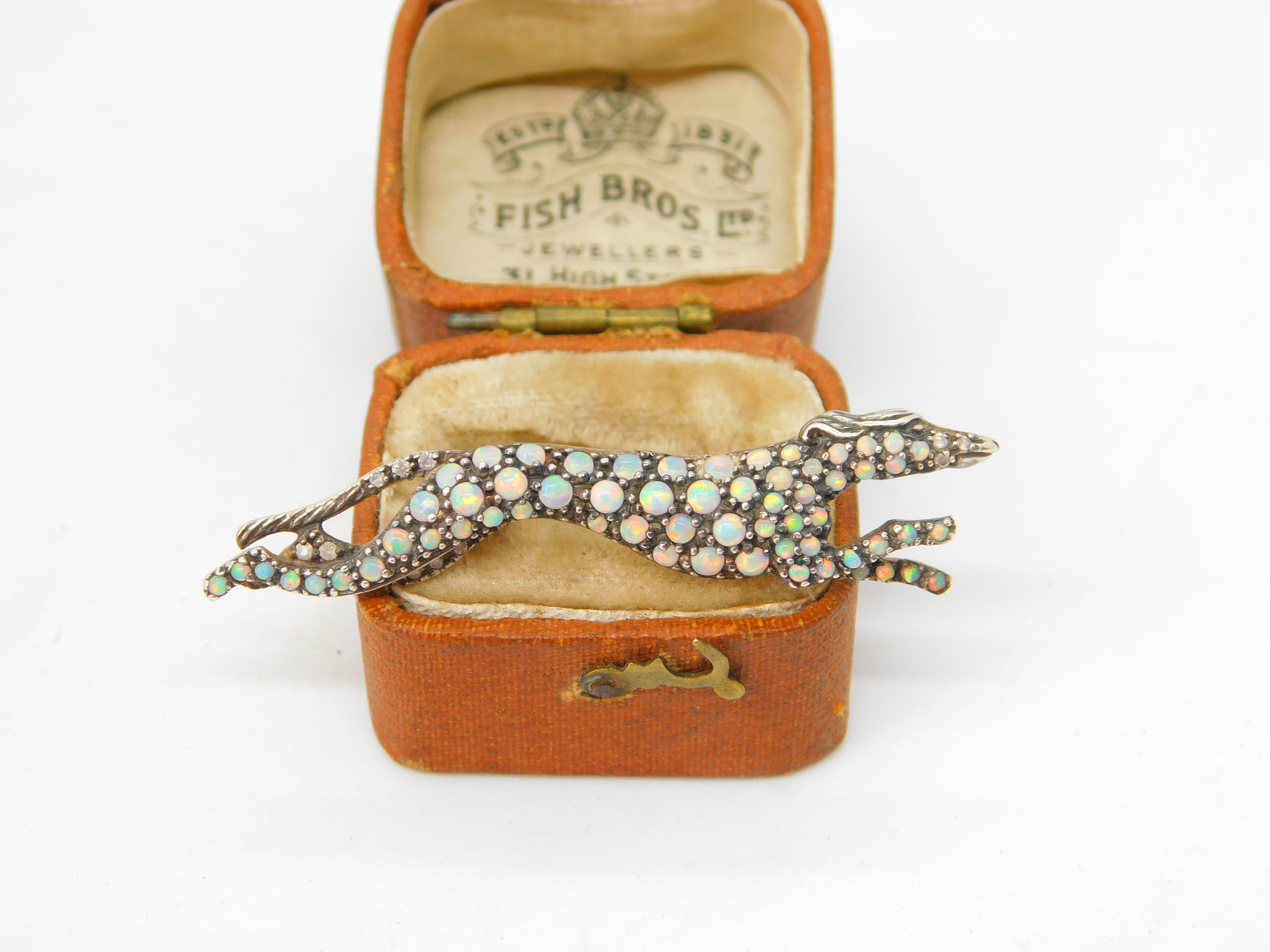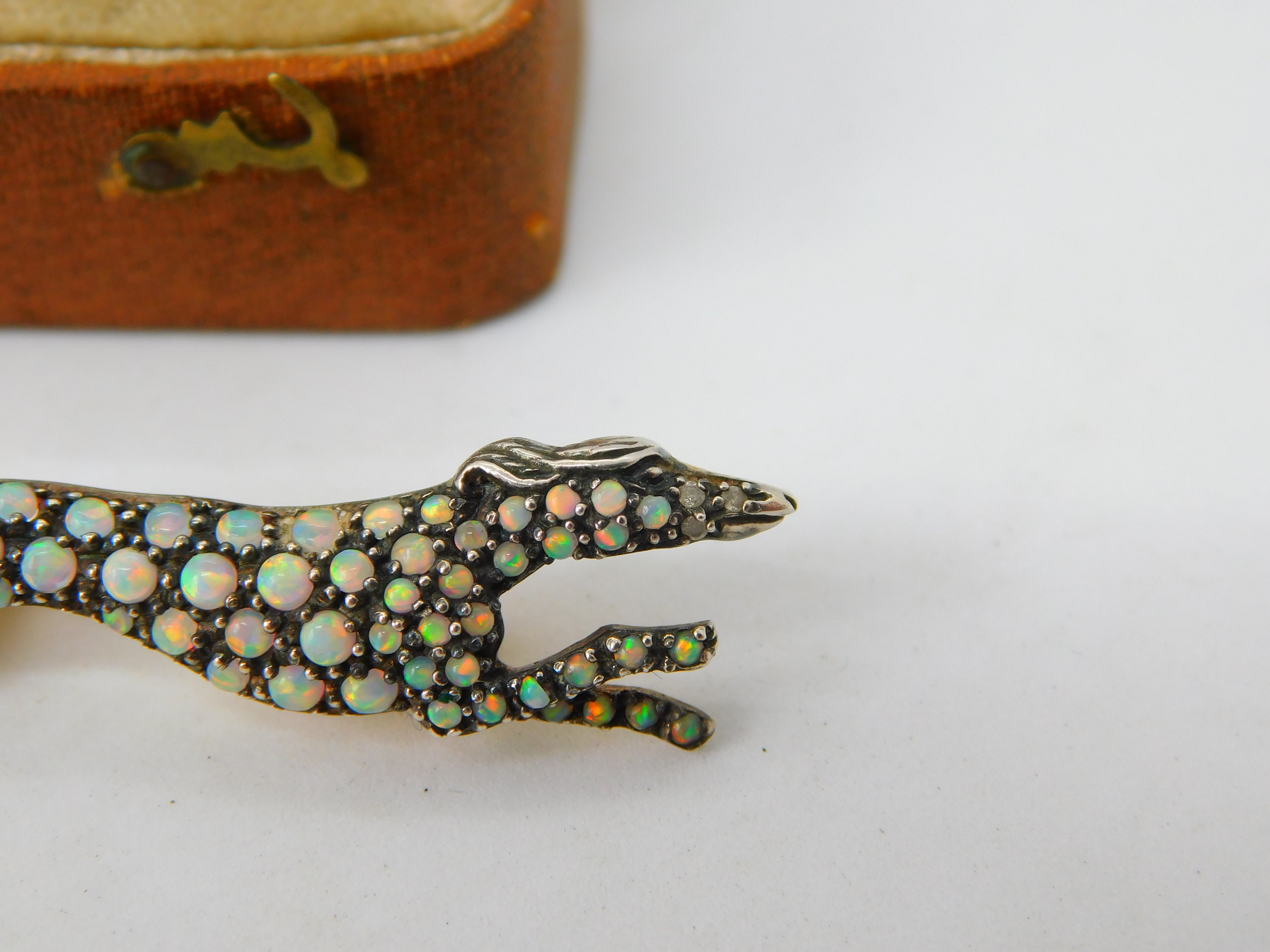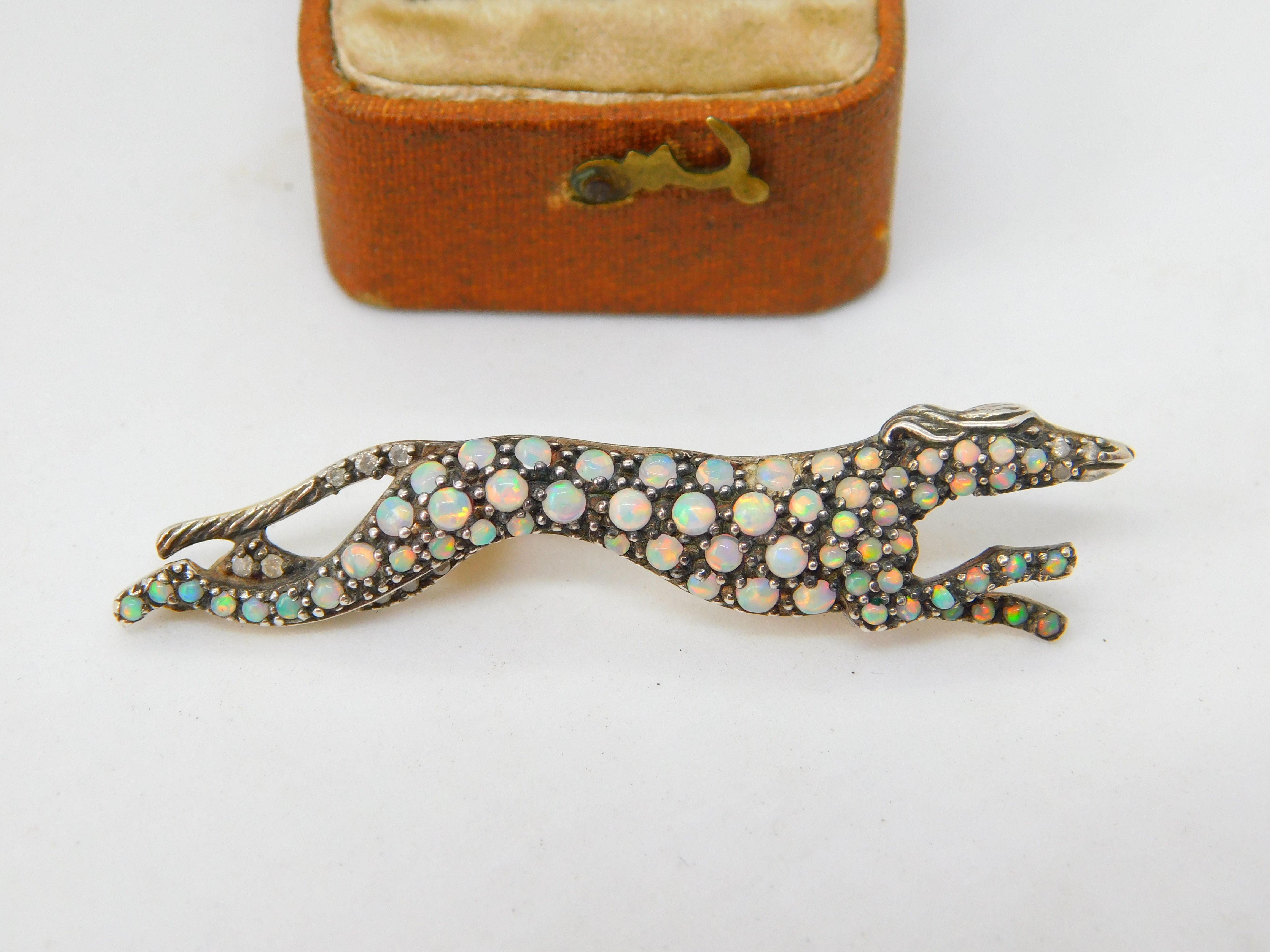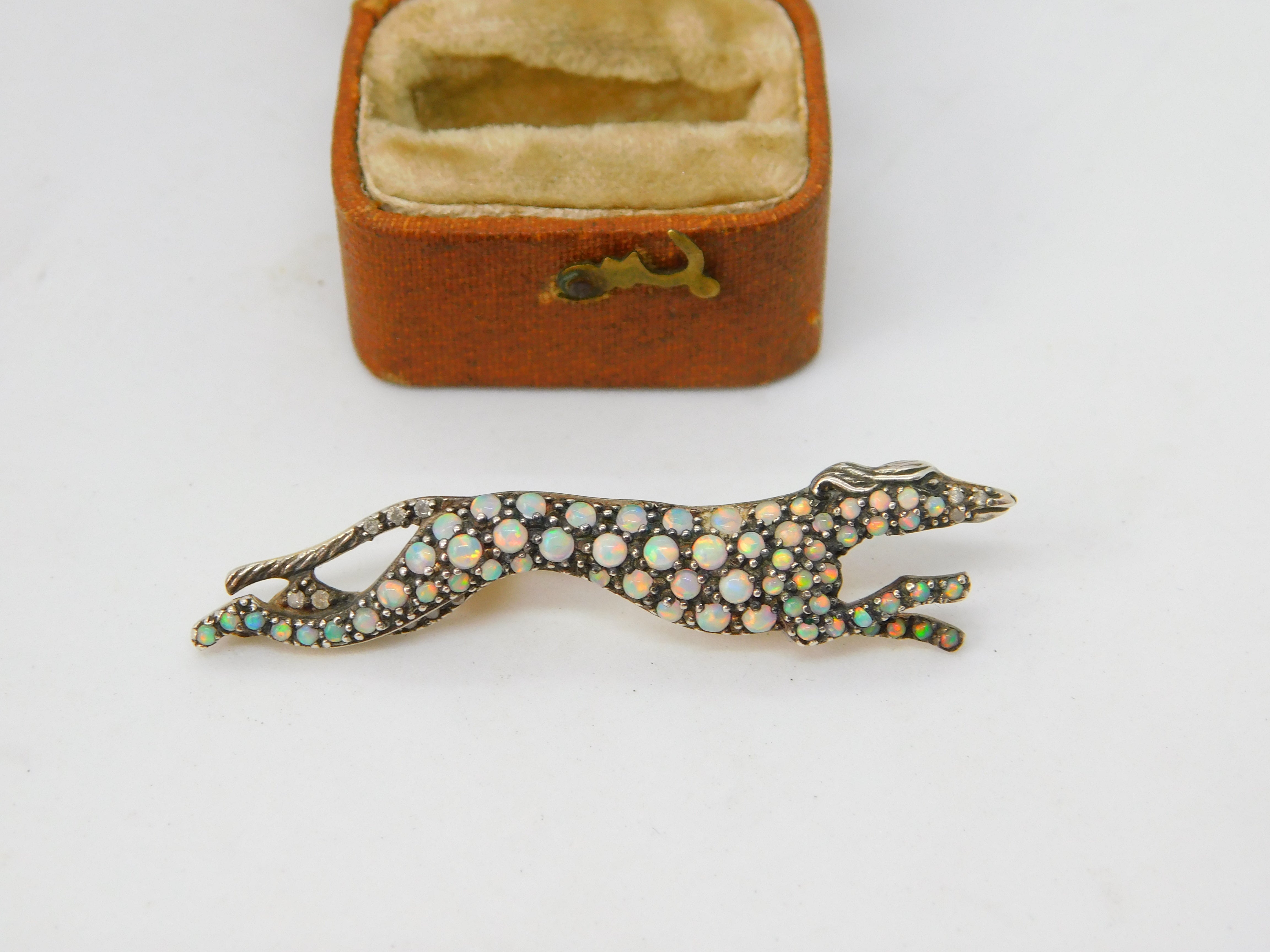 Details: A fantastic and wonderfully designed antique art deco sterling silver gilt running greyhound racing brooch pin with superb detailing to include pave set natural opals and diamonds c1920. The silver has been XRF tested as it is unmarked and the stones have all been tested. This is a wonderful item that would make a perfect gift or addition to any collection. The BOX pictured is for PRESENTATION ONLY and is NOT included in the listings but used to frame the pictures unless specifically stated otherwise.