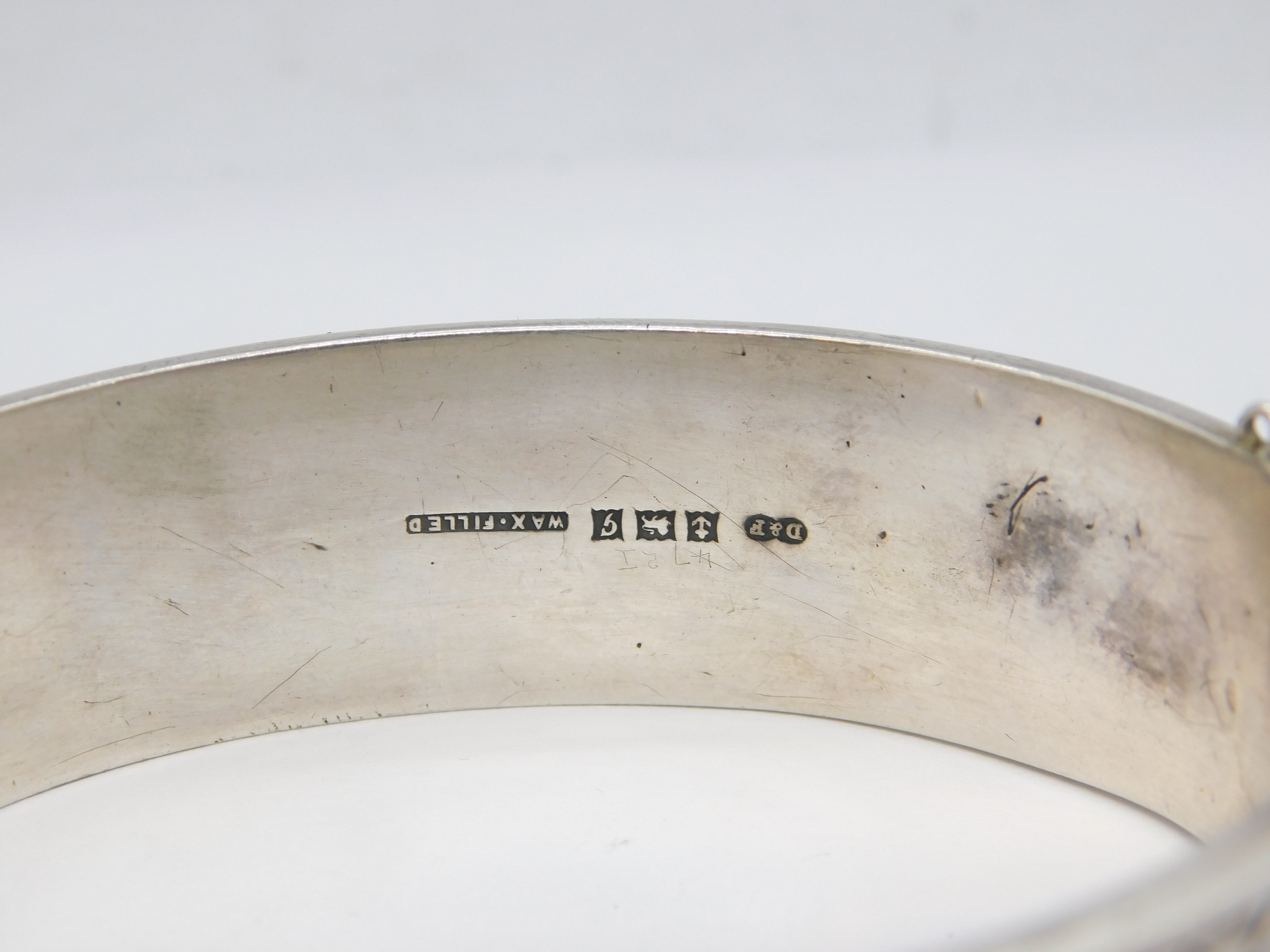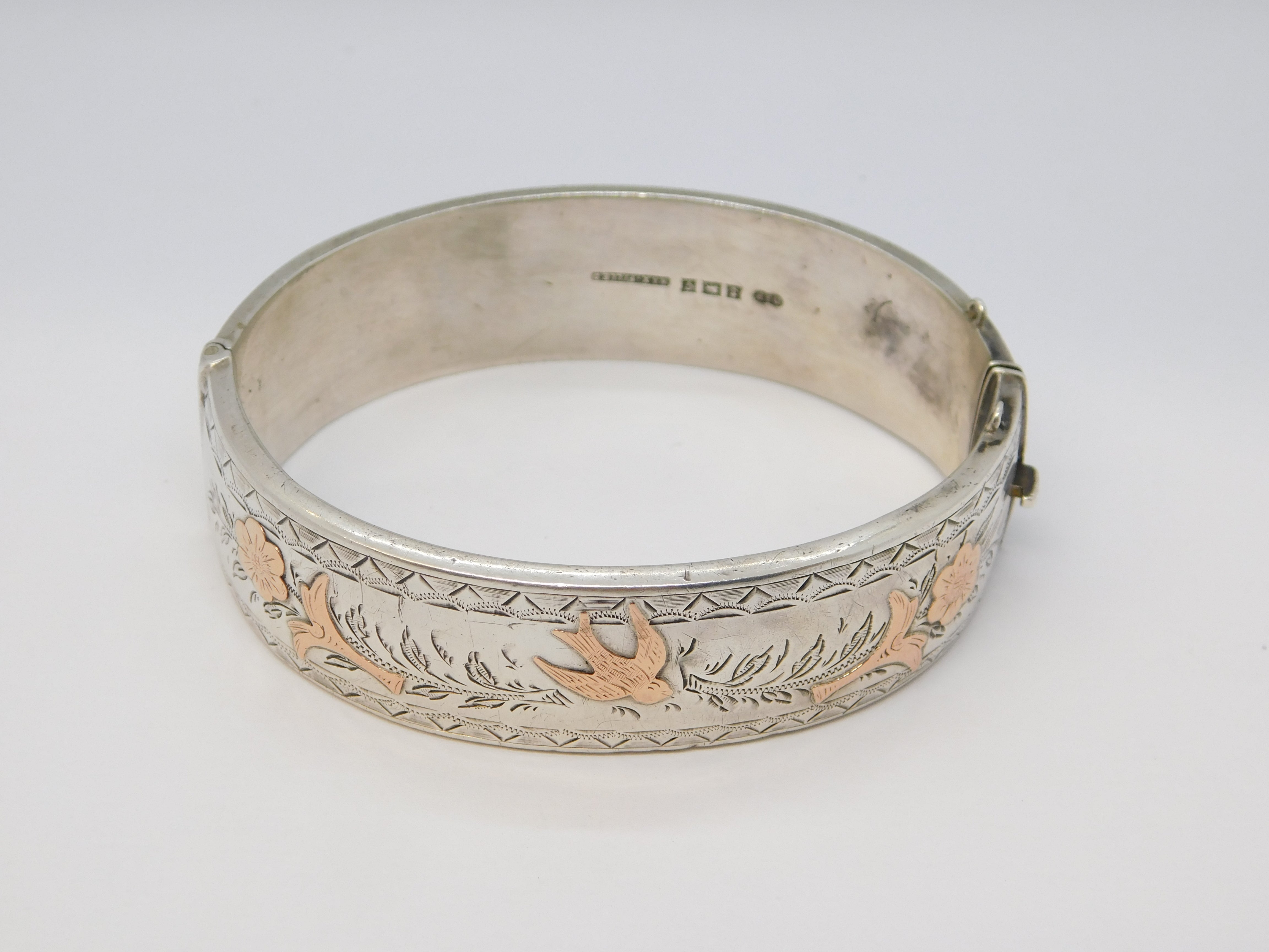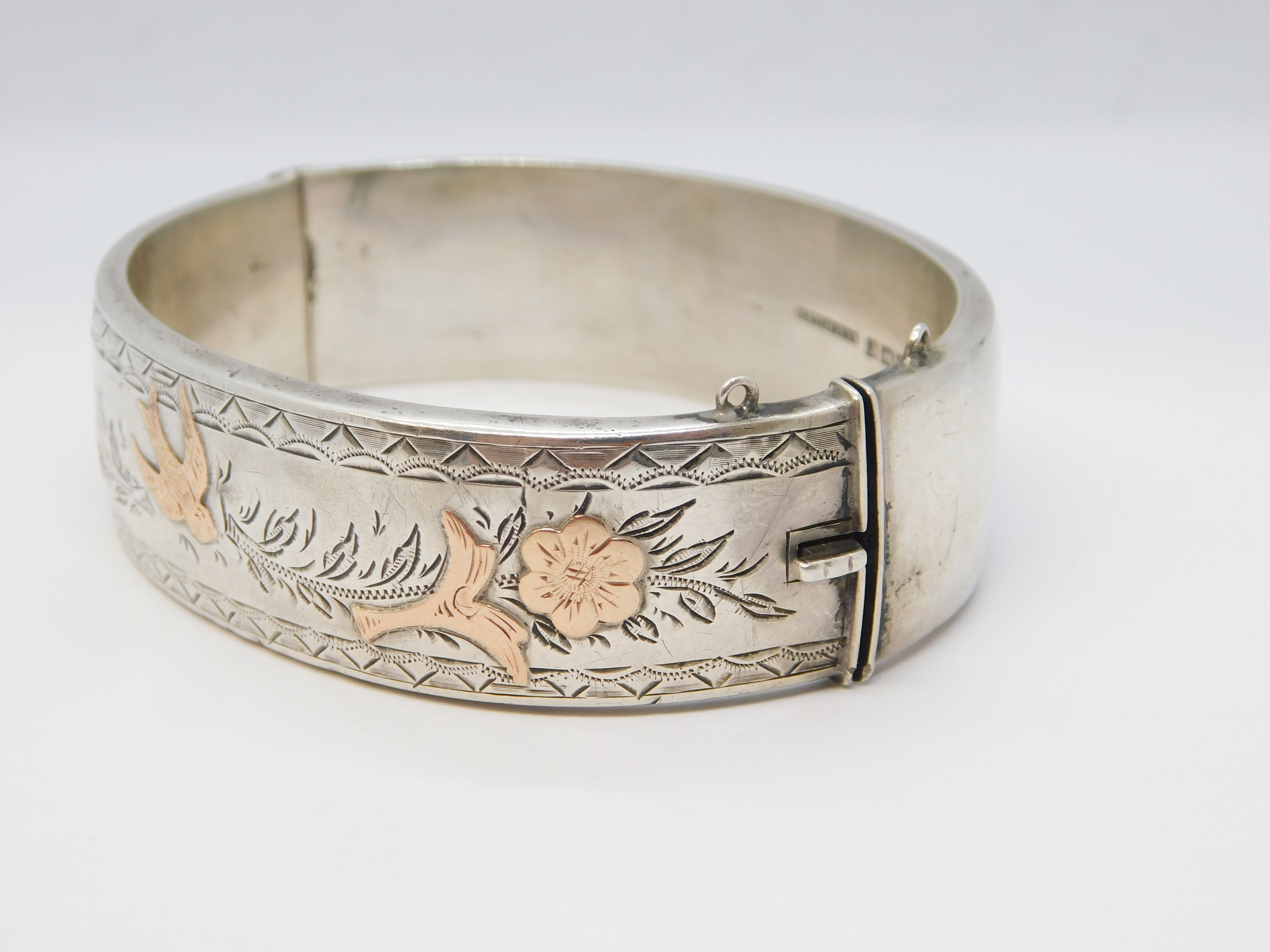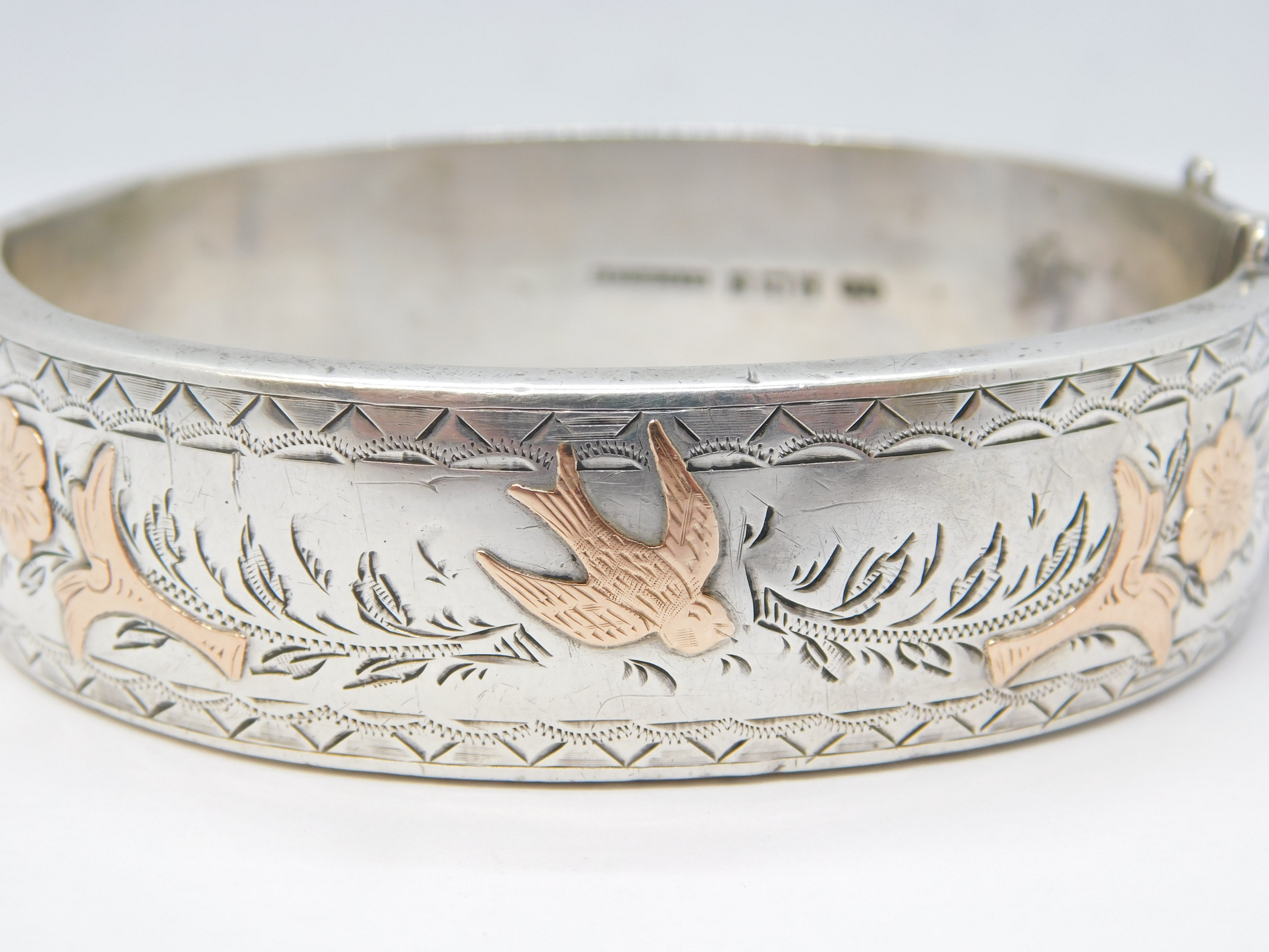 Sterling Silver Gold Fronted Swallow Bird & Flower Cuff Bangle Vintage 1981 Birmingham