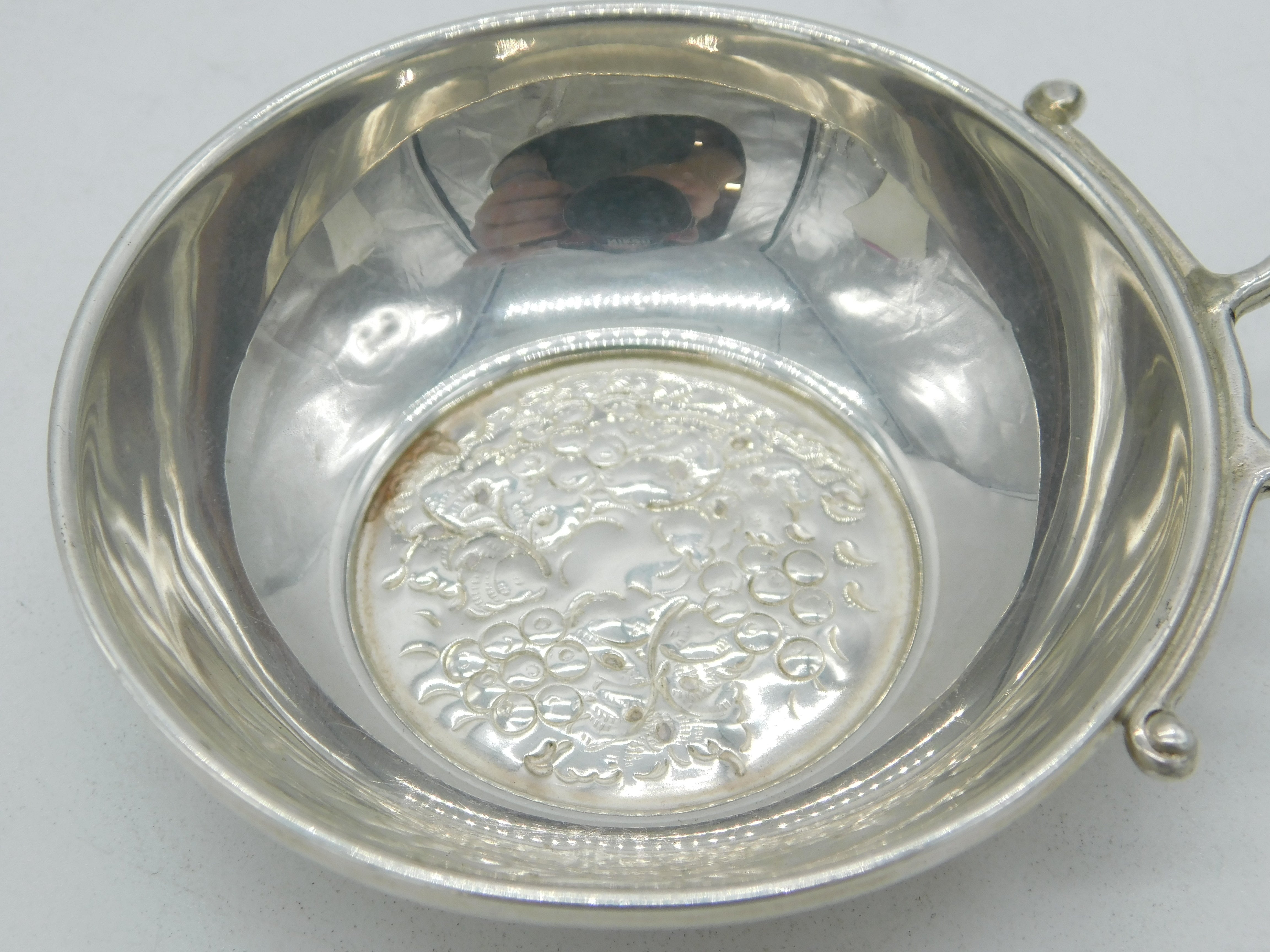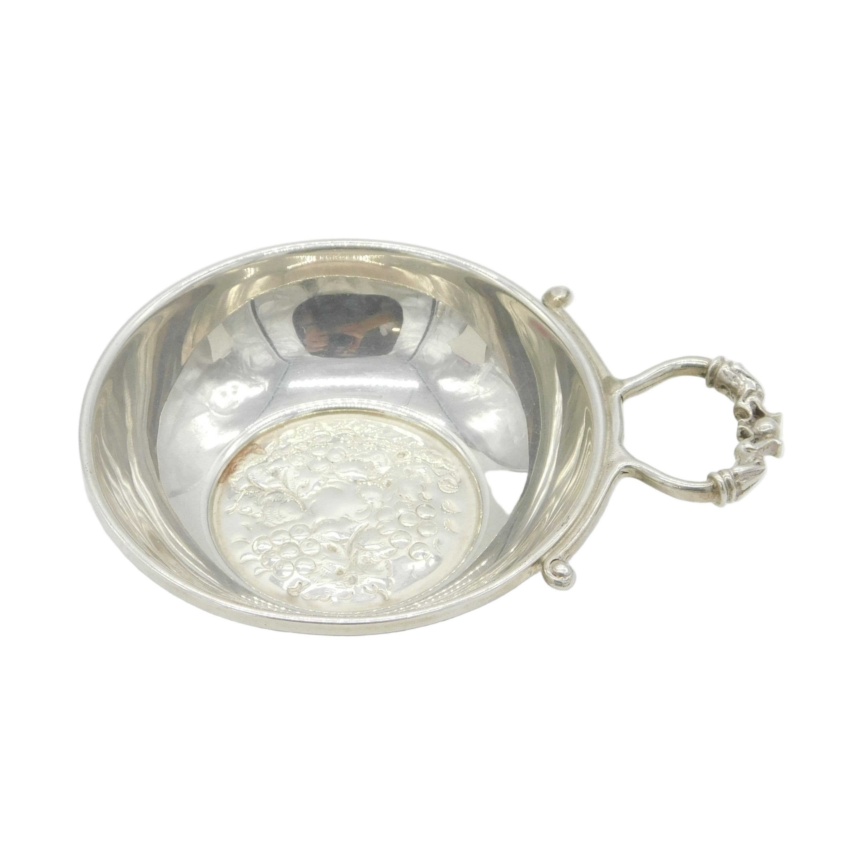 Details: A fantastic and wonderfully designed vintage sterling silver grape pattern tastevin or wine taster with charming detailing hallmarked Birmingham 1979 to the edge by maker Lawrence R Watson & Co. This is a wonderful item that would make a perfect gift or addition to any collection.