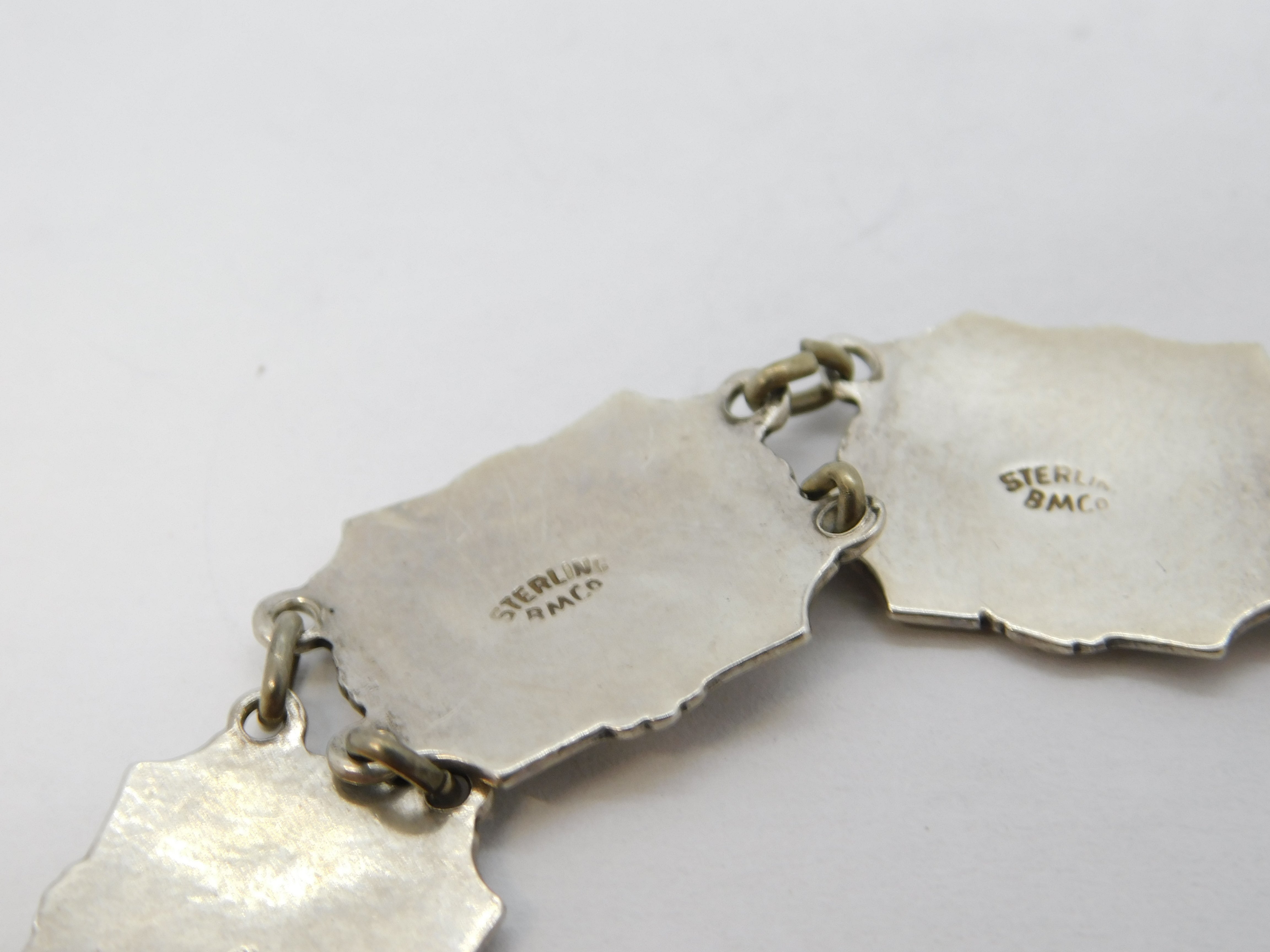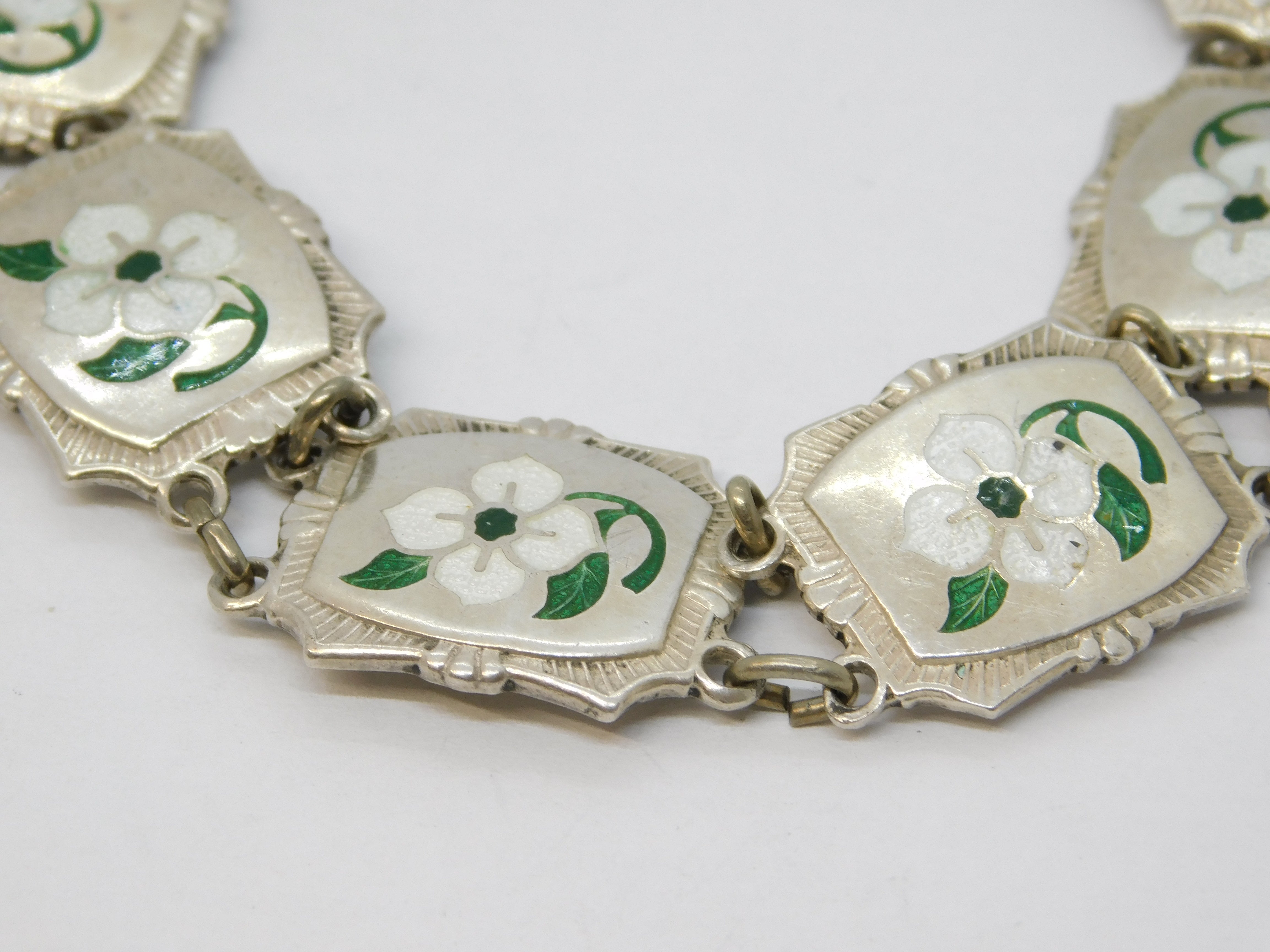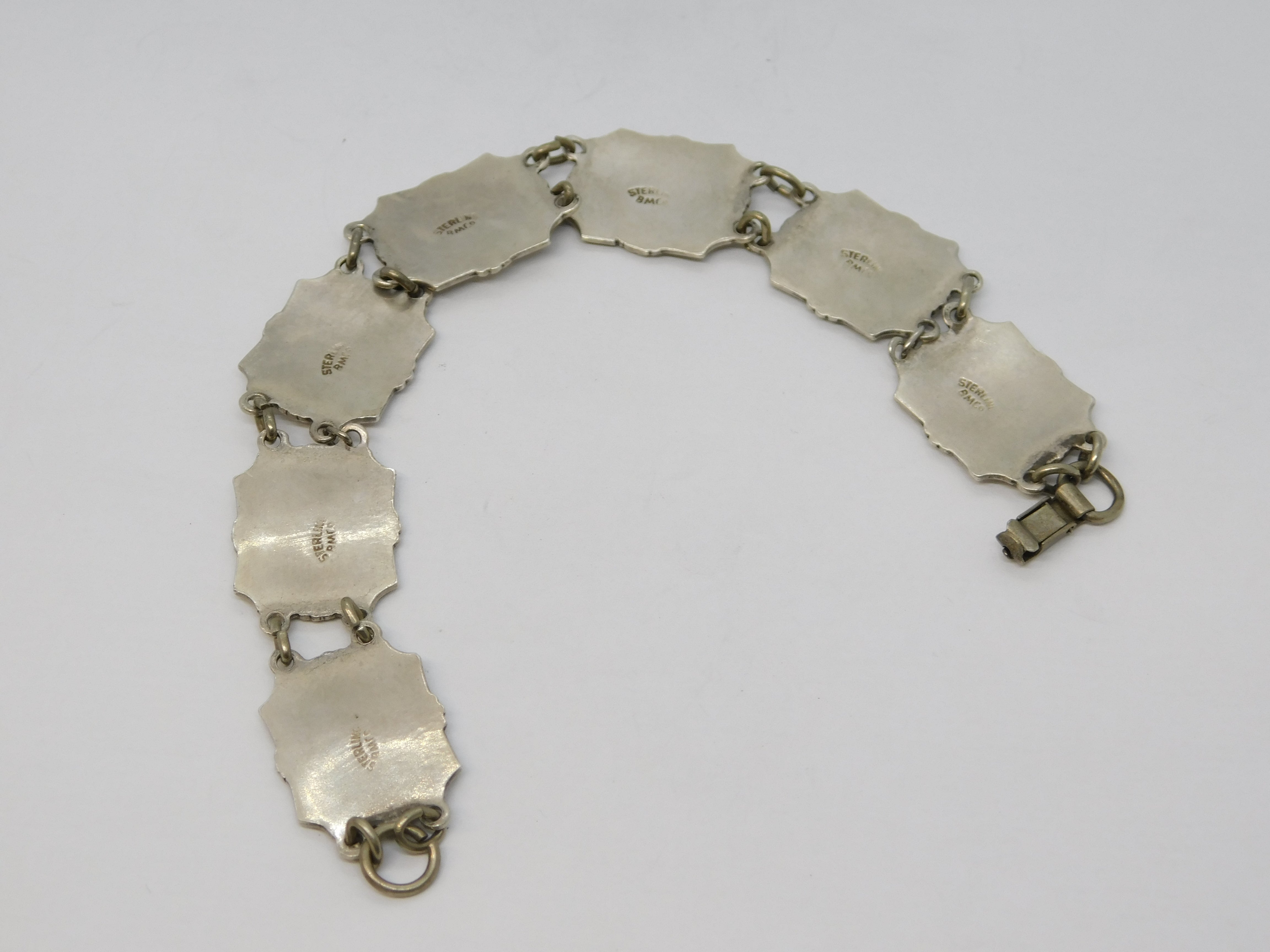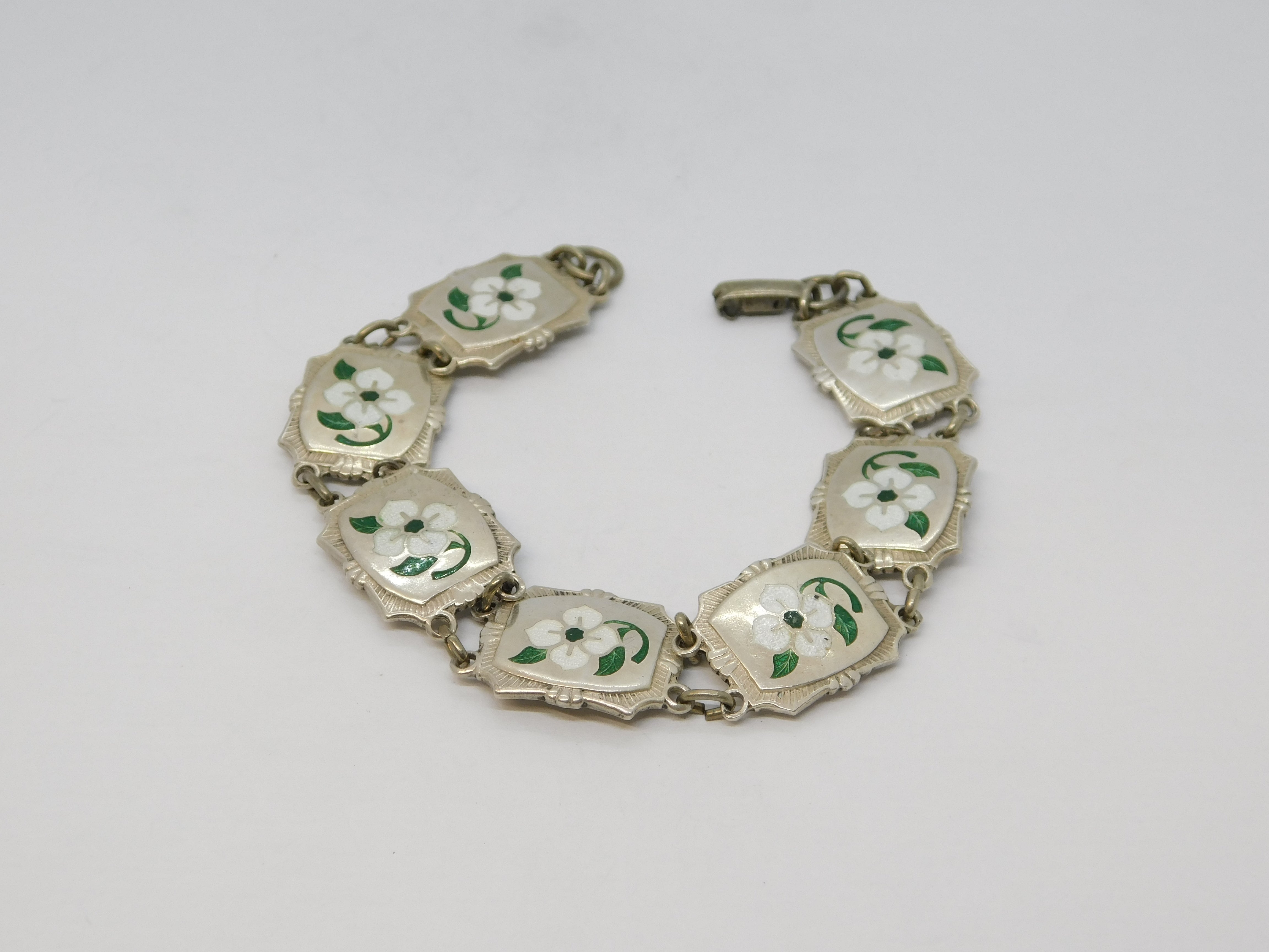 Details: A fantastic and wonderfully designed antique art deco sterling silver & guilloche enamel white flower sweetheart panel bracelet with lovely detailing hallmarked to the reverse of each panel c1920. This is a wonderful item that would make a perfect gift or addition to any collection.