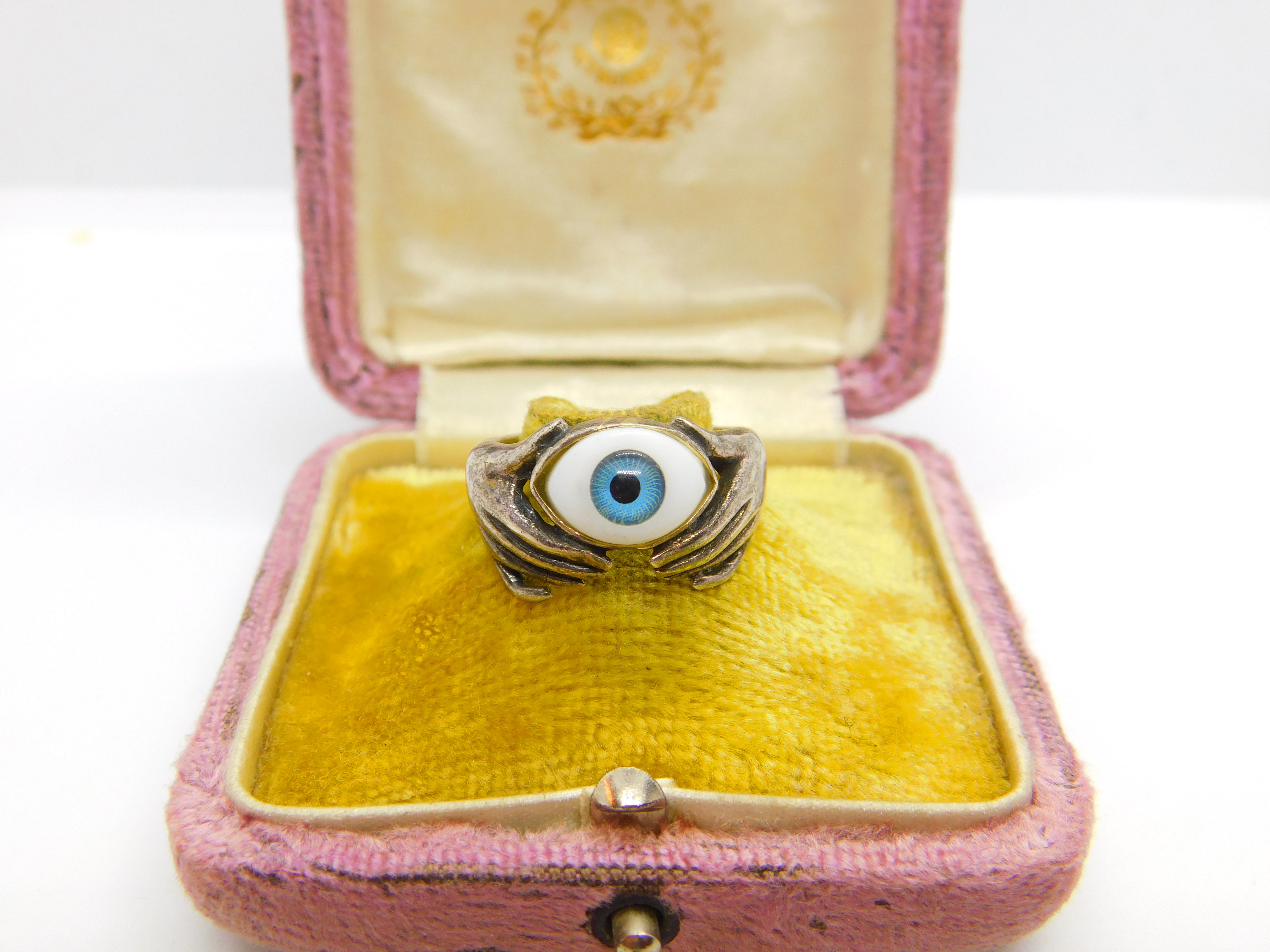 Details: A fantastic and wonderfully designed vintage sterling silver hands holding the All Seeing Eye ring with lovely detailing hallmarked to the interior c1970. This is a wonderful item that would make a perfect gift or addition to any collection. The BOX pictured is for PRESENTATION ONLY and is NOT included in the listings but used to frame the pictures unless specifically stated otherwise.