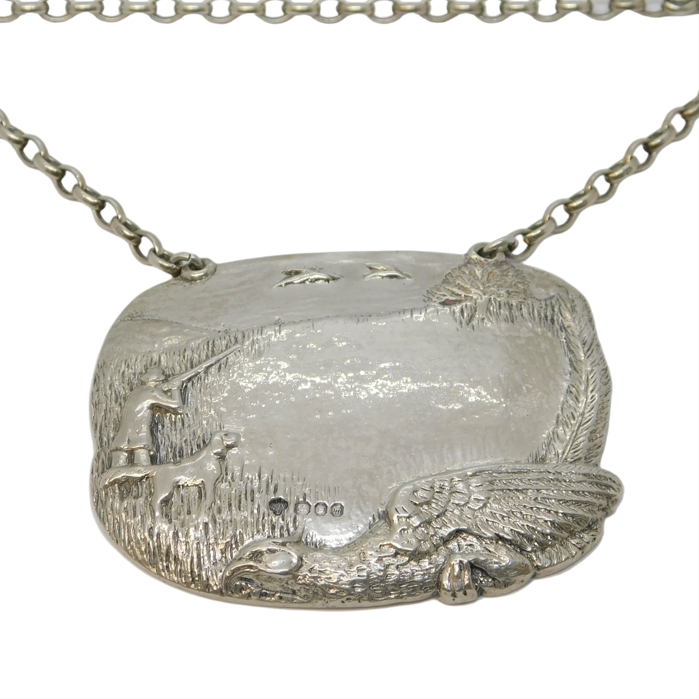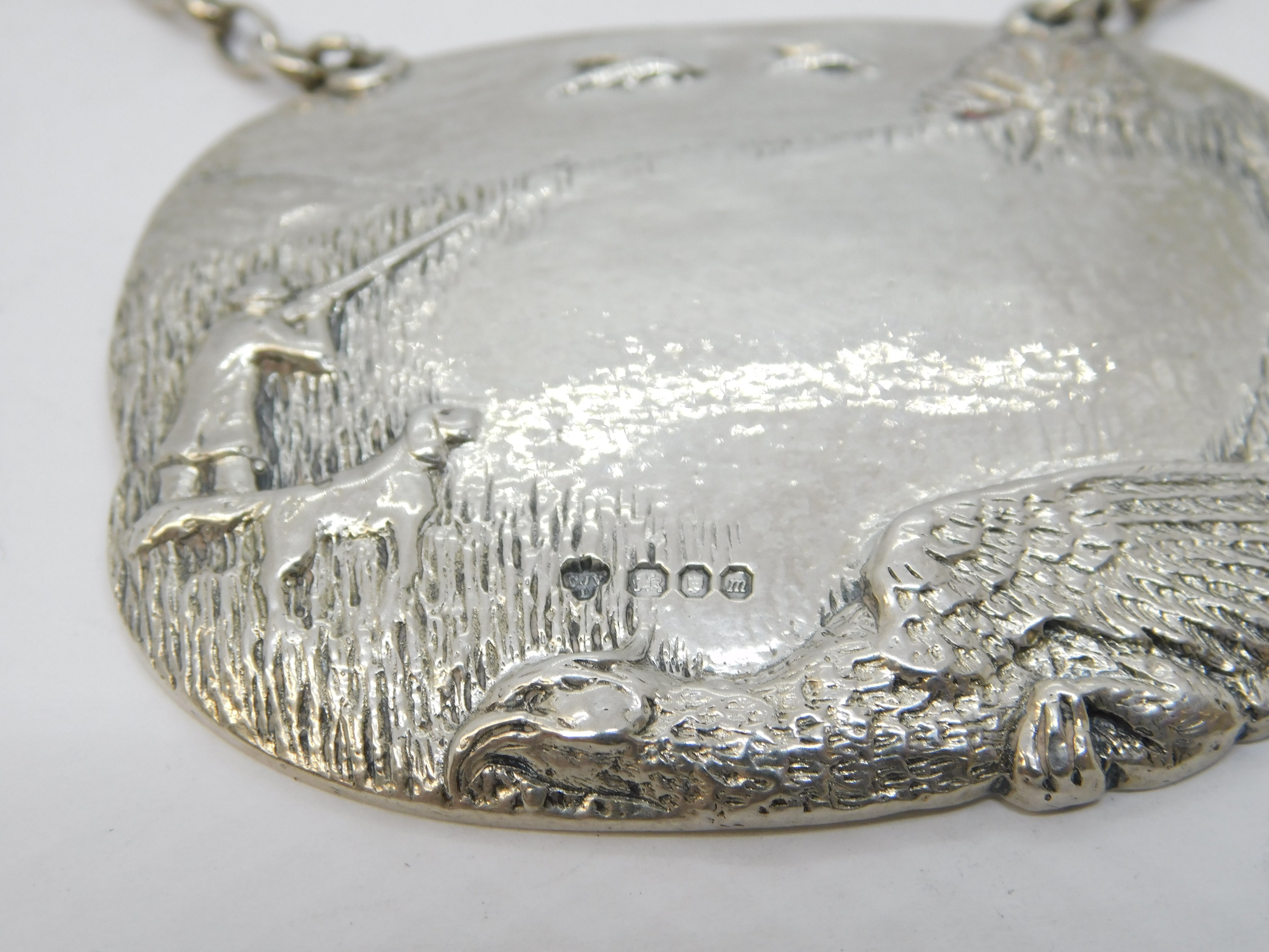 Details: A fantastic and wonderfully designed large vintage heavy cast sterling silver hunting or shooting interest decanter label with super detailing hallmarked London 1967 by CJ Vander for Dunhill. This is a wonderful item that would make a perfect gift or addition to any collection.