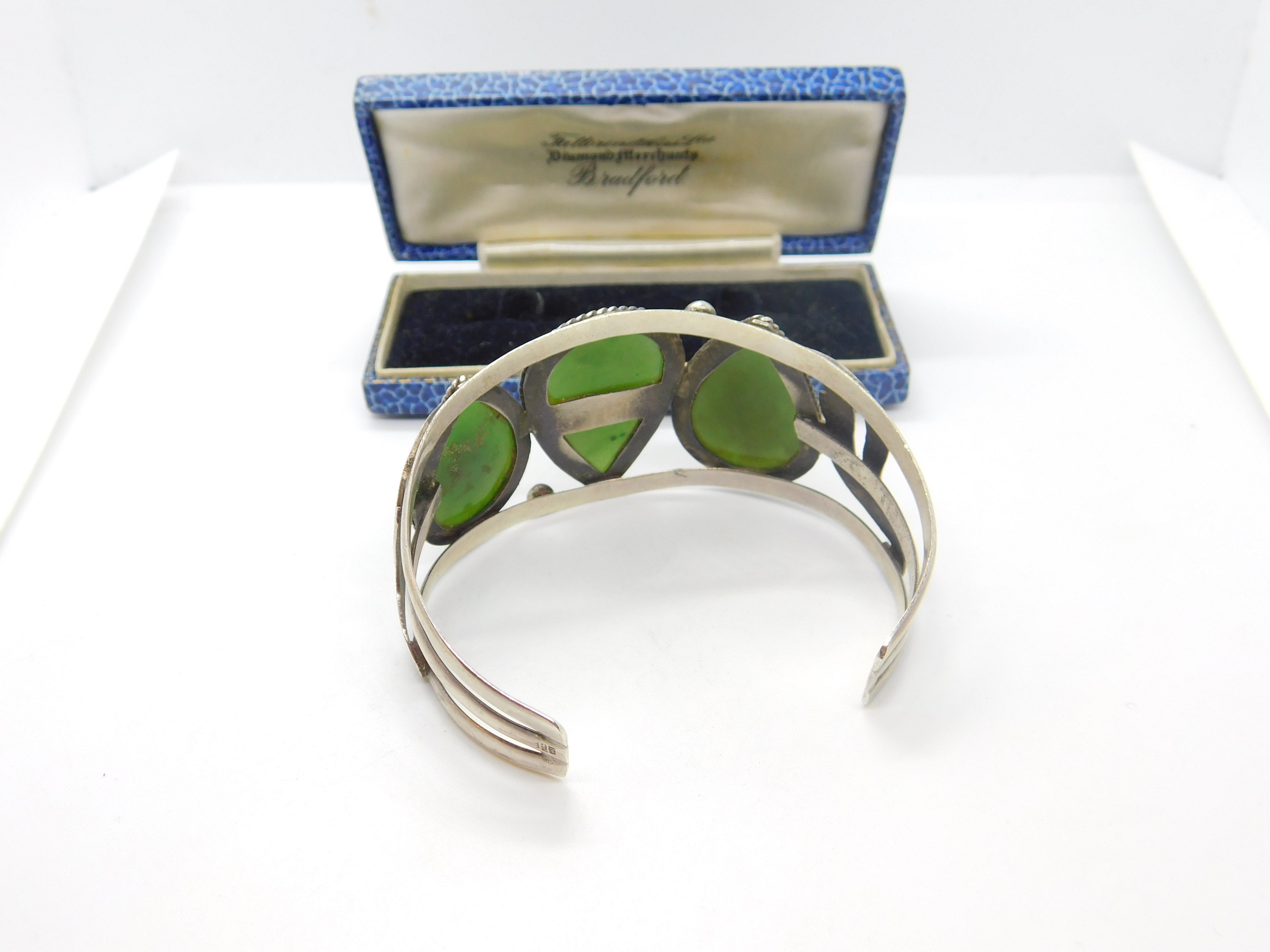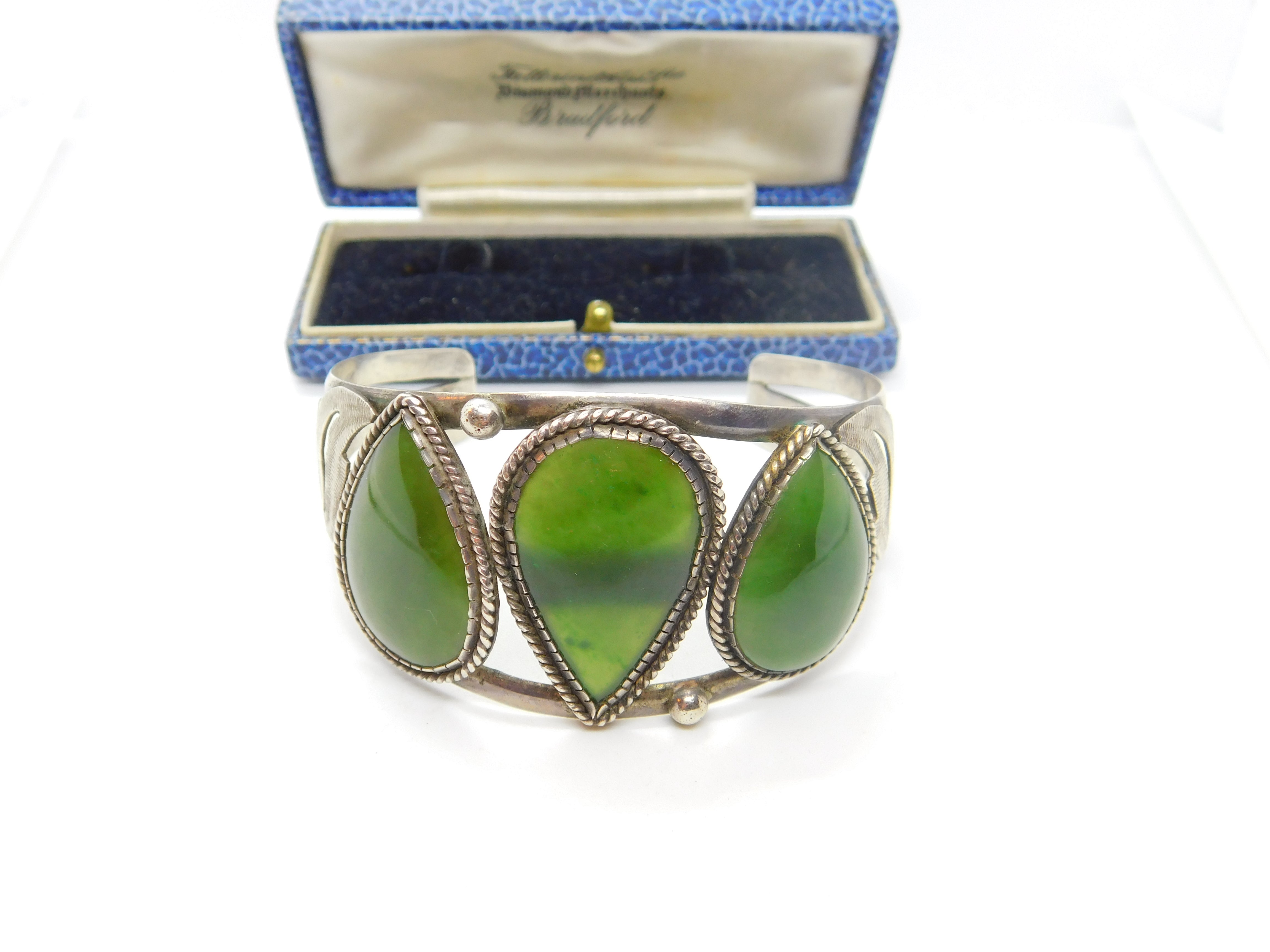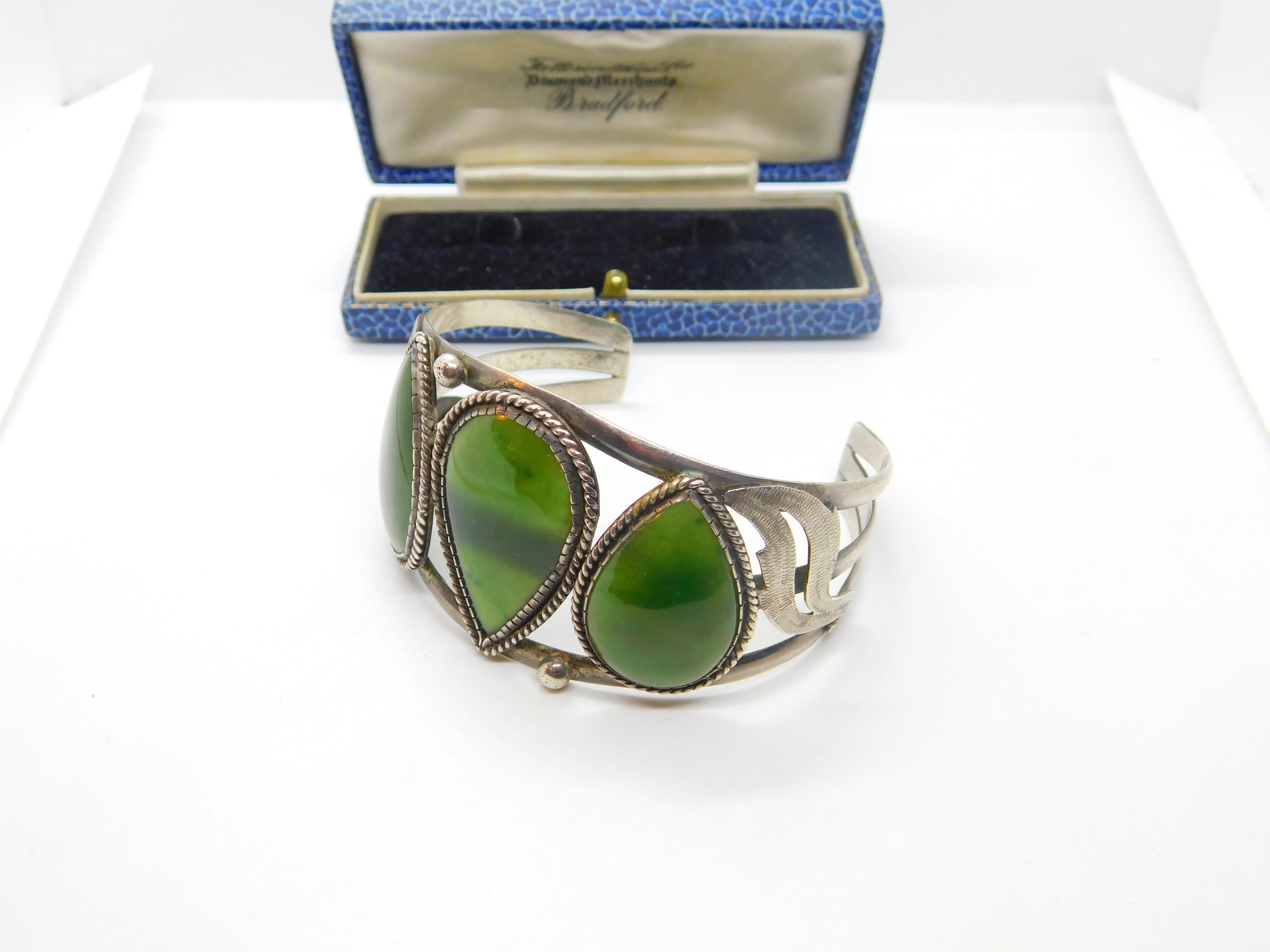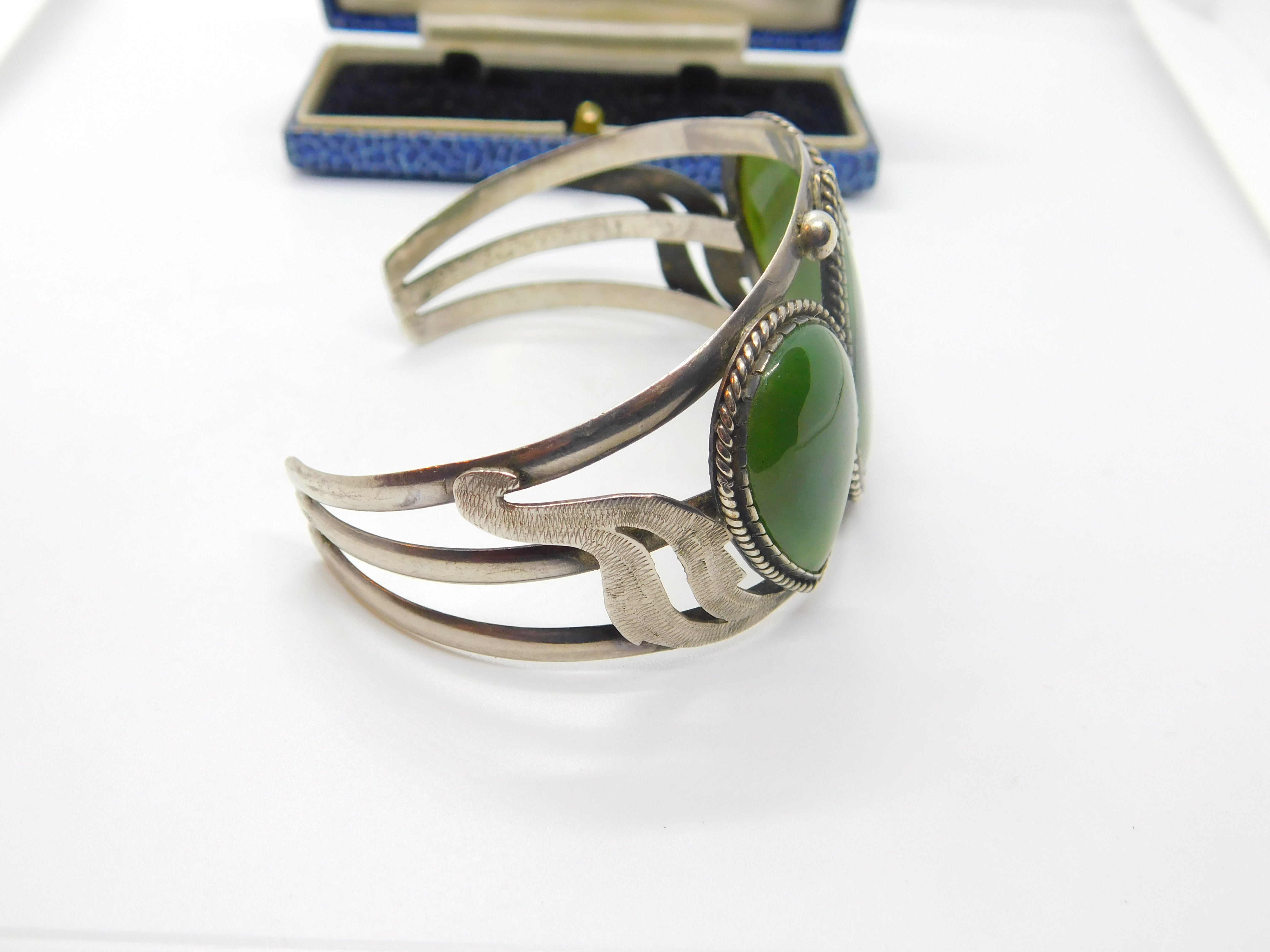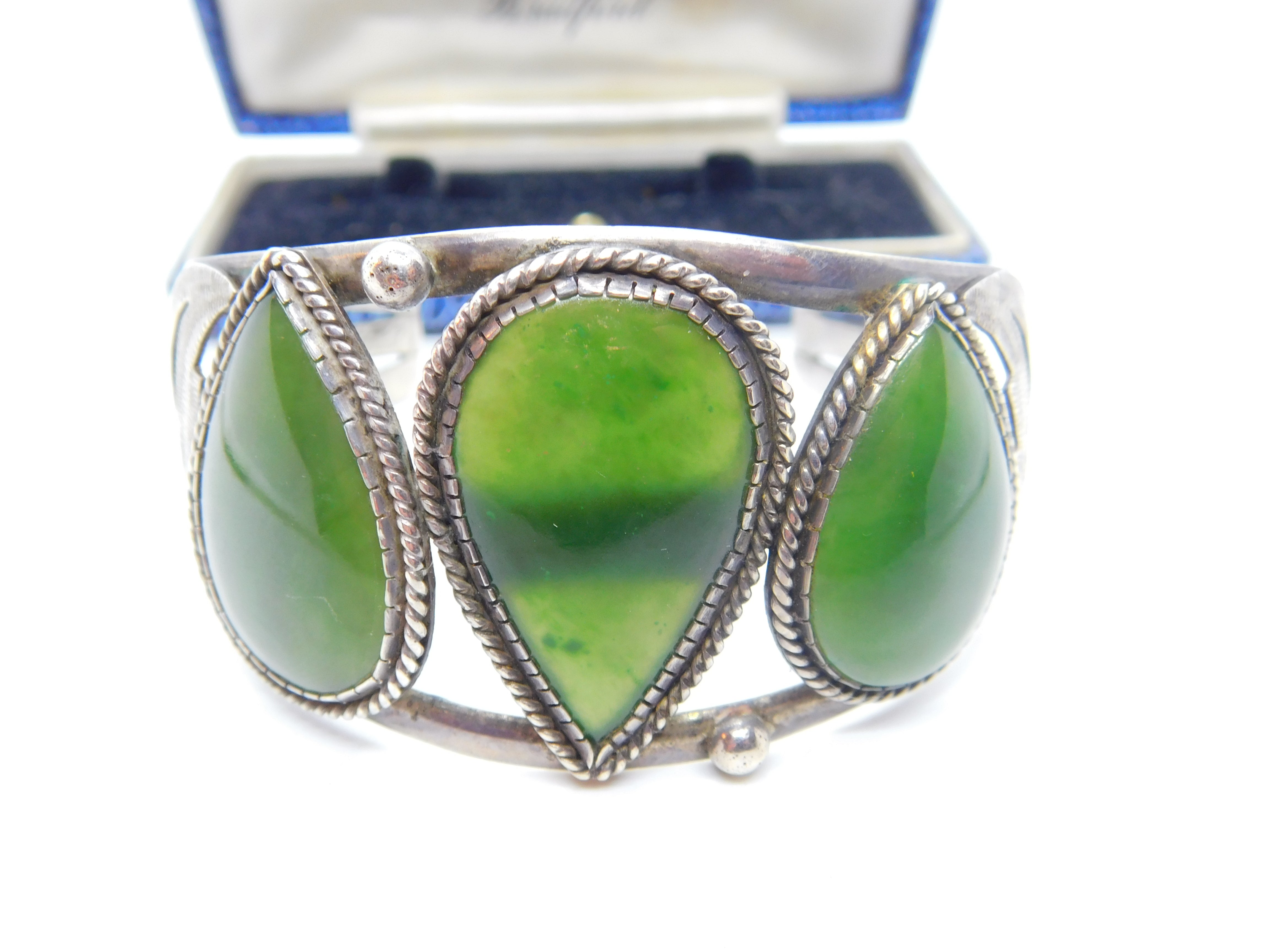 Details: A fantastic and wonderfully designed antique art deco sterling silver large cuff bangle set with nephrite jade panel c1920 - the silver has been XRF tested. This is a wonderful item that would make a perfect gift or addition to any collection. The BOX pictured is for PRESENTATION ONLY and is NOT included in the listings but used to frame the pictures unless specifically stated otherwise.
