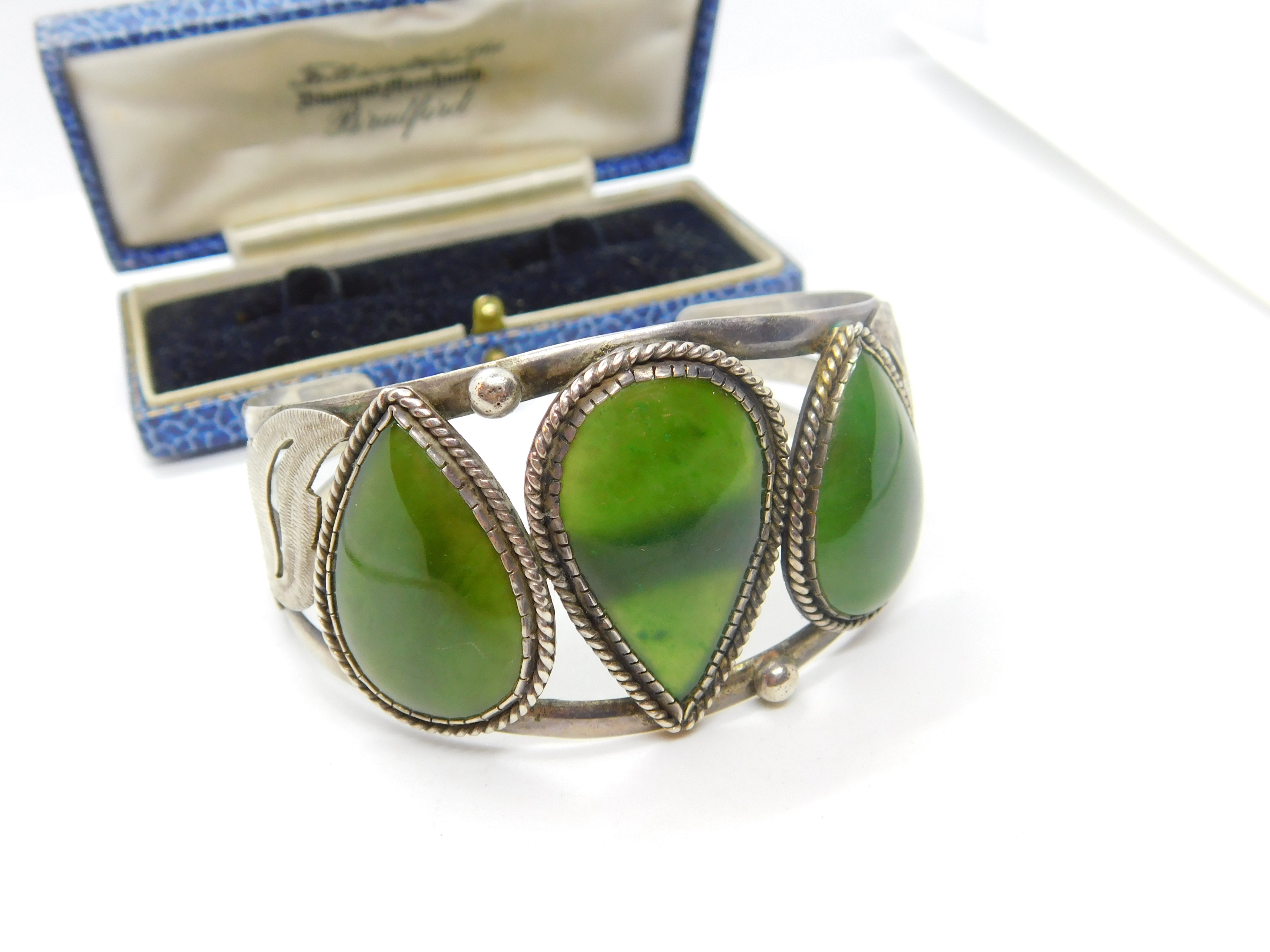 Sterling Silver & Large Nephrite Jade Panel Bangle Bracelet Antique c1920