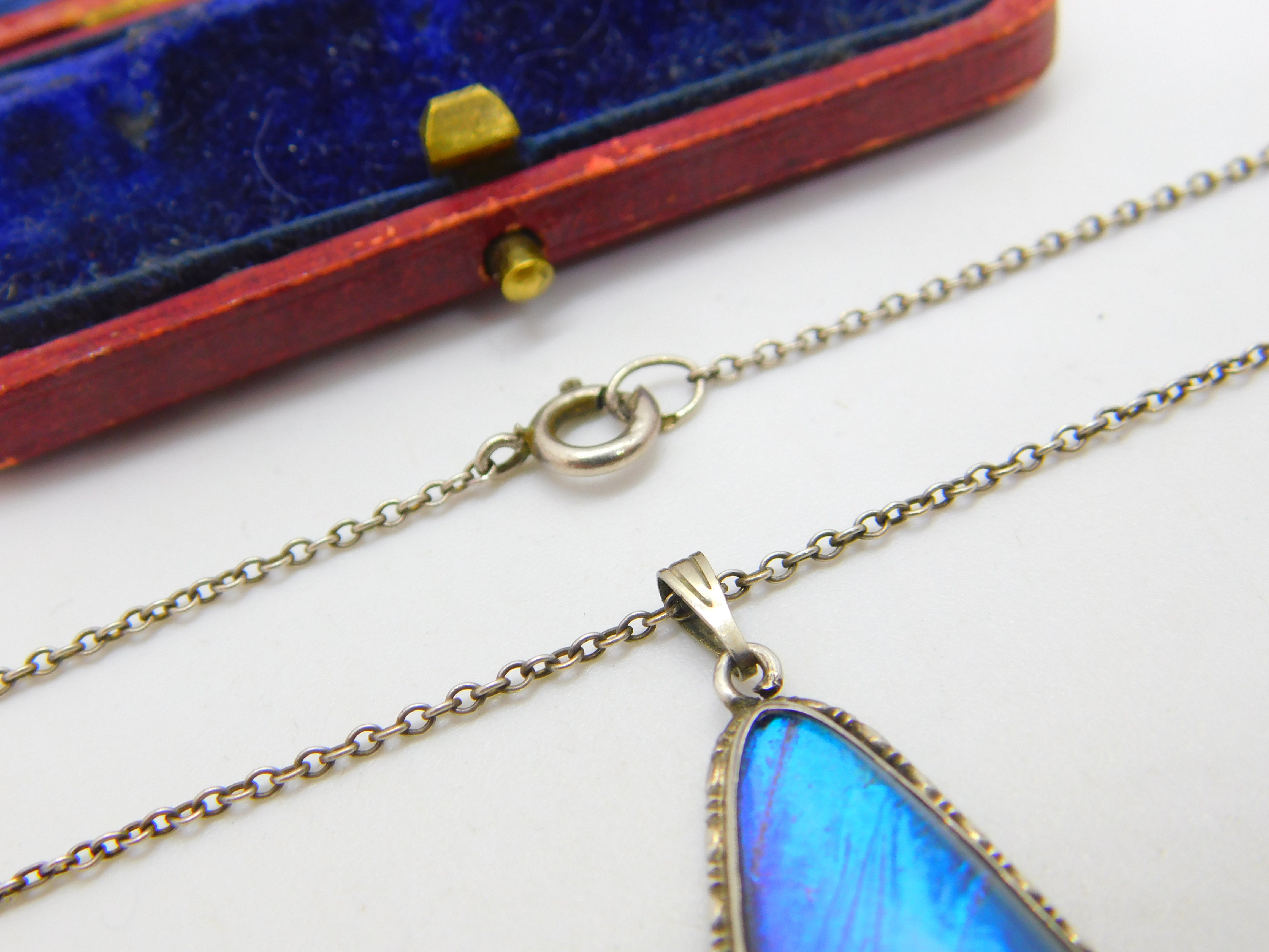 Sterling Silver Morpho Butterfly Wing Set Upside Down Heart Drop Necklace c1920