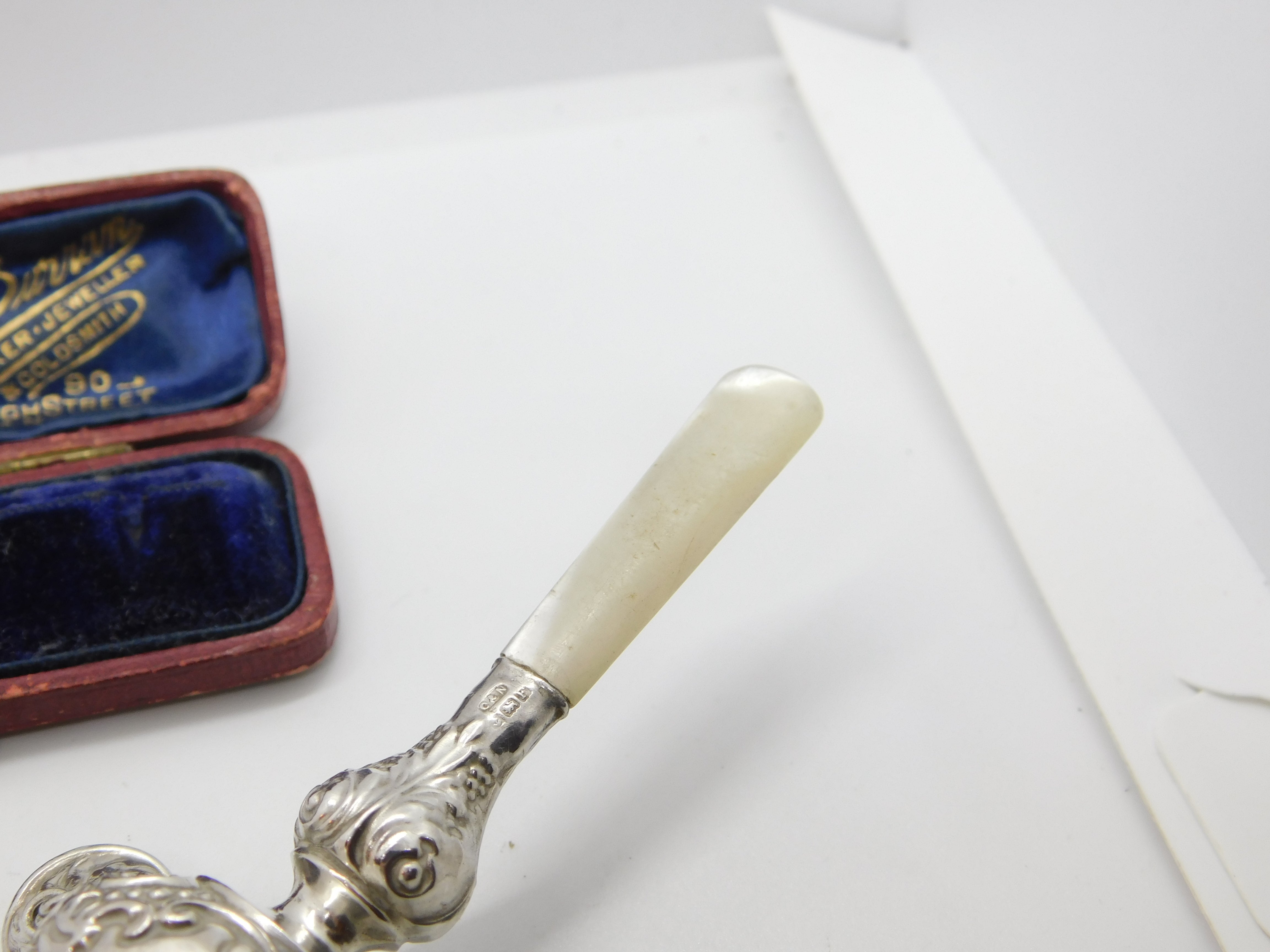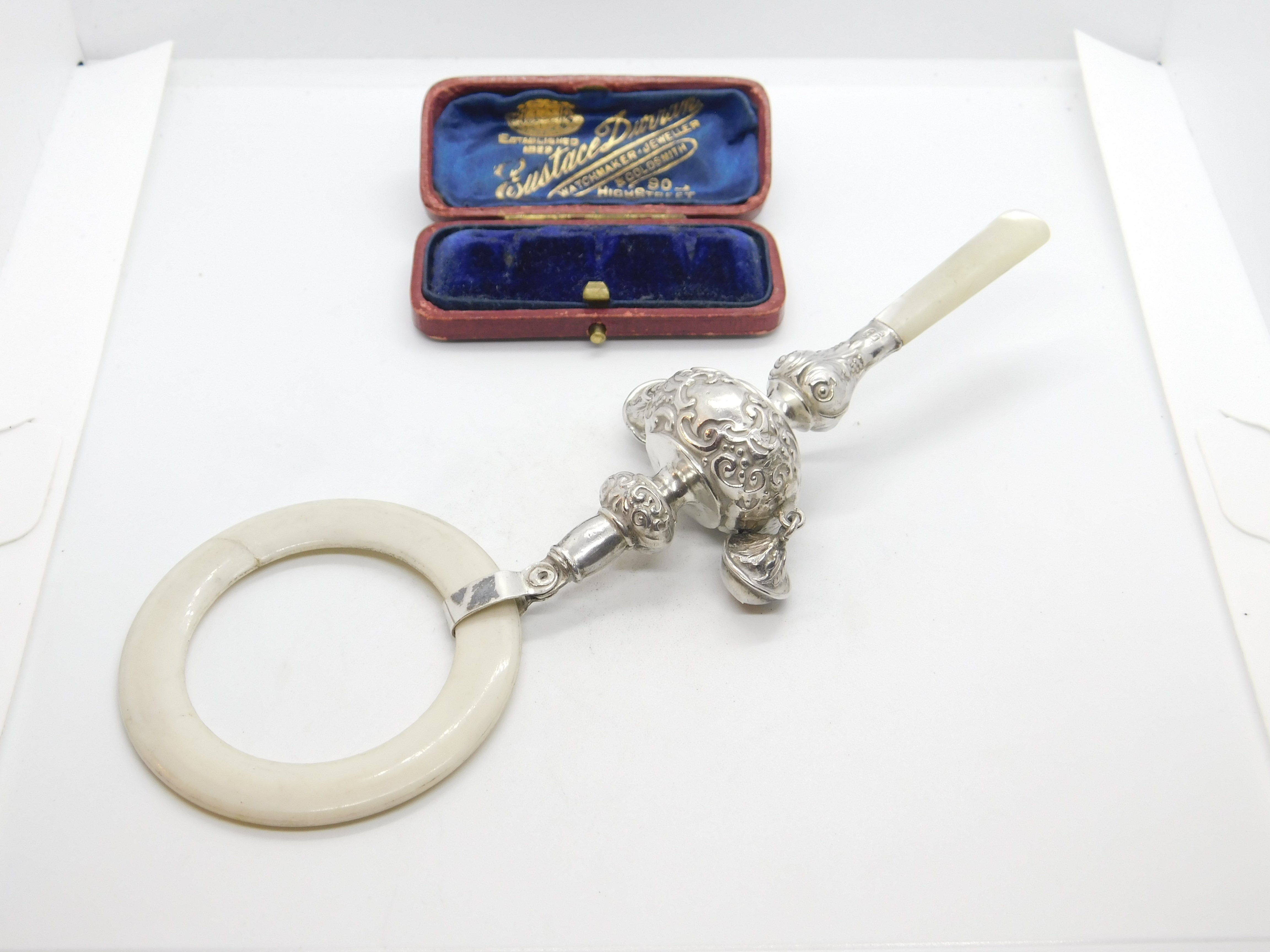 Details: A fantastic and wonderfully designed antique art deco sterling silver, bakelite or celluloid & mother of pearl handled baby rattle and teether hallmarked Birmingham 1930 by Crisford & Norris. This is a wonderful item that would make a perfect gift or addition to any collection. The BOX pictured is for PRESENTATION ONLY and is NOT included in the listings but used to frame the pictures unless specifically stated otherwise.