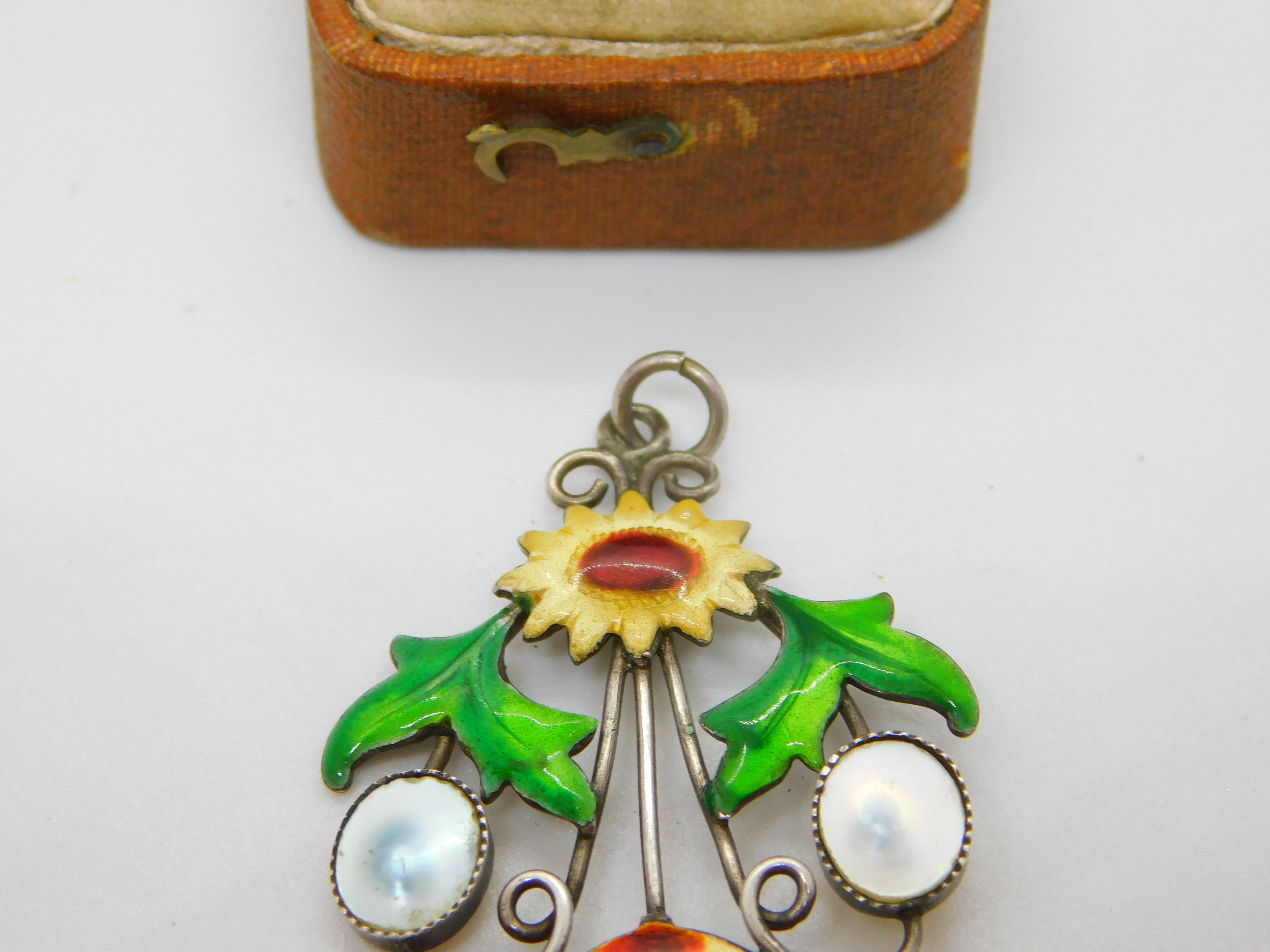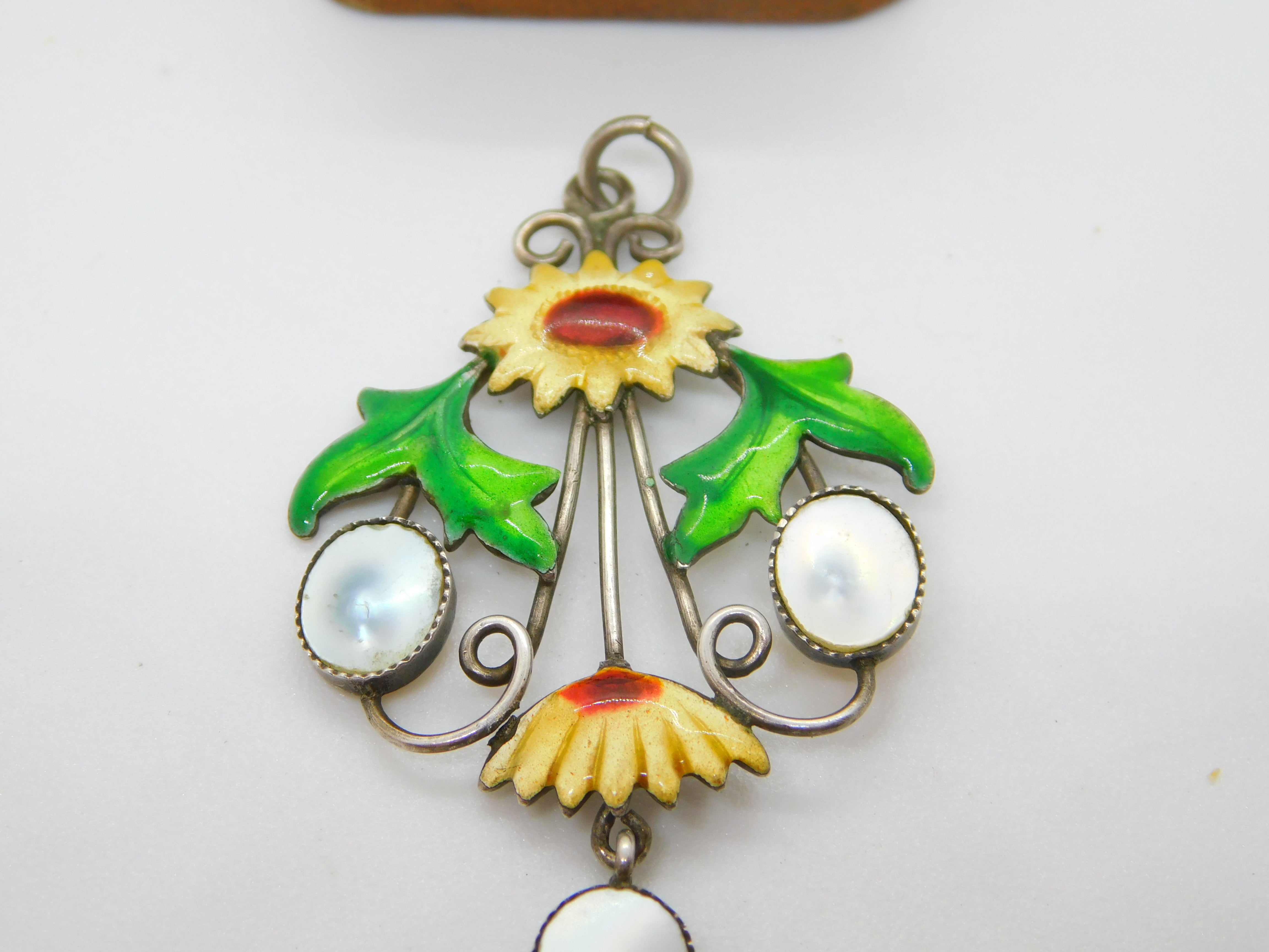 Details: A fantastic and wonderfully designed antique art deco sterling silver lavalier drop pendant adorned with superb enamel and mother of pearl depciting sunflowers c1920, the silver has been XRF tested, ename in good condition. This is a wonderful item that would make a perfect gift or addition to any collection. The BOX pictured is for PRESENTATION ONLY and is NOT included in the listings but used to frame the pictures unless specifically stated otherwise.