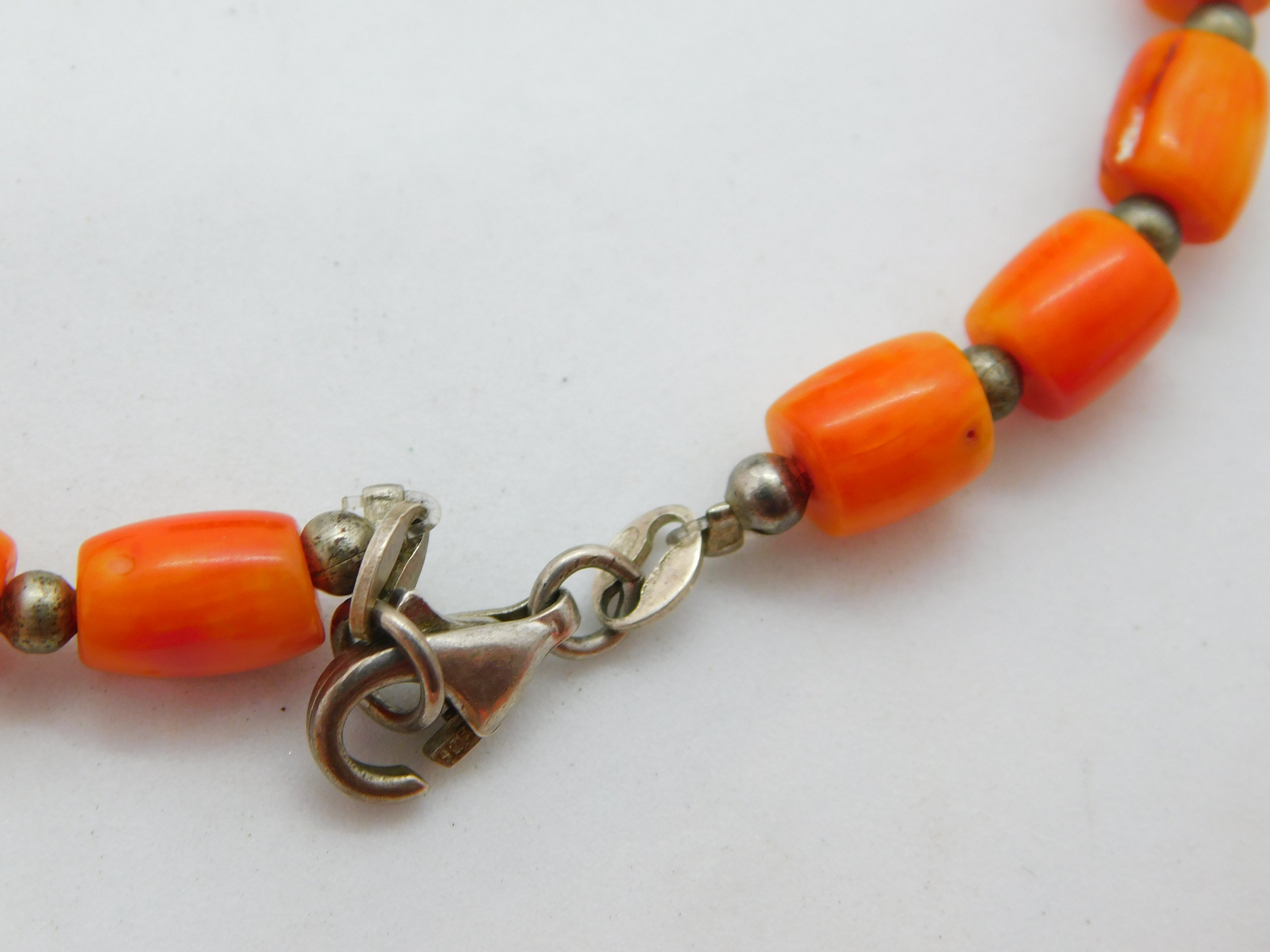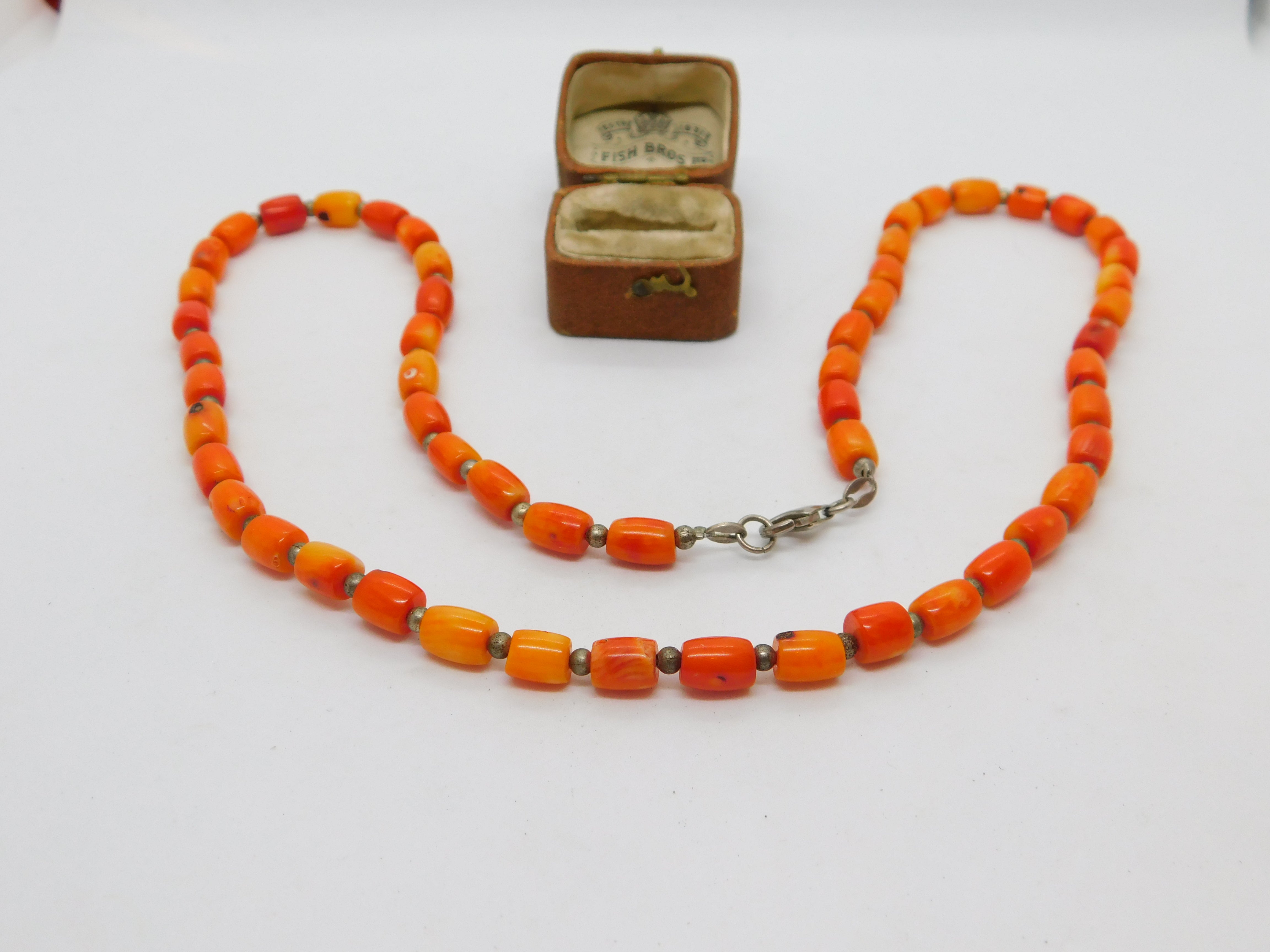 Sterling Silver & Natural Carved Red Coral Bead Necklace Antique c1930 58cm