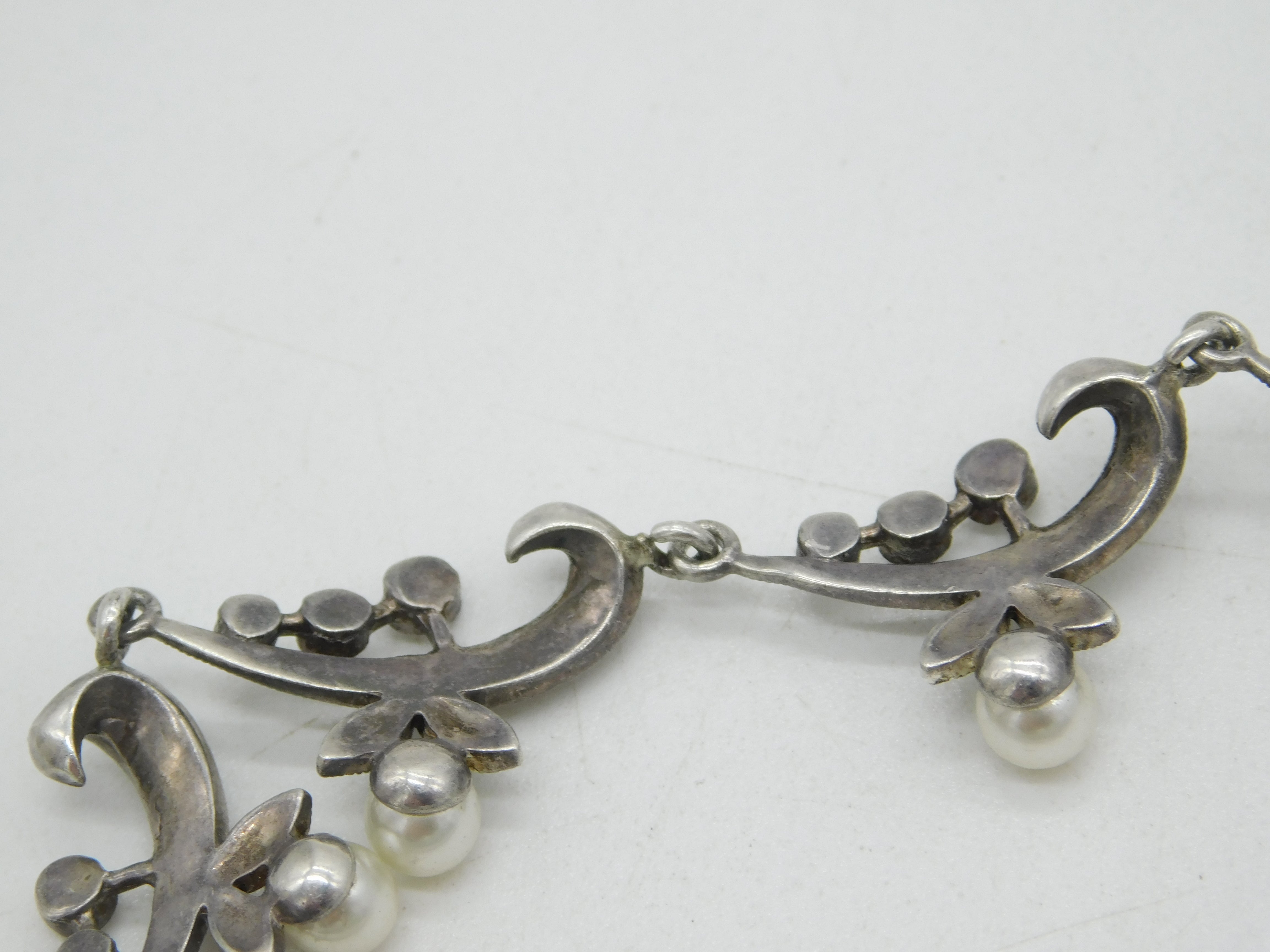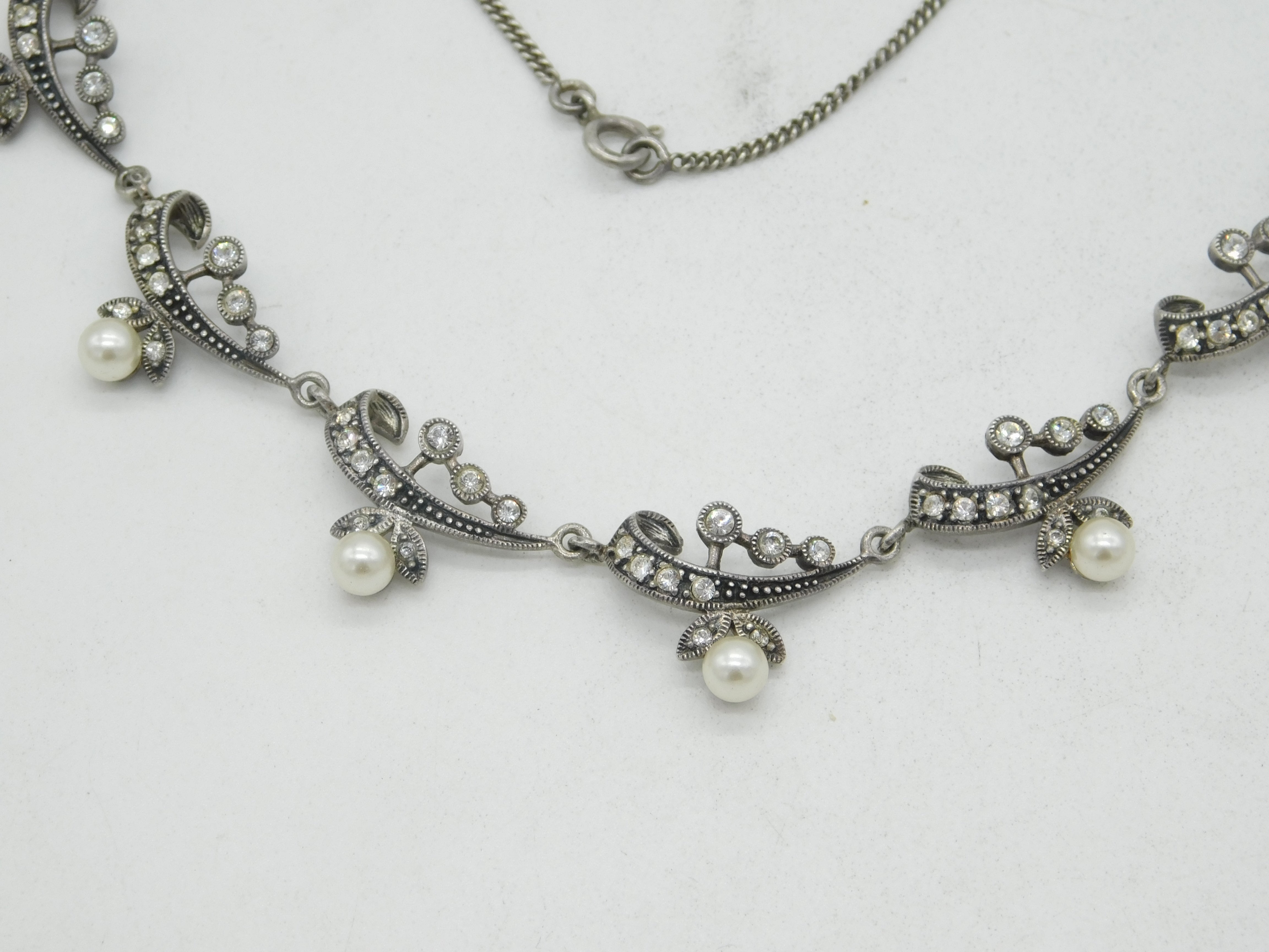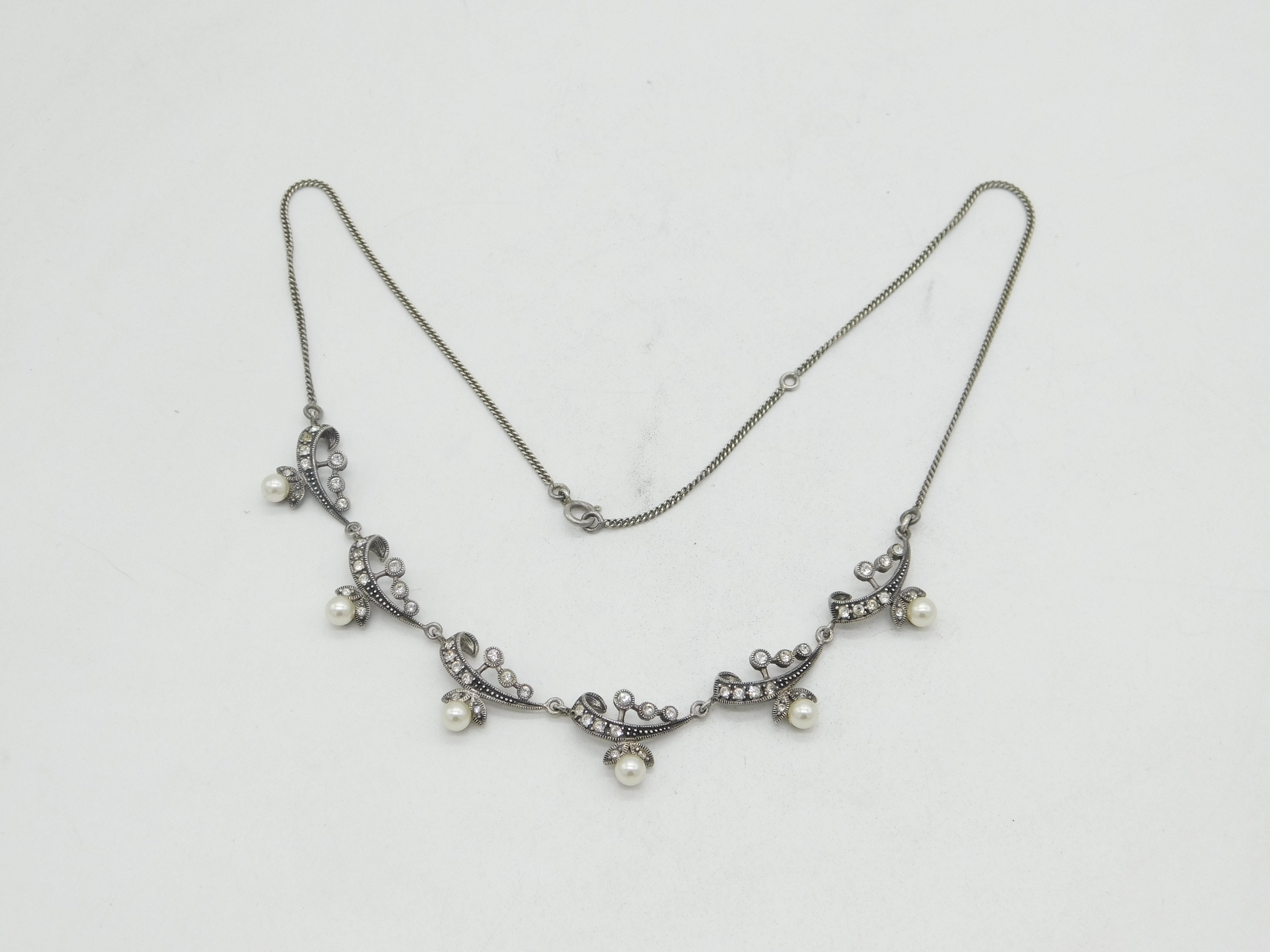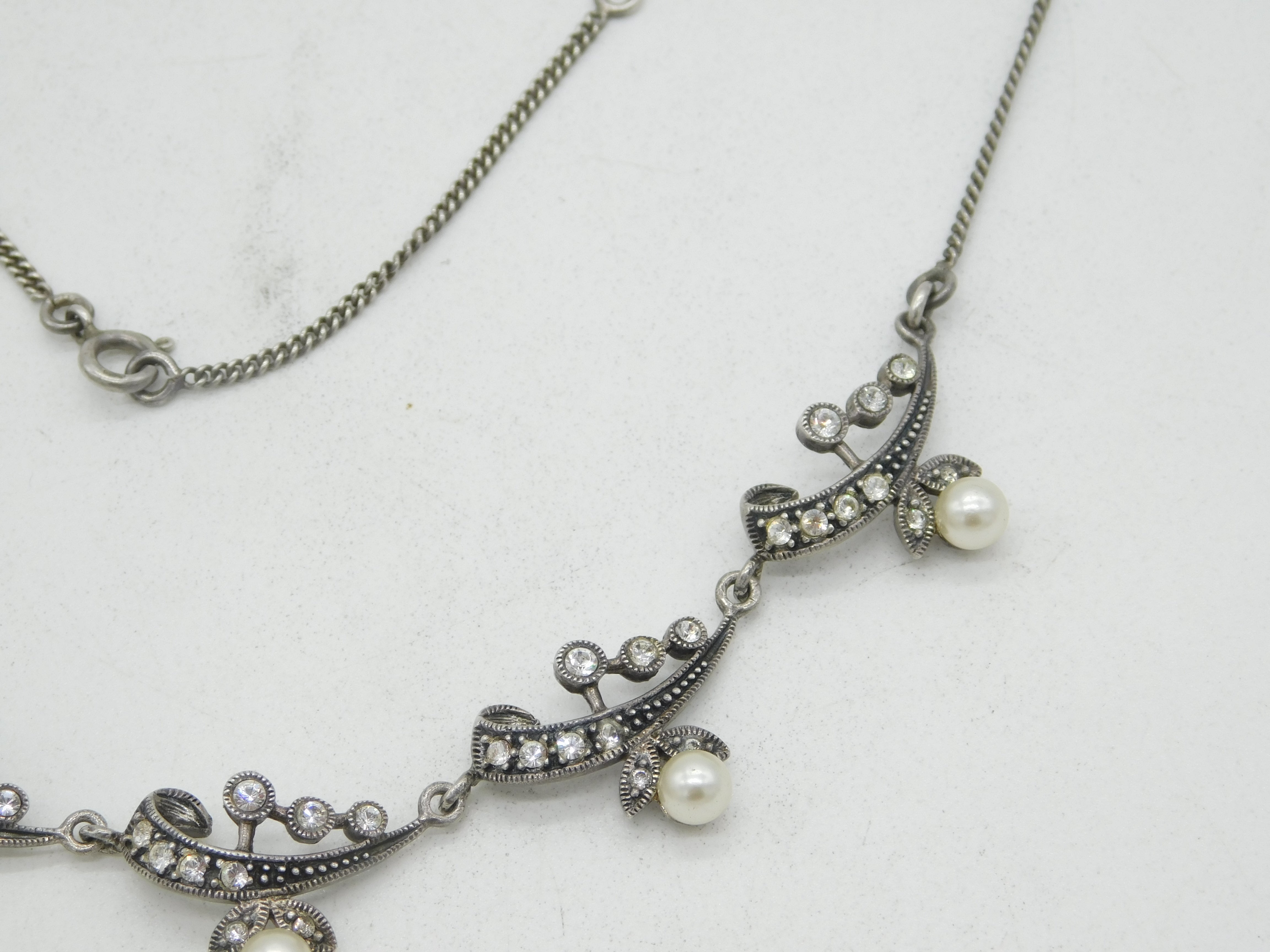 Sterling Silver, Paste & Pearl Set Floral Spray Necklace Antique c1930 Art Deco