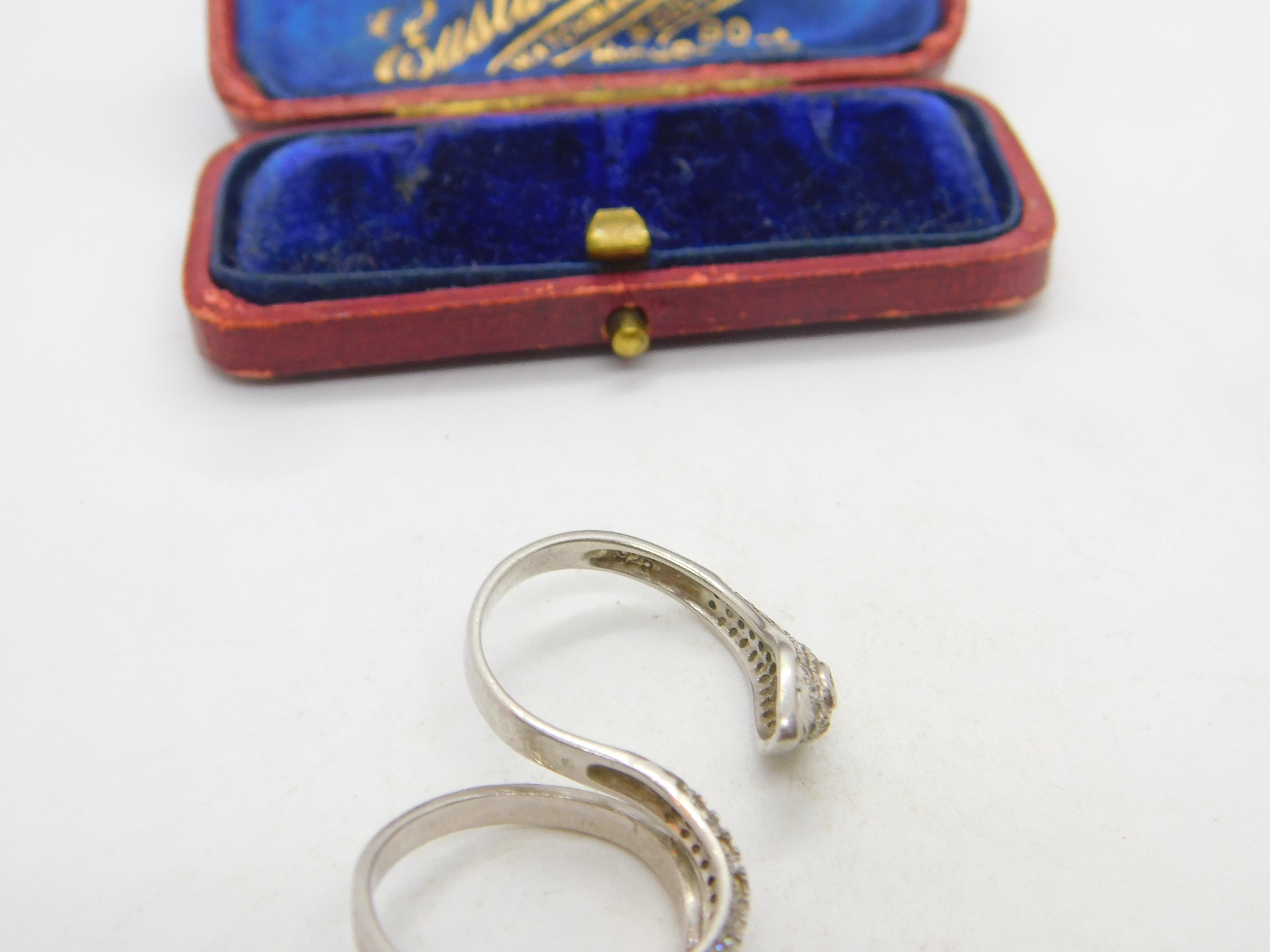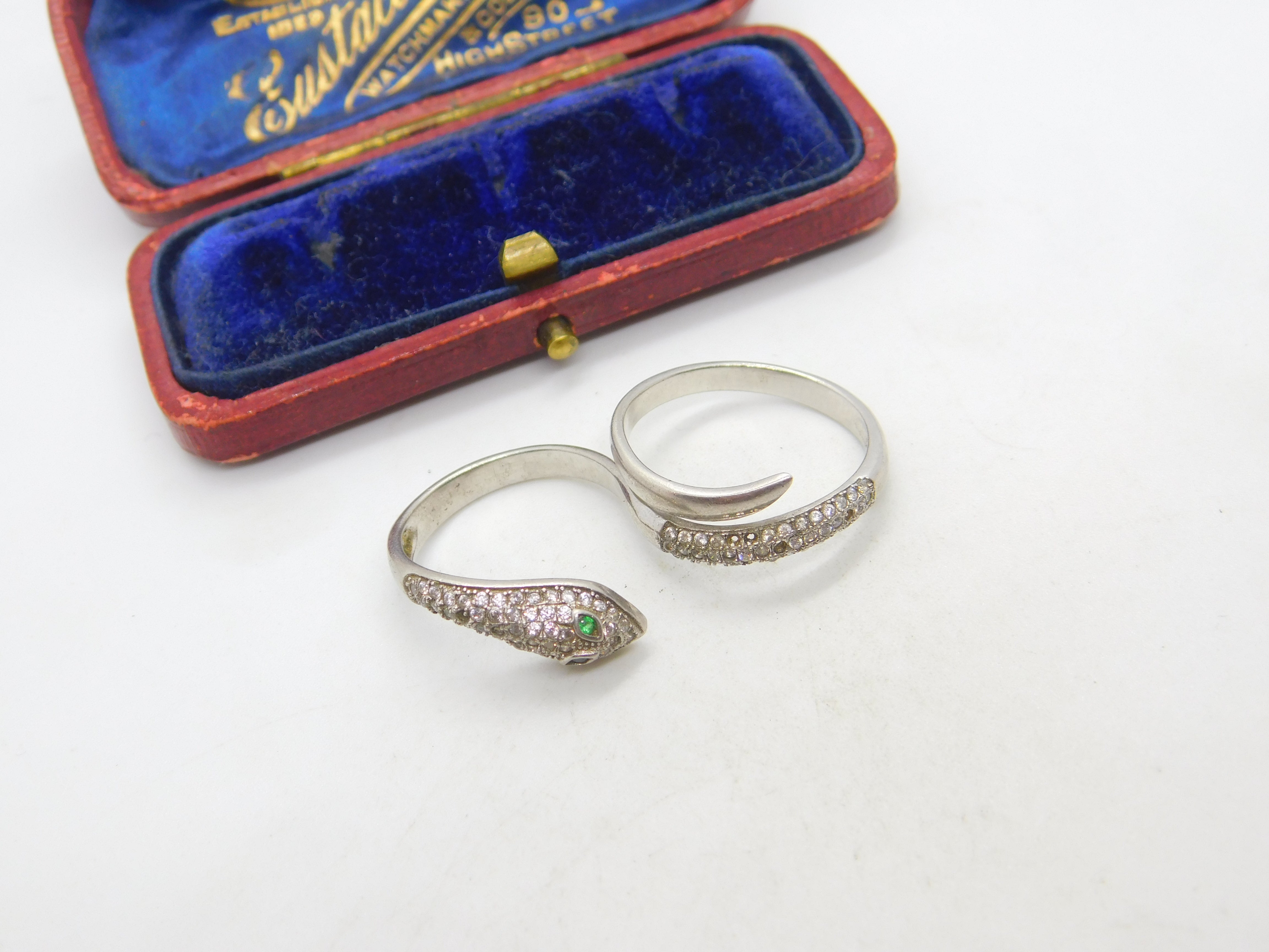 Details: A fantastic and wonderfully designed vintage sterling silver serpent snake form double finger ring with pave set diamond paste and emerald eyes set throughout hallmarked to the interior c1980. Missing a couple of a stones but a stunning example nonetheless. This is a wonderful item that would make a perfect gift or addition to any collection. The BOX pictured is for PRESENTATION ONLY and is NOT included in the listings but used to frame the pictures unless specifically stated otherwise.