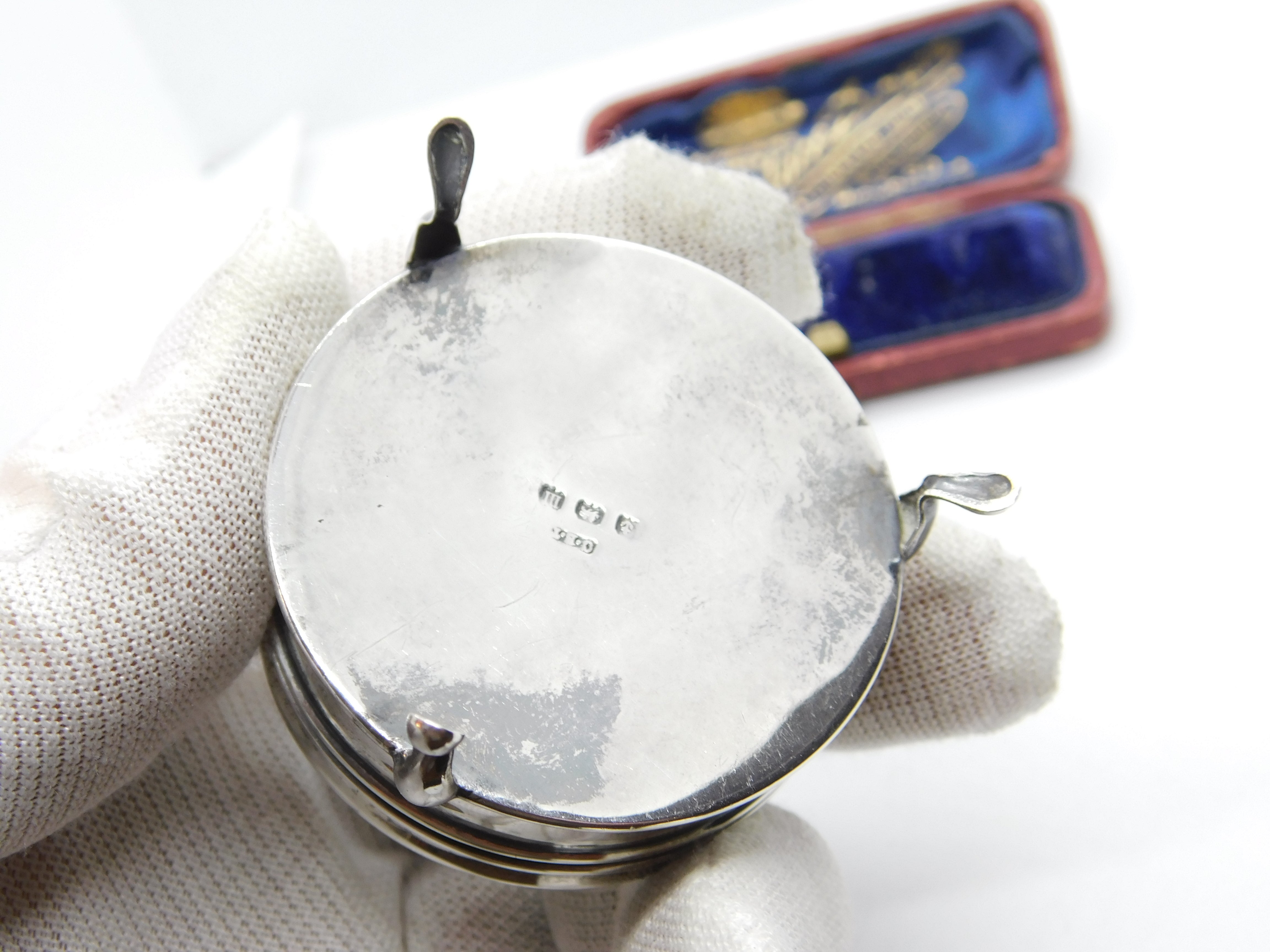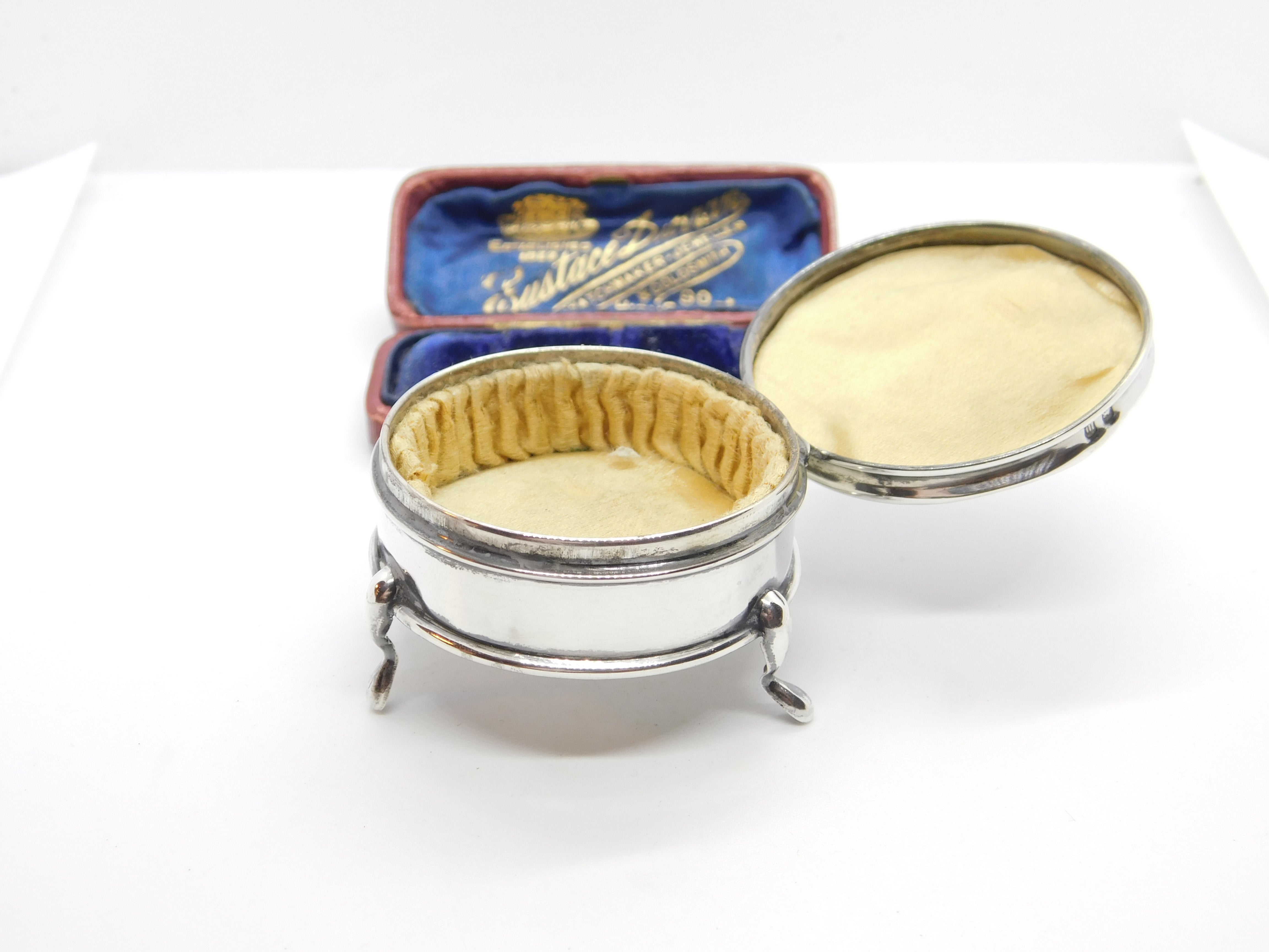 Details: A fantastic and wonderfully designed antique art deco sterling silver circular ring box with lovely feet and lining hallmarked Birmingham 1911 by CB Thomas & Co. This is a wonderful item that would make a perfect gift or addition to any collection. The BOX pictured is for PRESENTATION ONLY and is NOT included in the listings but used to frame the pictures unless specifically stated otherwise.