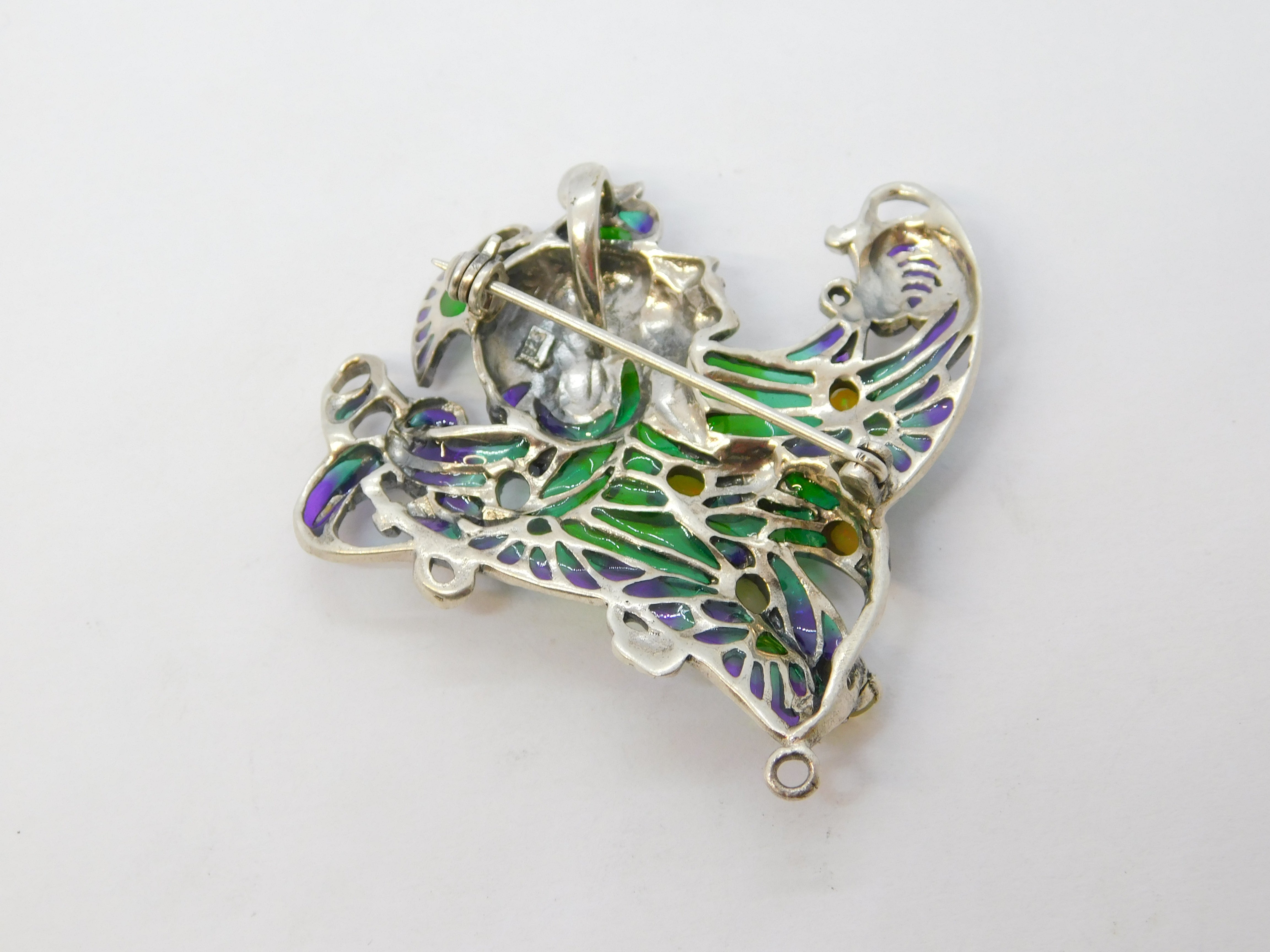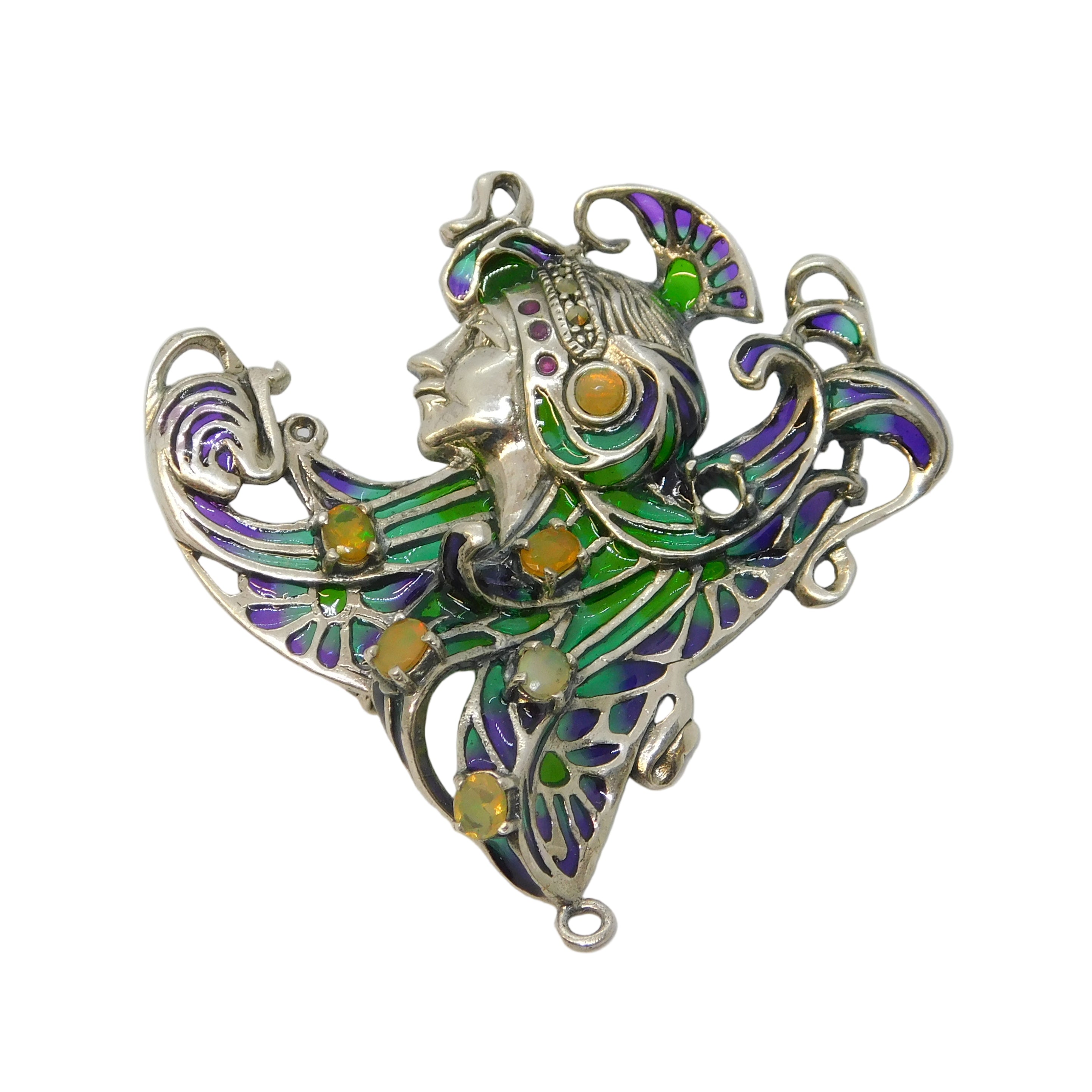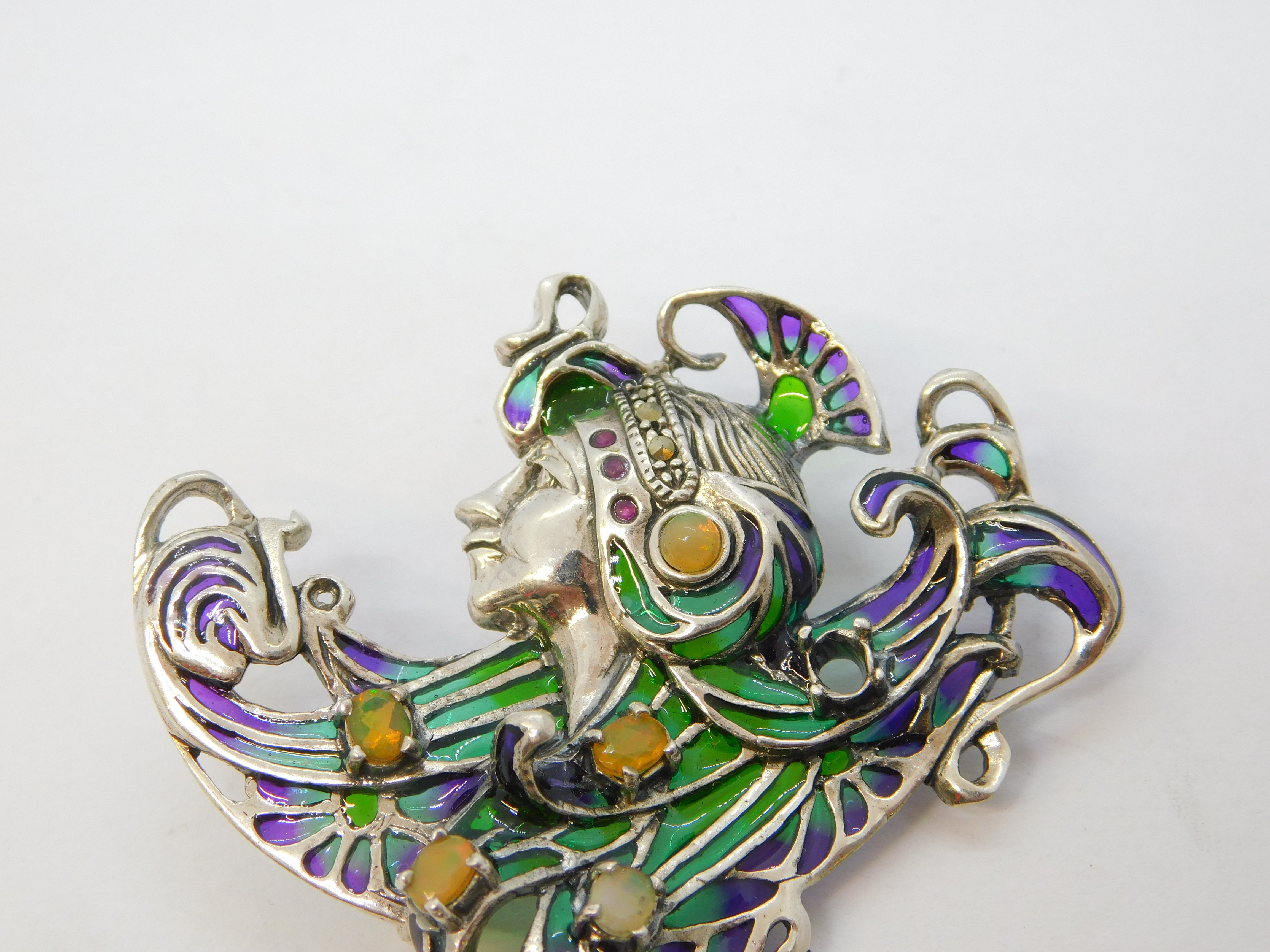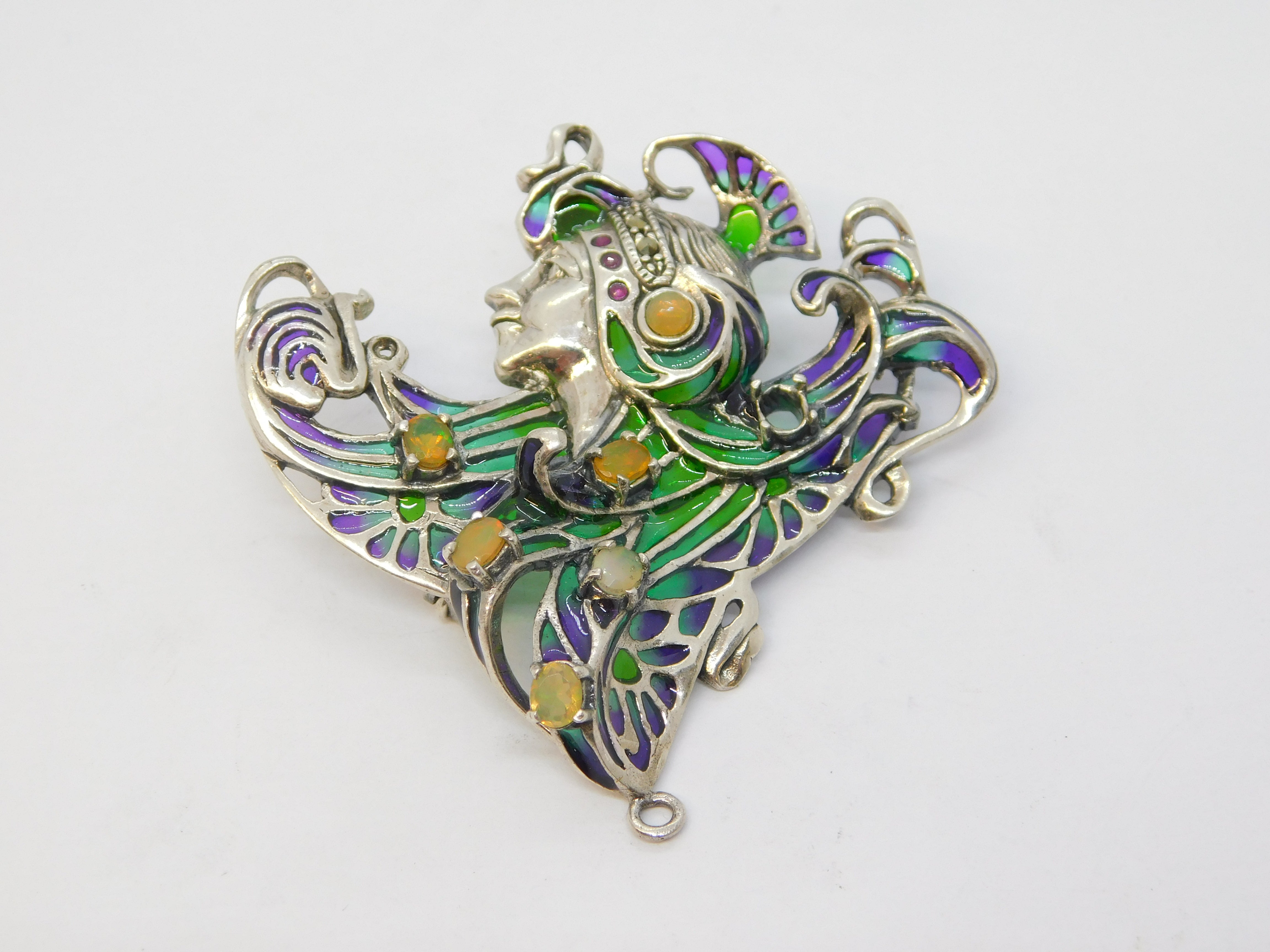 Details: A fantastic and wonderfully designed vintage art nouveau style large sterling silver brooch or pendant in the form of a 1920s lady set with plique-à-jour enamel and ethiopian opals hallmarked to the reverse c1980, missing one opal please note. This is a wonderful item that would make a perfect gift or addition to any collection. We are more than happy to provide XRF reports for items upon request.