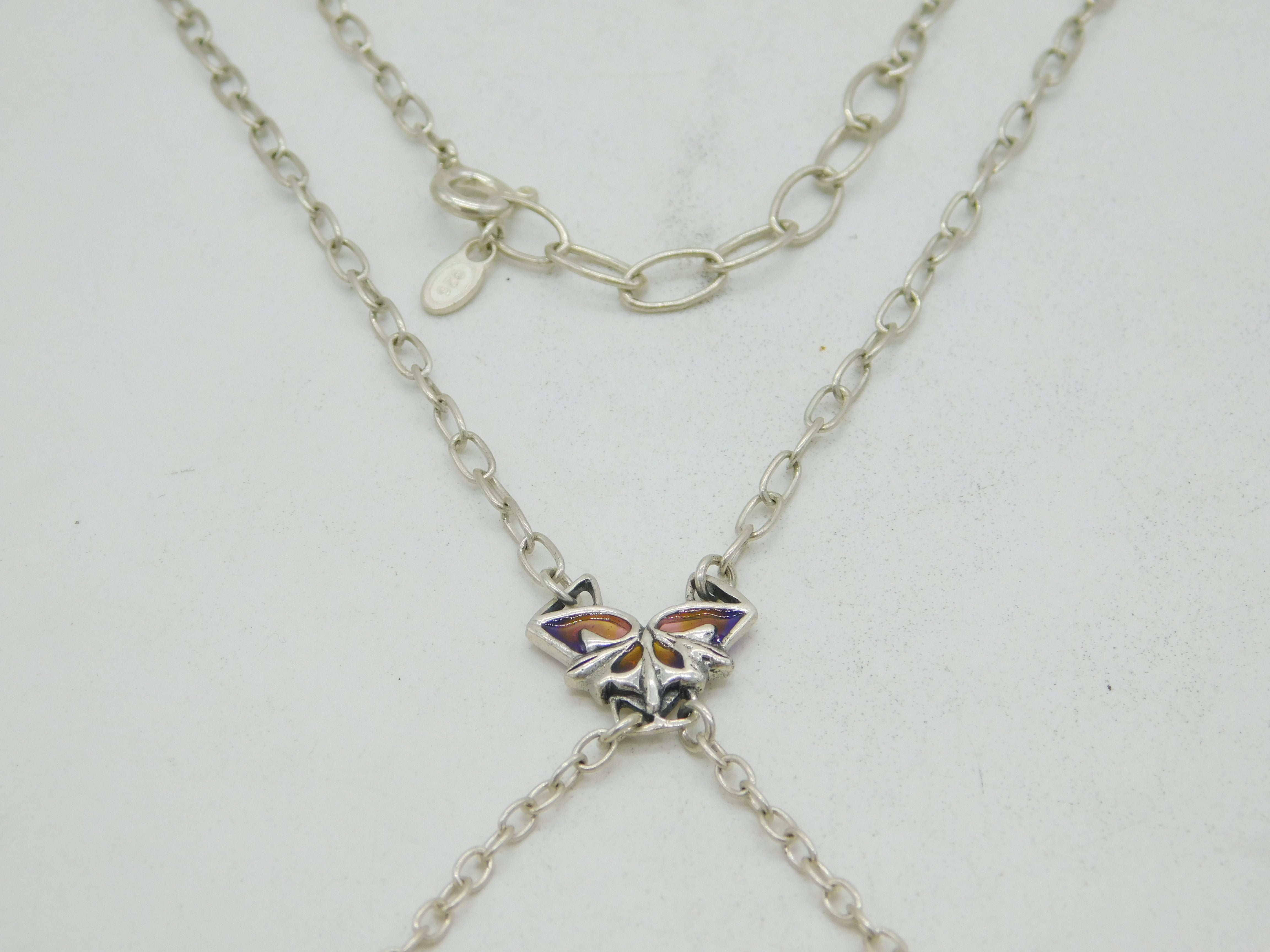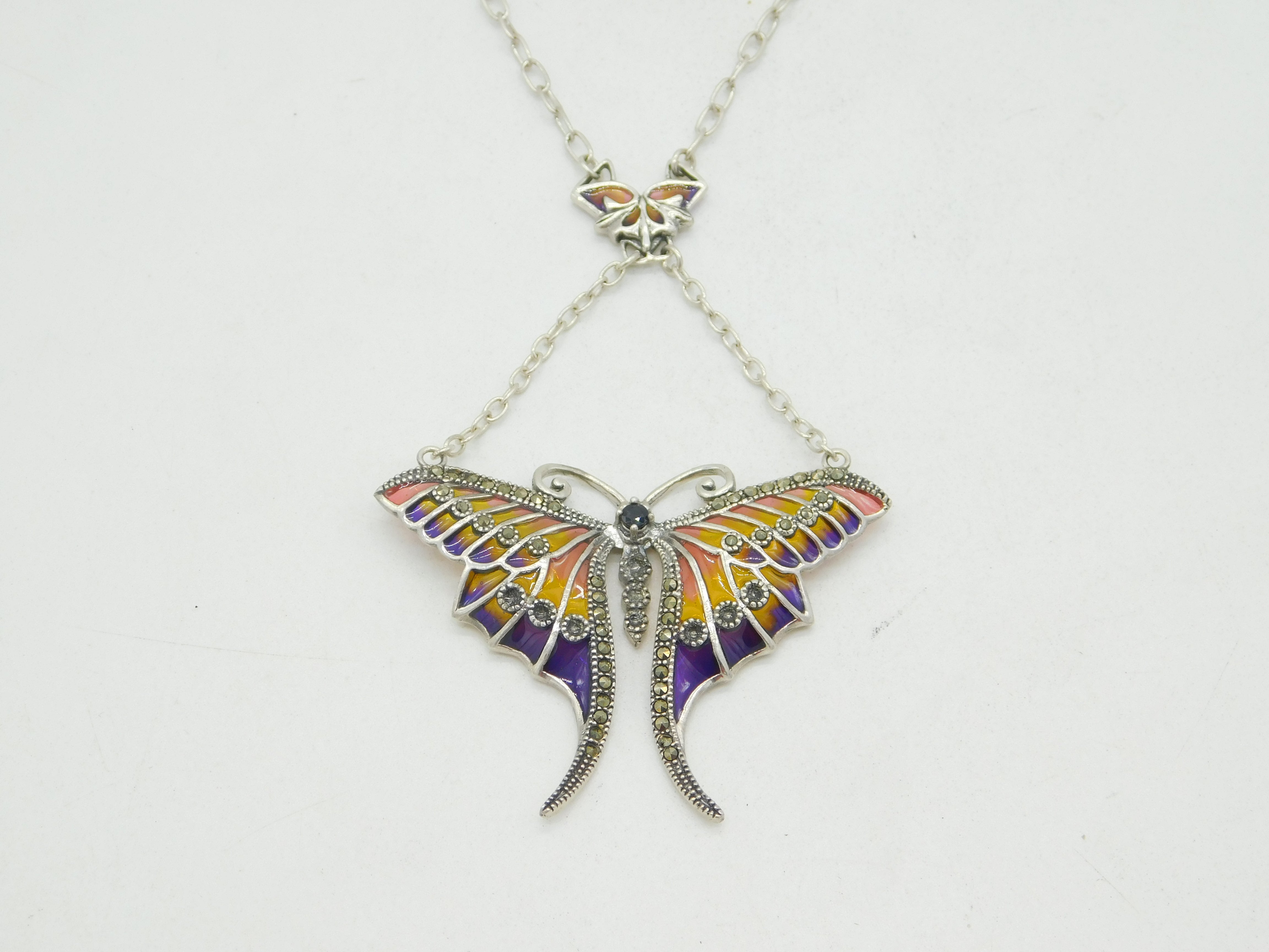 Details: A fantastic and wonderfully designed vintage sterling silver art nouveau style butterfly drop necklace decorated throughout with superb plique-à-jour enamel, marcasite and sapphire hallmarked to the bale c1970. This is a wonderful item that would make a perfect gift or addition to any collection. We are more than happy to provide XRF reports for items upon request.