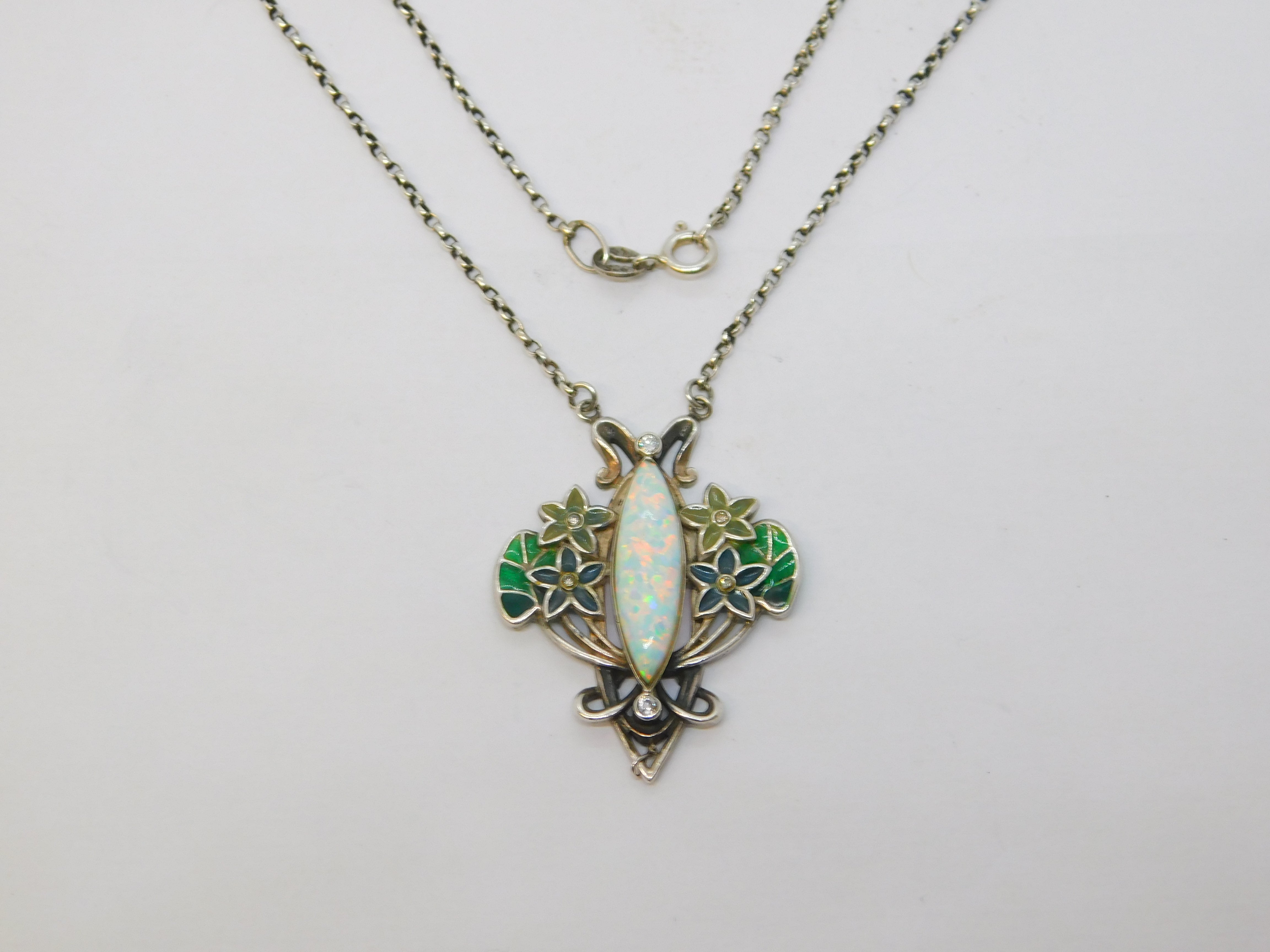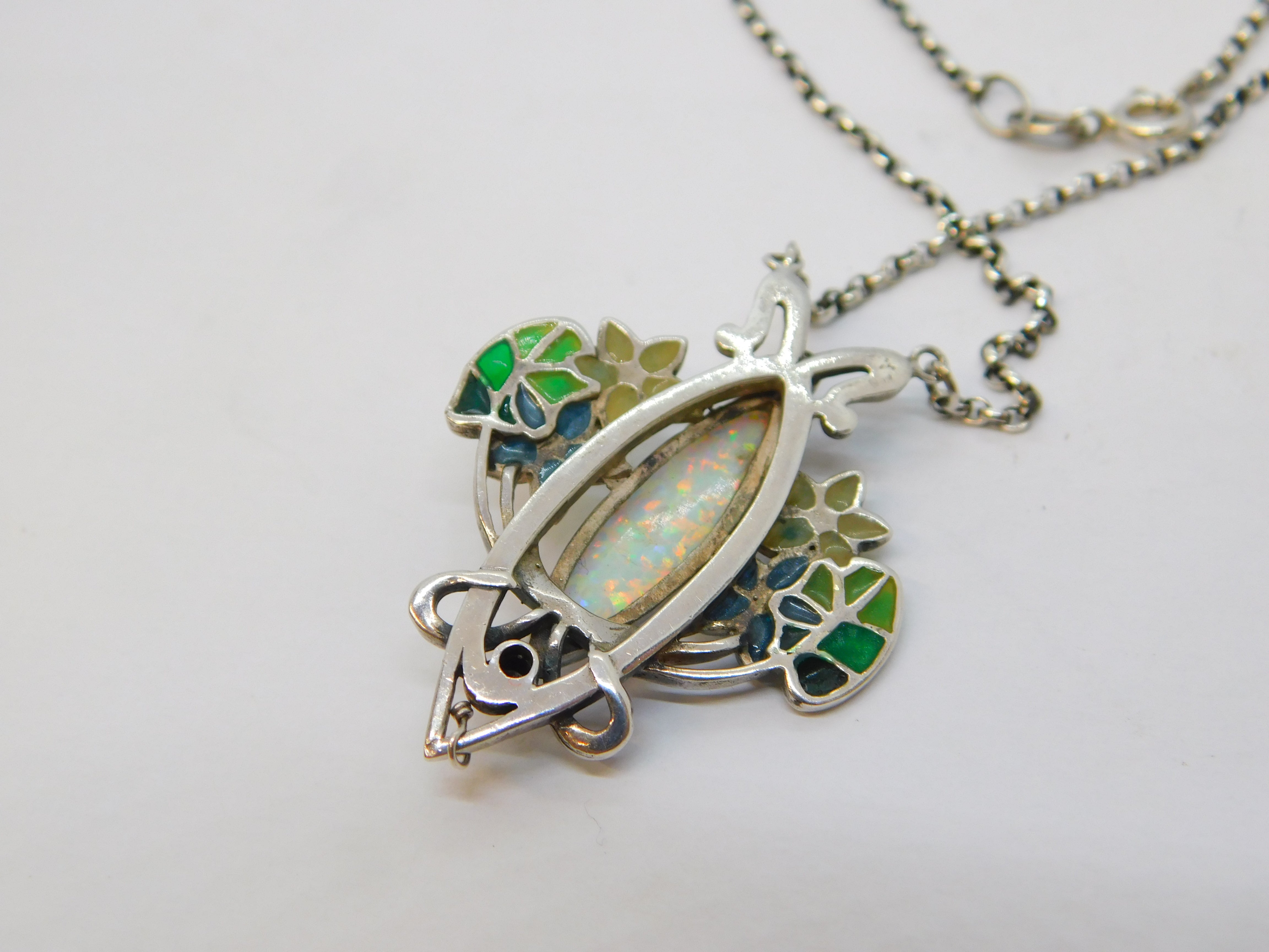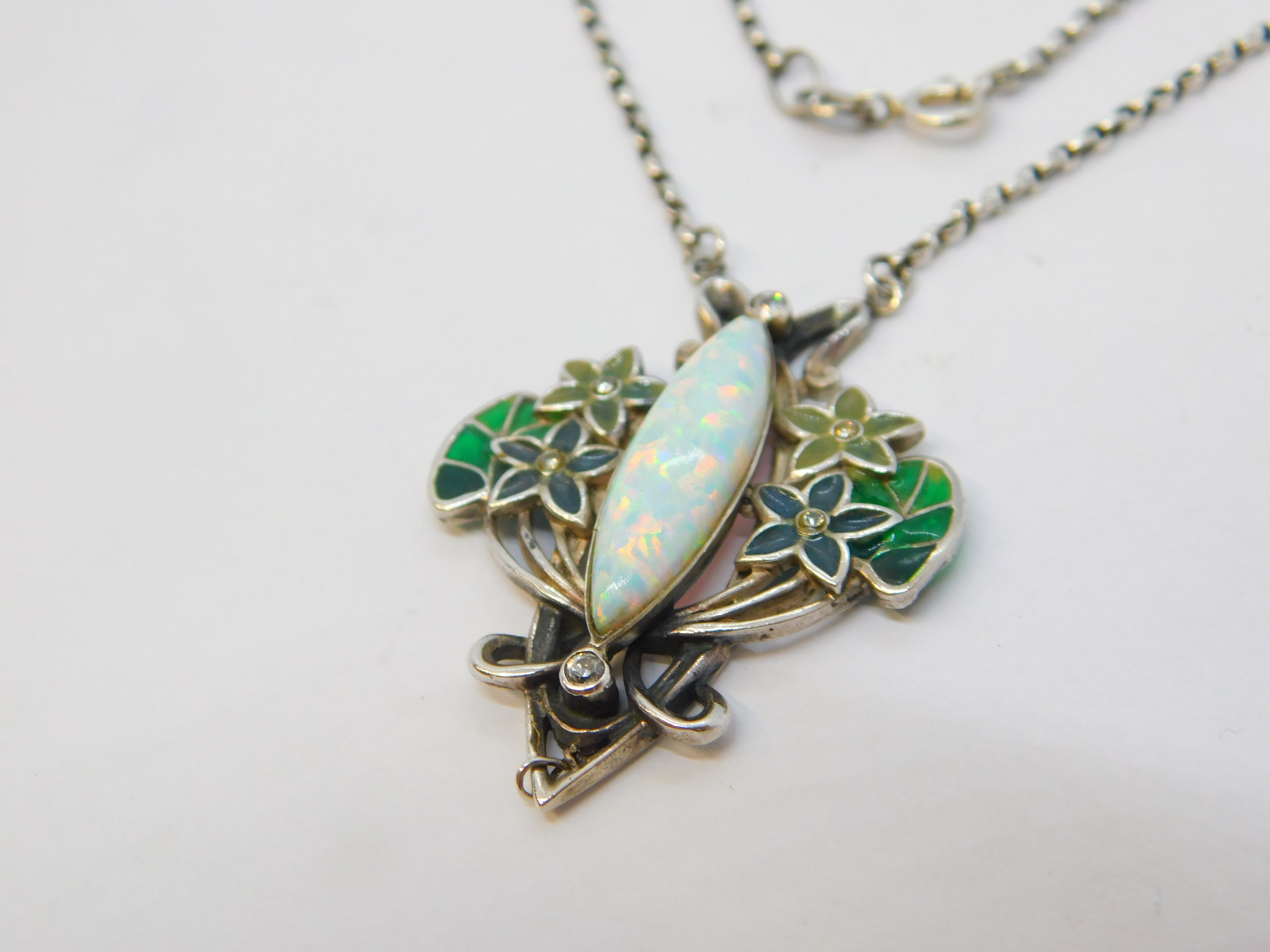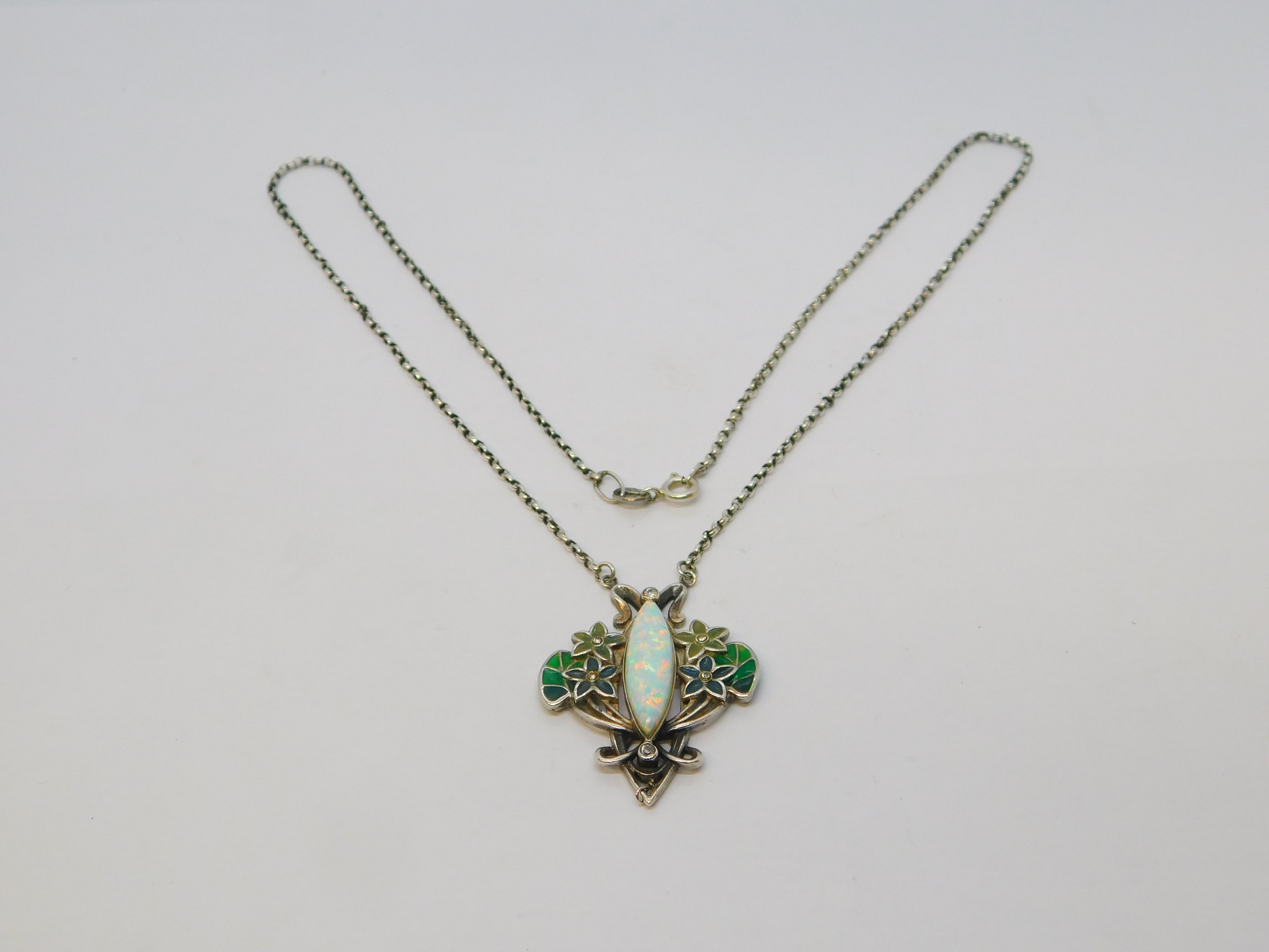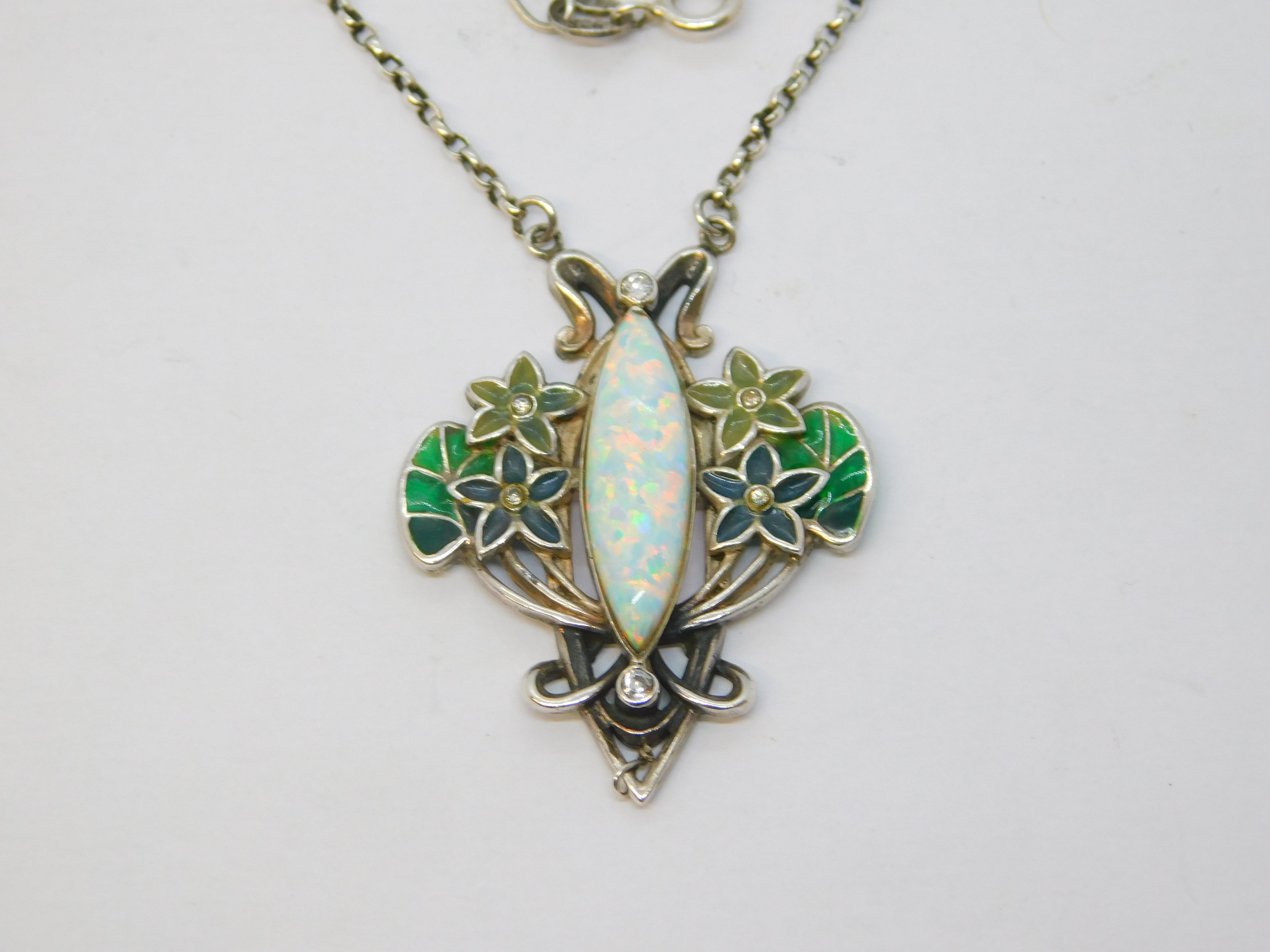 Details: A fantastic and wonderfully designed vintage sterling silver art nouveau style floral pendant necklace set with colourful plique-à-jour enamel alongside spinels and a central marquise cut opal hallmarked c1970. This is a wonderful item that would make a perfect gift or addition to any collection.