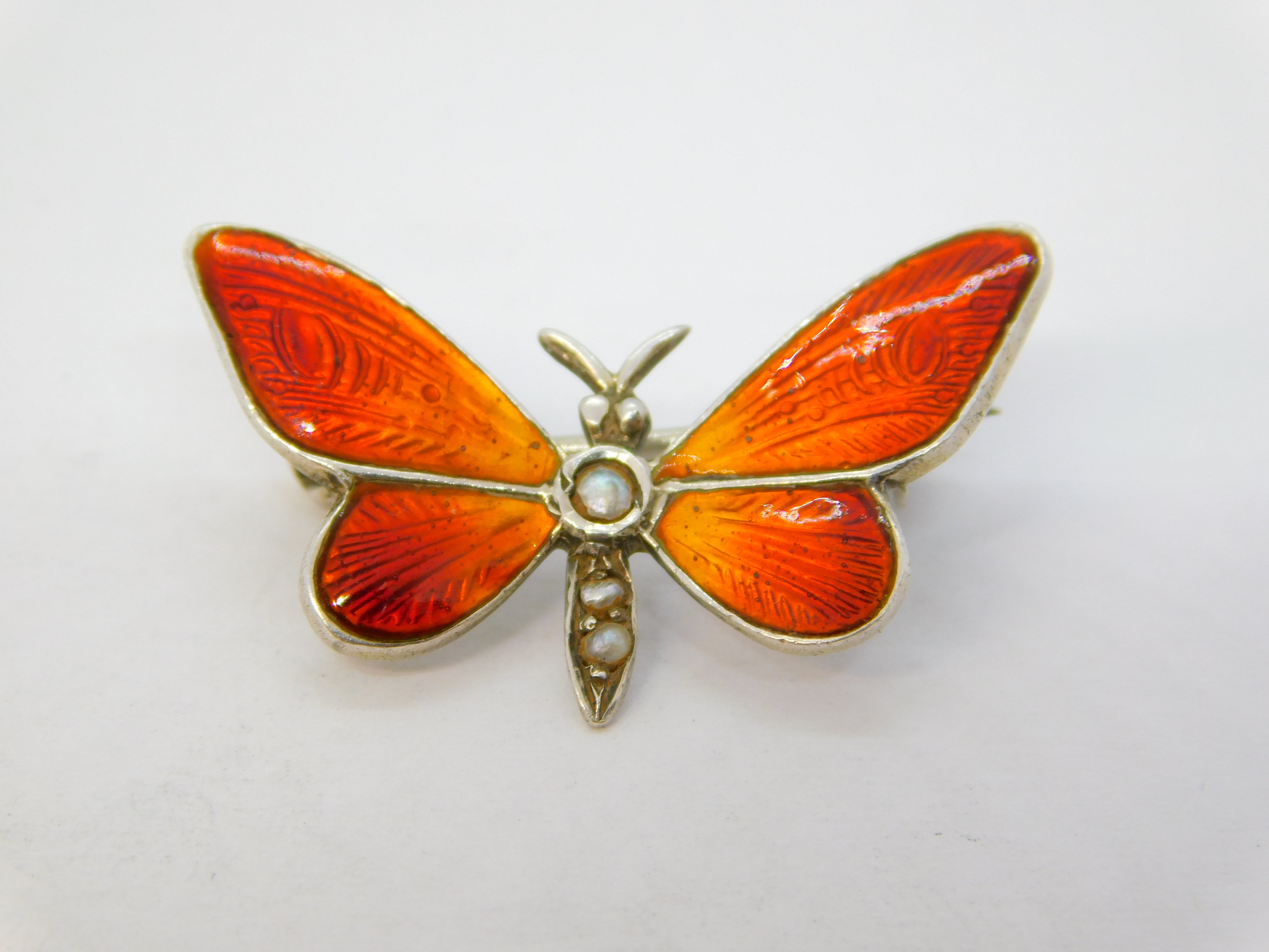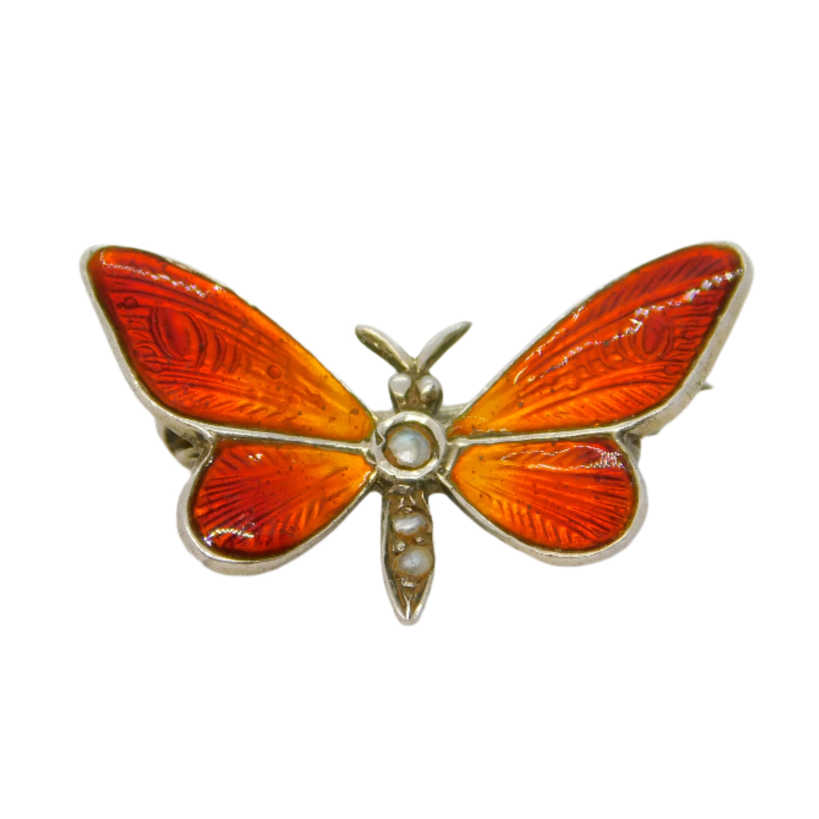 Sterling Silver, Red Enamel, Seed Pearl Butterfly Brooch Antique c1920 Deco