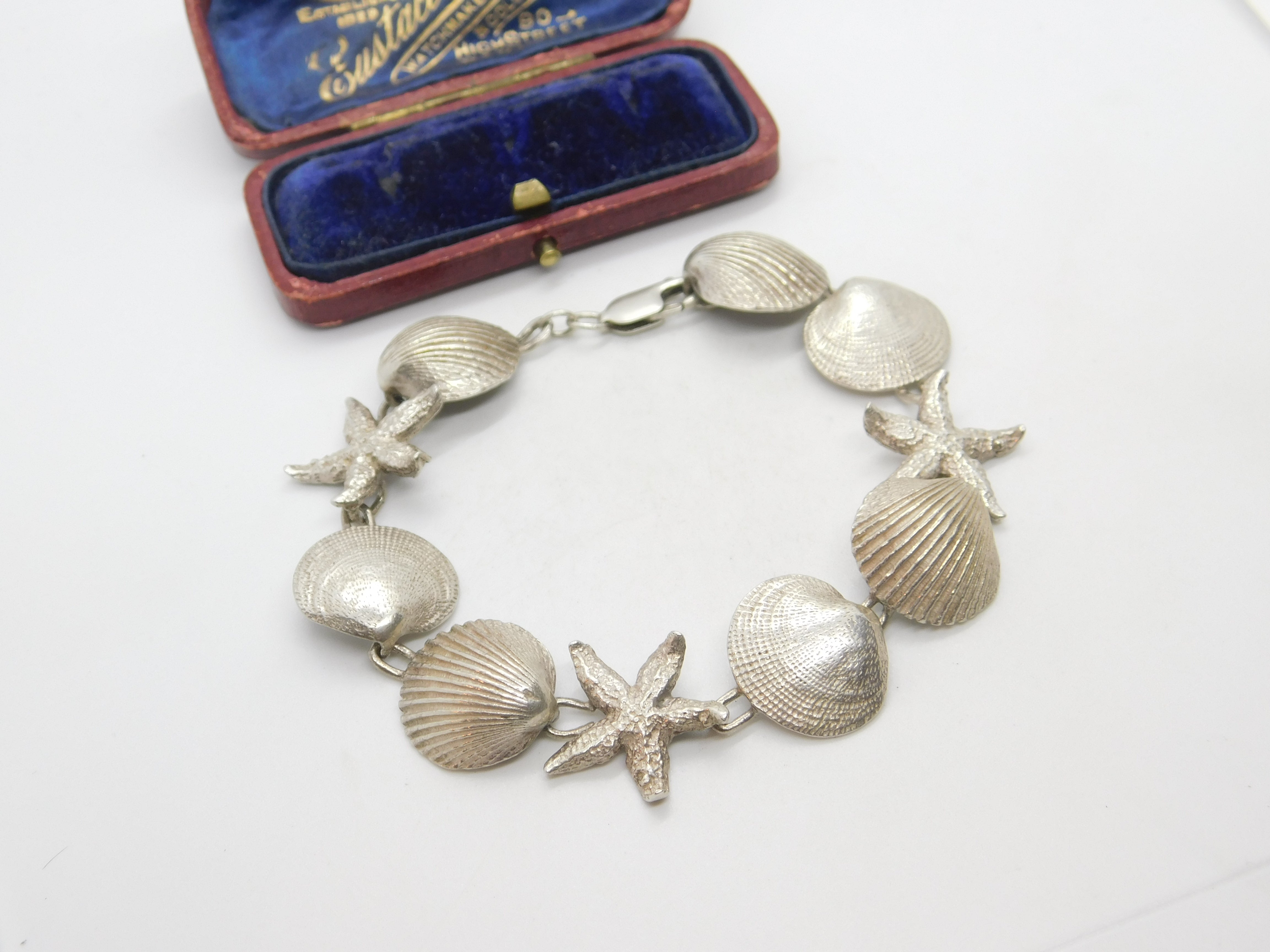 Details: A fantastic and wonderfully designed vintage sterling silver statement panel bracelet with seashell & starfish hallmarked to the bale c1970. A superb quality example. This is a wonderful item that would make a perfect gift or addition to any collection. The BOX pictured is for PRESENTATION ONLY and is NOT included in the listings but used to frame the pictures unless specifically stated otherwise.
