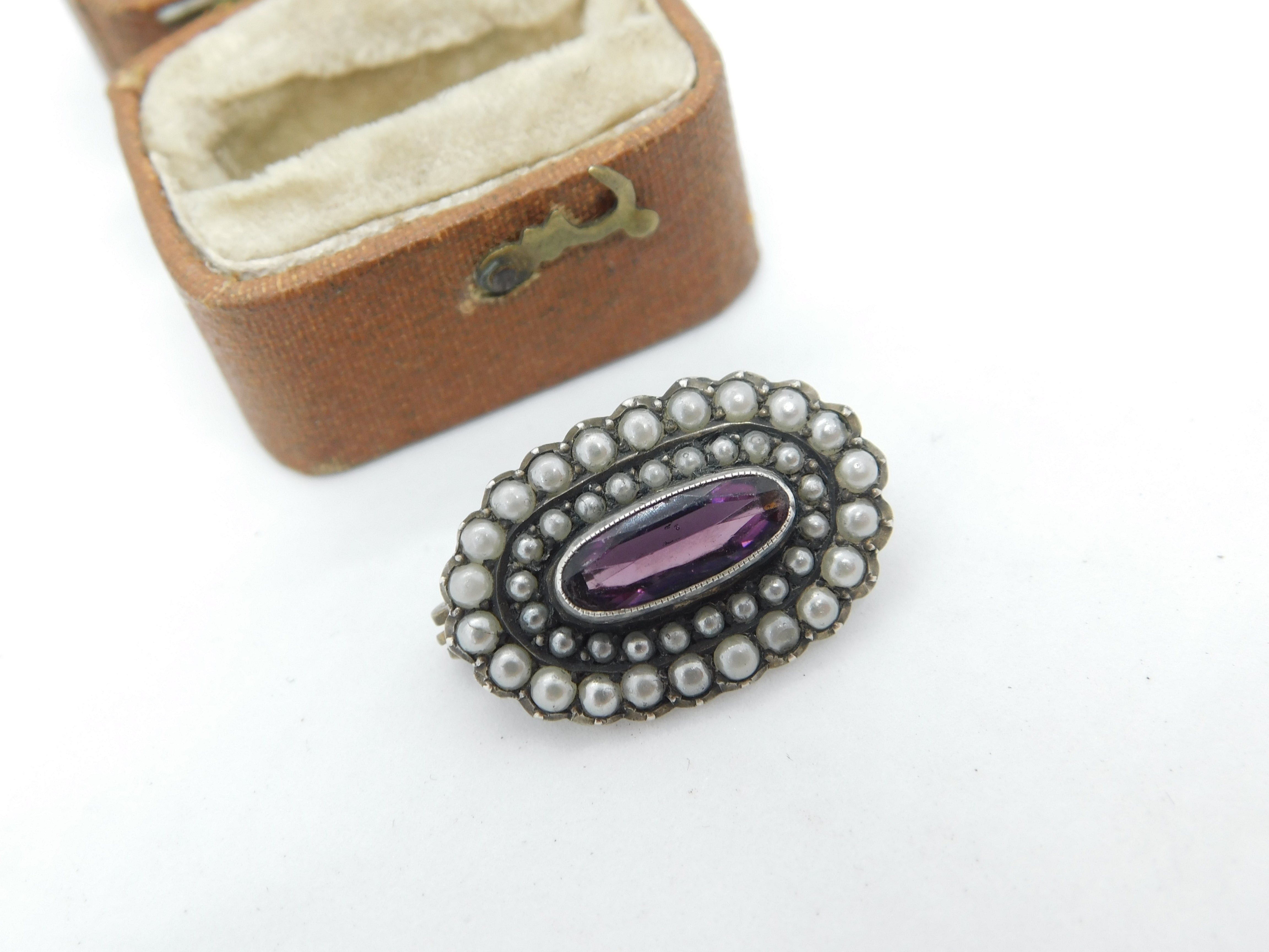 Sterling Silver, Seed Pearl & Amethyst Dress Brooch Antique c1920 Art Deco