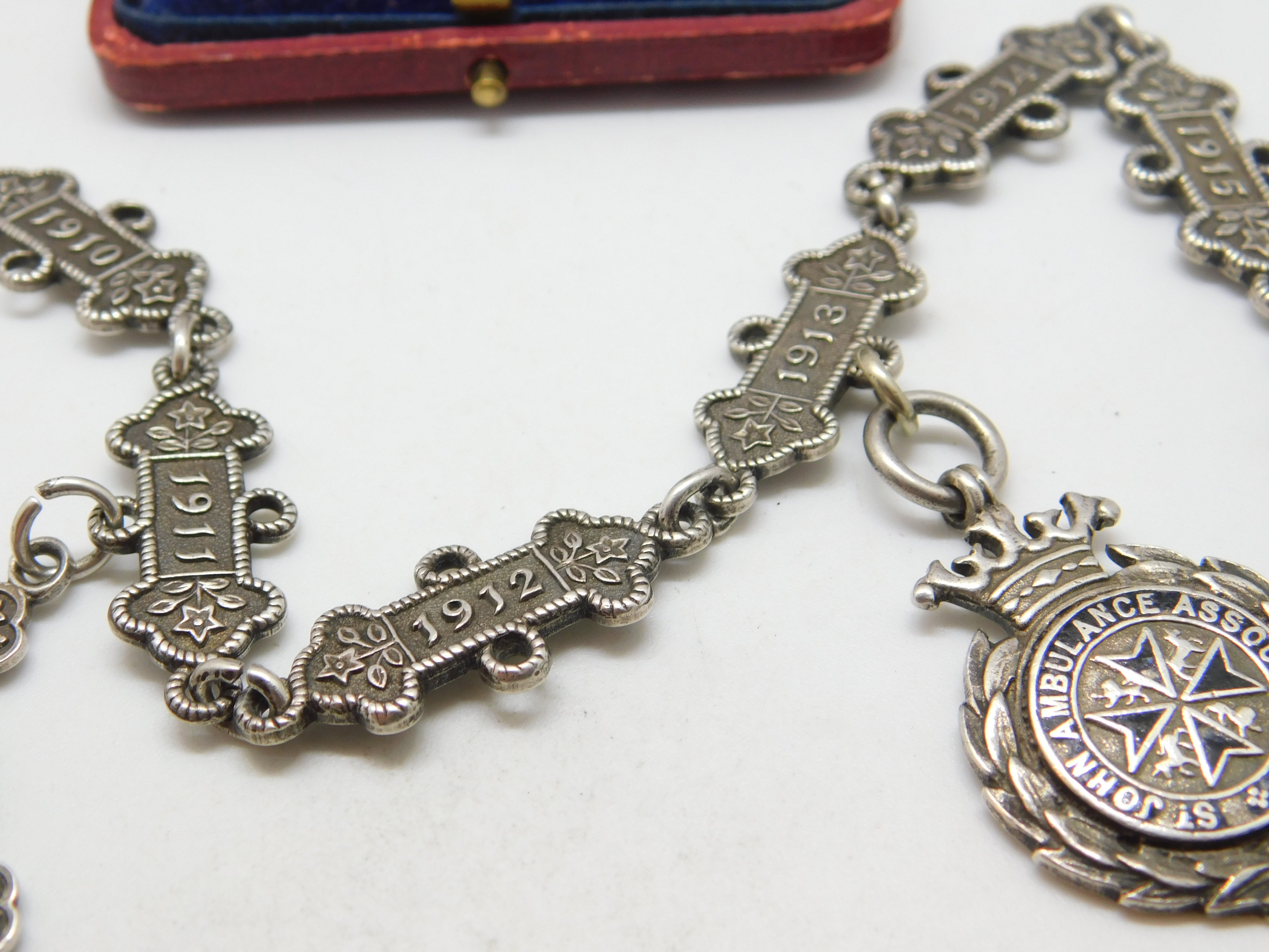 Details: For the discerning watch chain collector a superbly unusual antique sterling silver watch chain, the links made up of St John Ambulance service date tags with each year from 1909-1917 included with two service fobs attached both inscribed and fully hallmarked the chain belonging to a Mr. Joseph Jackson. Every link and fob is hallmarked we have never seen one like this! This is a wonderful item that would make a perfect gift or addition to any collection. The BOX pictured is for PRESENTATION ONLY and is NOT included in the listings but used to frame the pictures unless specifically stated otherwise.