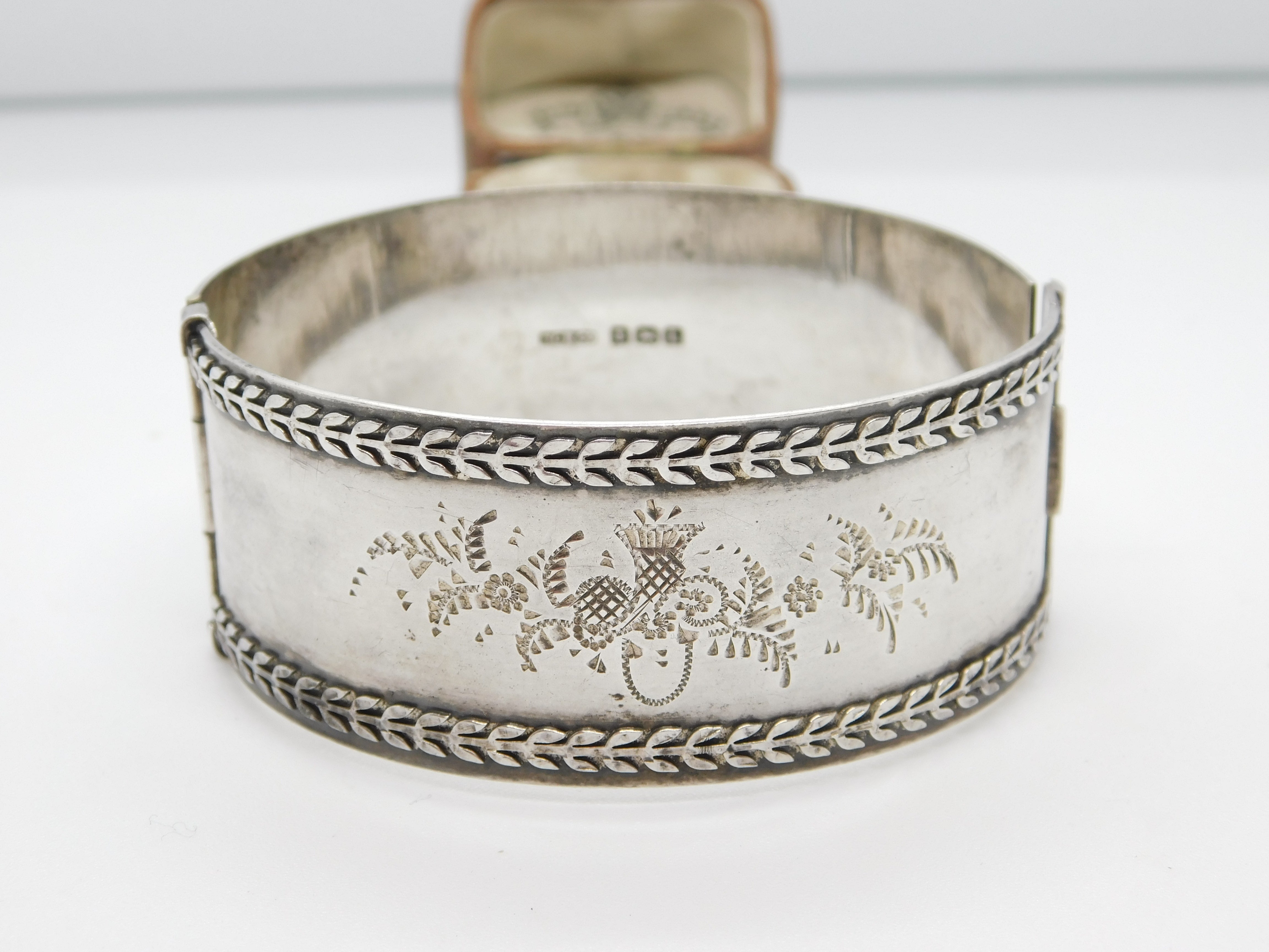 Details: A fantastic and wonderfully designed antique art deco sterling silver large cuff bangle bracelet with charming etched thistle and floral patterns hallmarked Birmingham 1935. This is a wonderful item that would make a perfect gift or addition to any collection. The BOX pictured is for PRESENTATION ONLY and is NOT included in the listings but used to frame the pictures unless specifically stated otherwise.