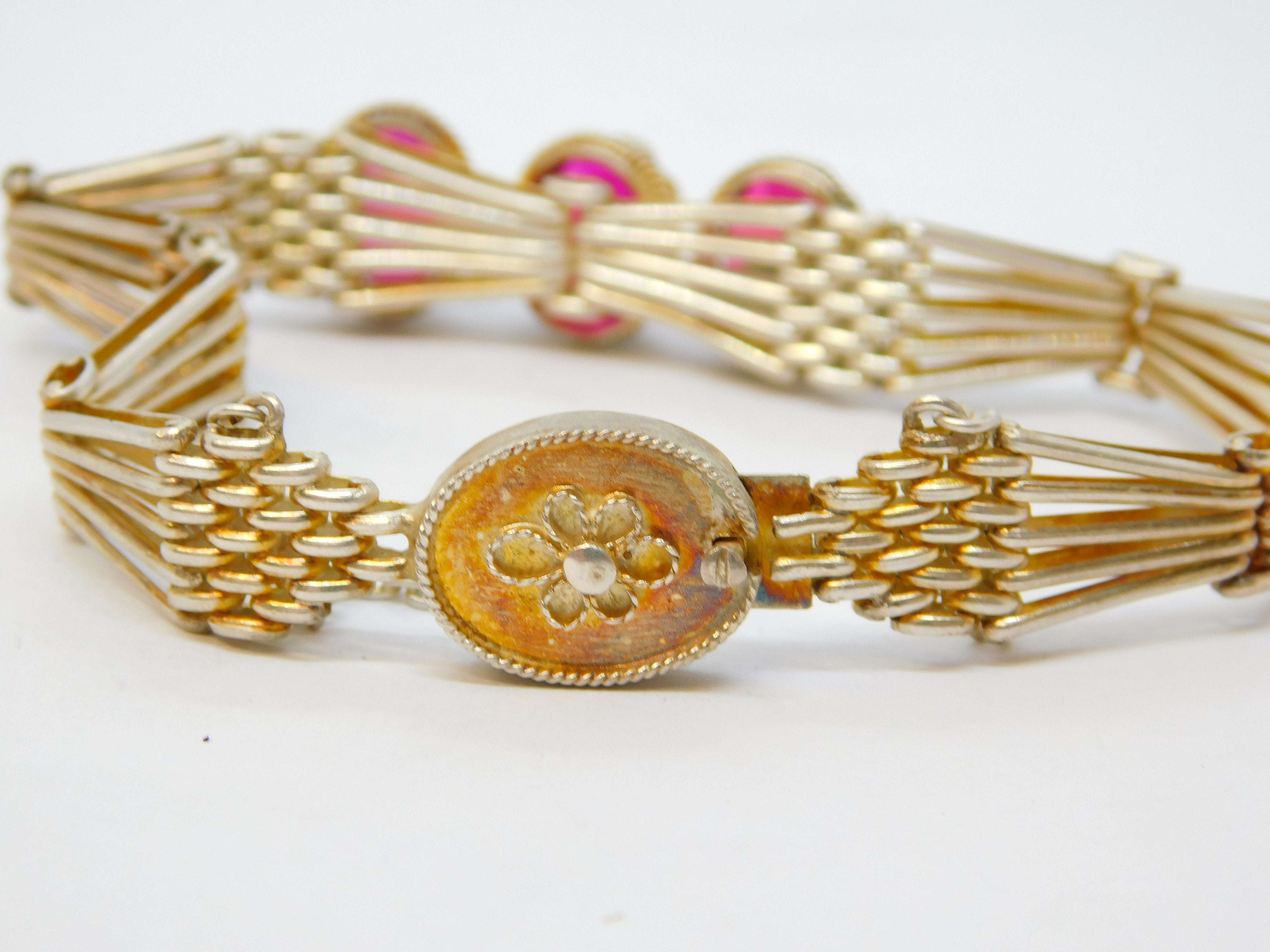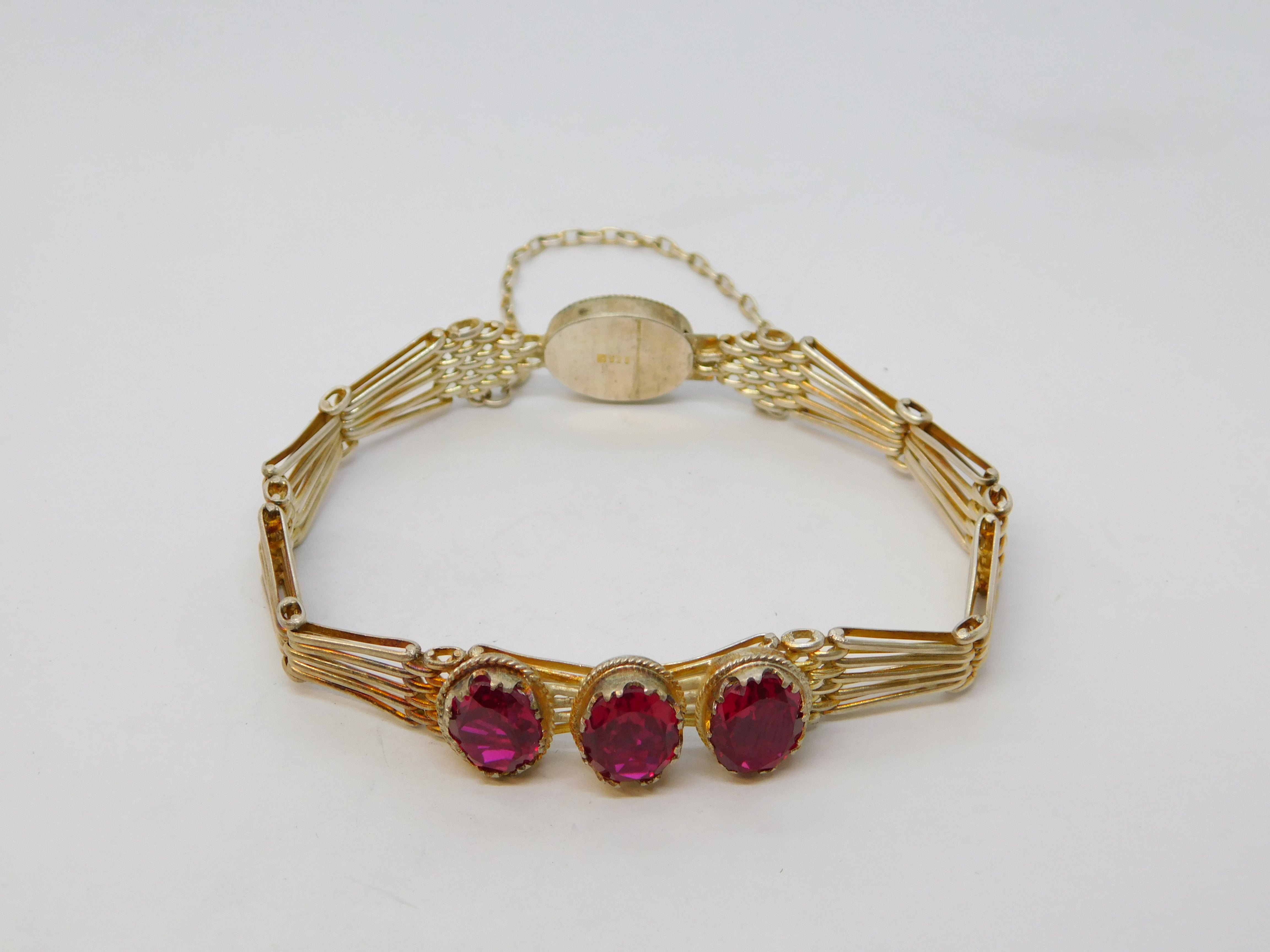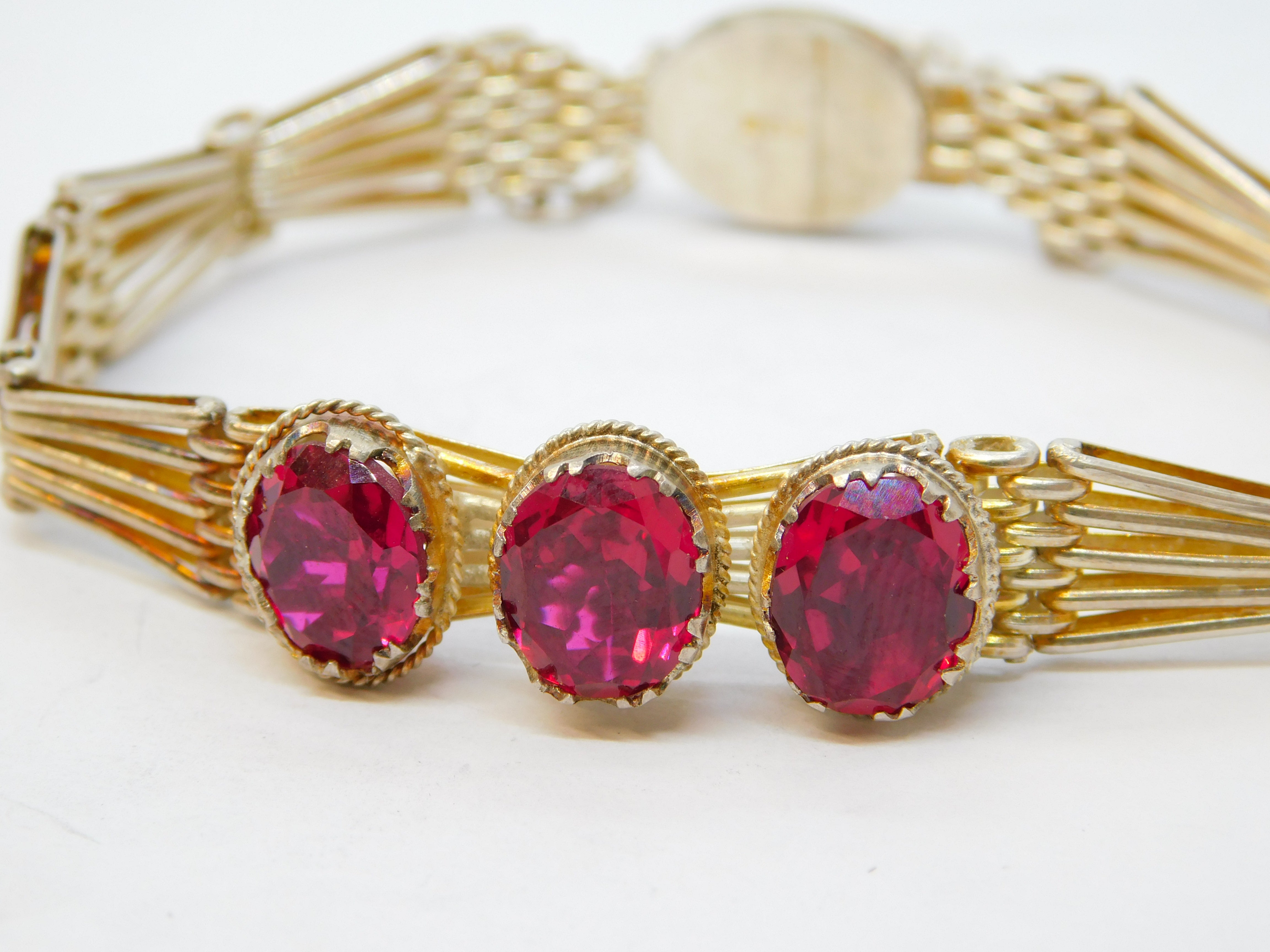 Sterling Silver Three-Stone Ruby Gate Link Chain Bracelet Antique c1930 Art Deco