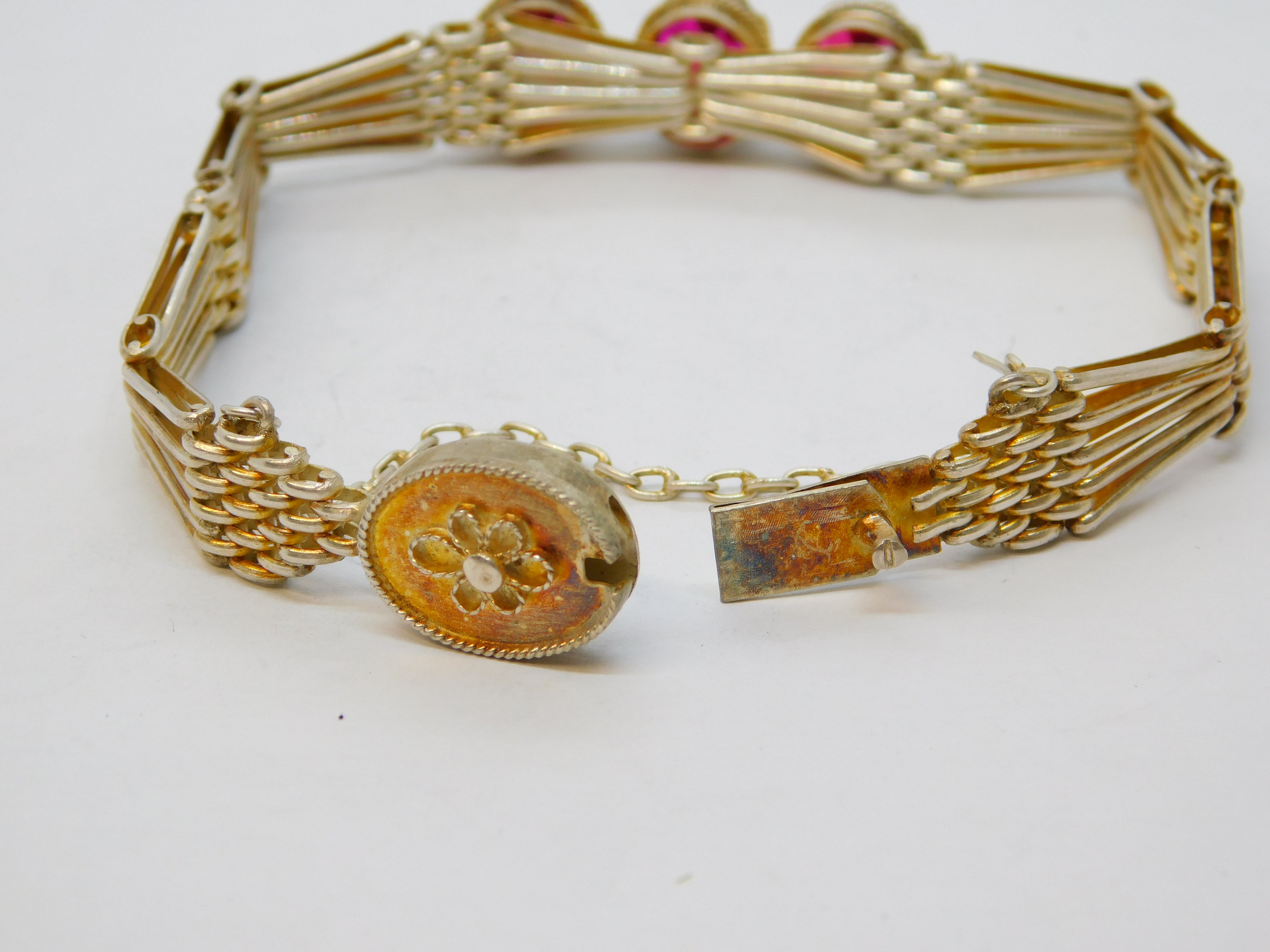 Details: A fantastic and wonderfully designed antique art deco sterling silver gate link bracelet set with three large ruby stones hallmarked to the reverse c1920, the rubies have been tested. This is a wonderful item that would make a perfect gift or addition to any collection.