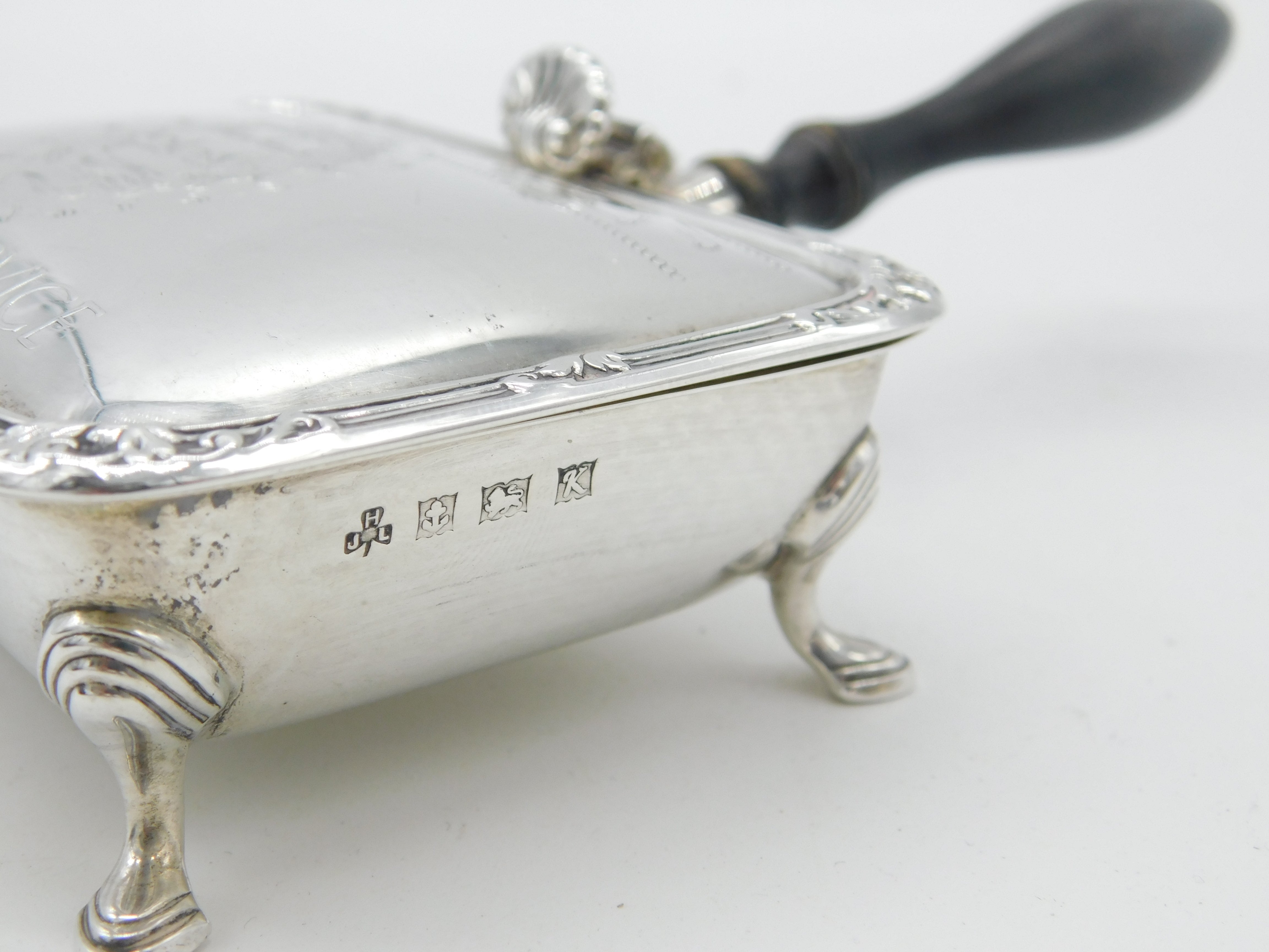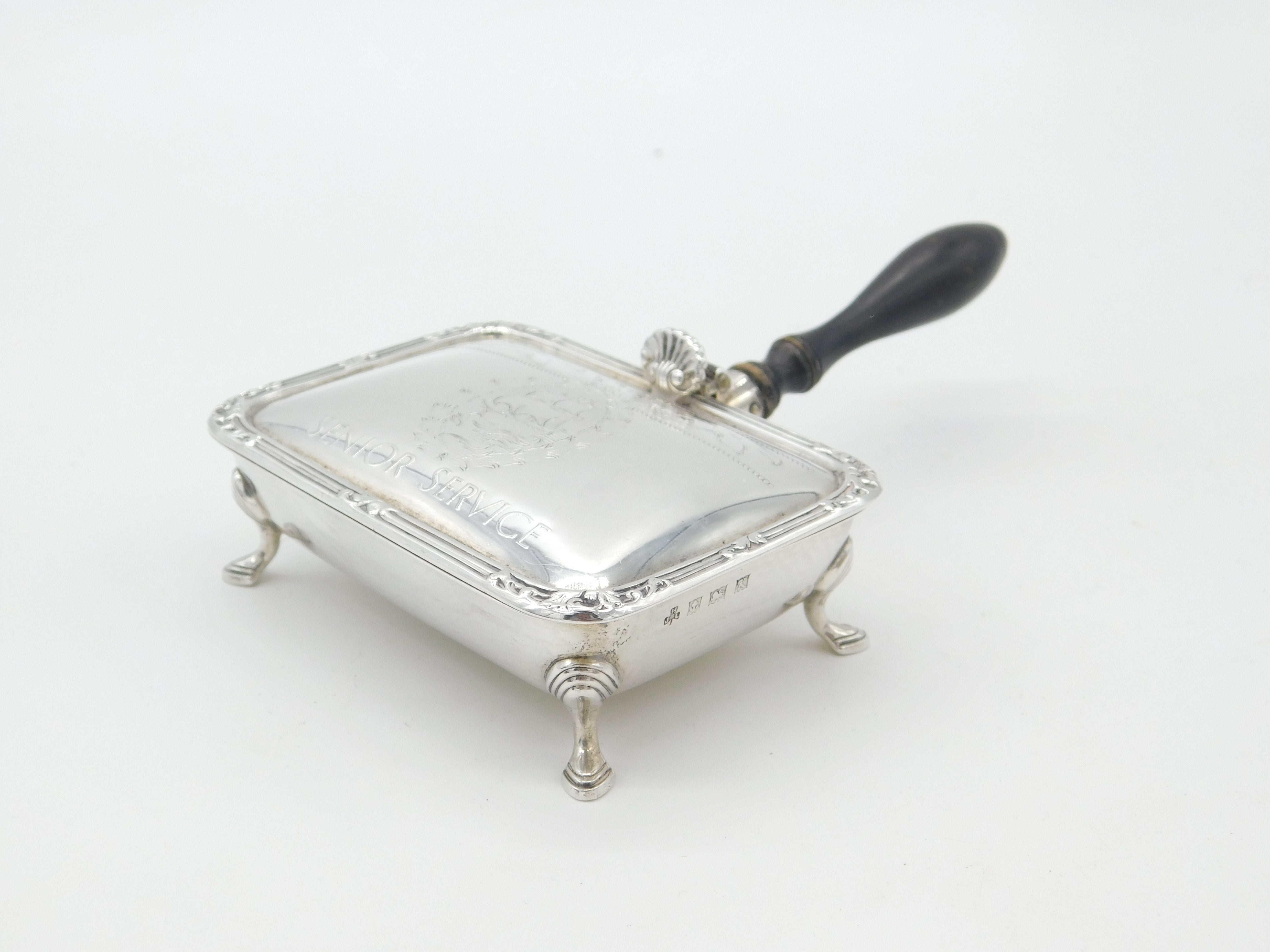 Details: A fantastic and wonderfully designed mid-century sterling silver wooden handle ashtray issued by Senior Service cigarettes almost certainly to executives hallmarked Birmingham 1959 to the edge. This is a wonderful item that would make a perfect gift or addition to any collection. The BOX pictured is for PRESENTATION ONLY and is NOT included in the listings but used to frame the pictures unless specifically stated otherwise.