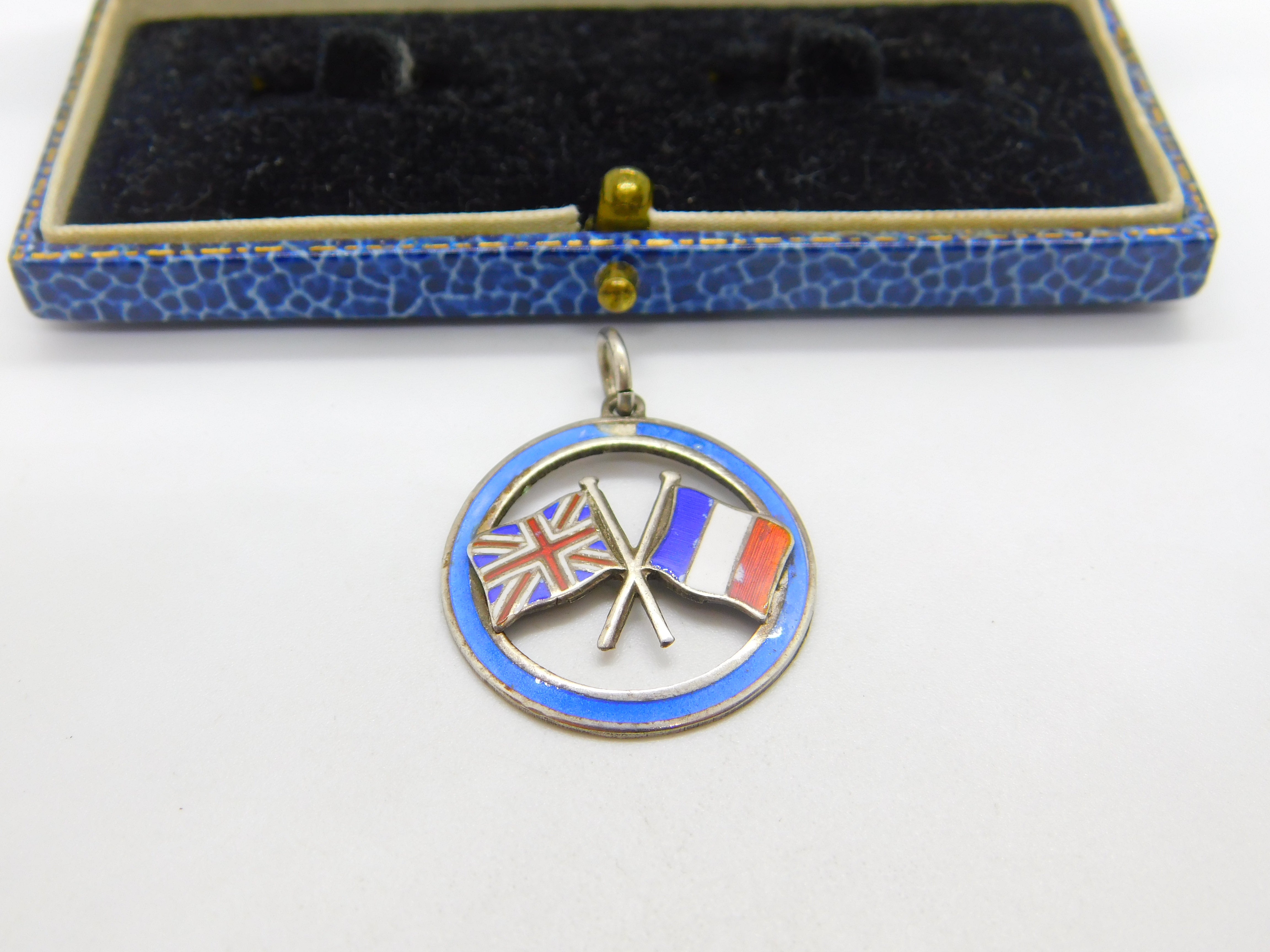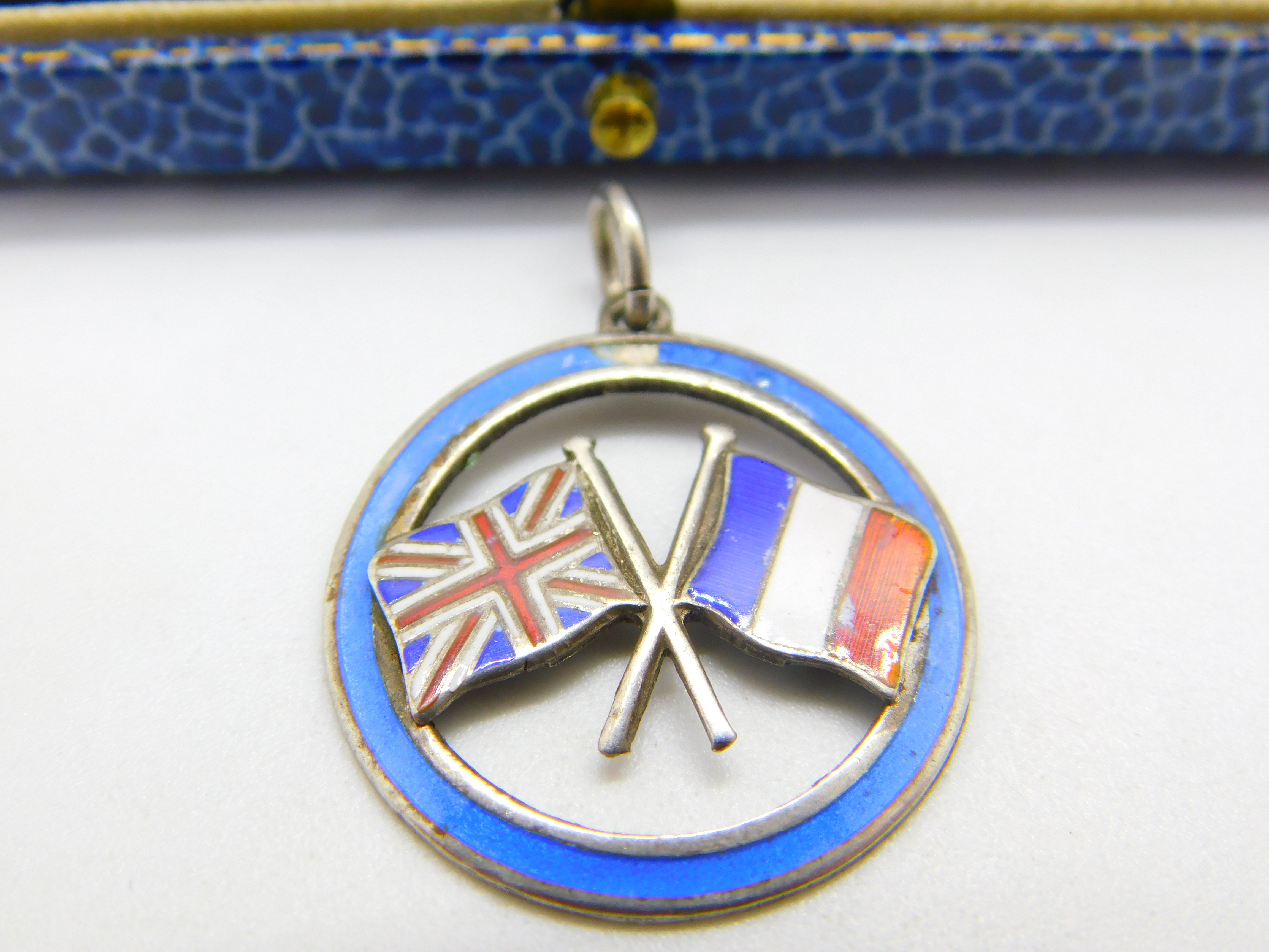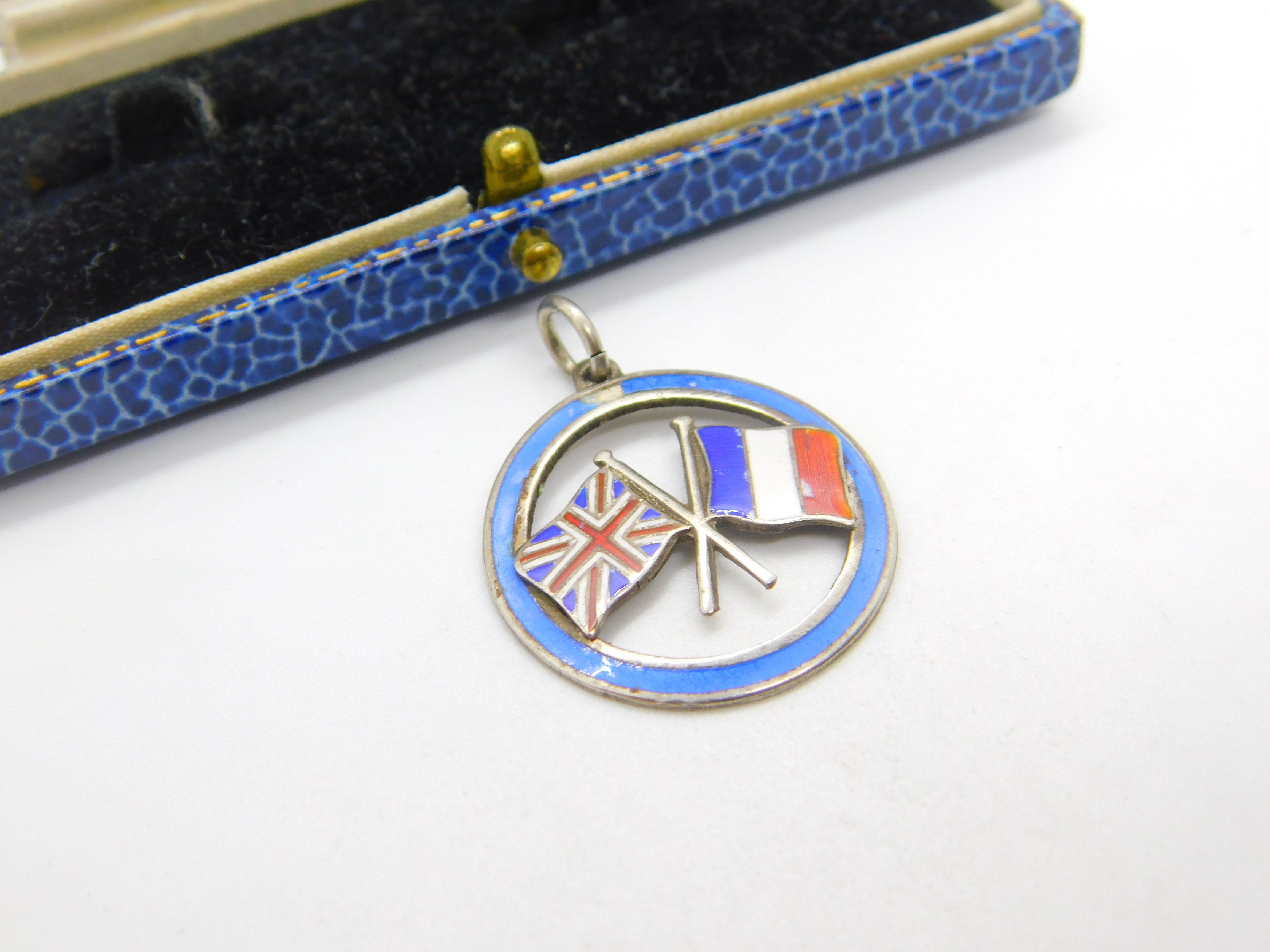 Details: A fantastic and wonderfully designed antique WW1-era sterling silver and colourful enamel fob or pendant with the flags of the UK and france denoting WW1 victory in 1918 hallmarked to the reverse c1918. Minor chip to the top enamel. This is a wonderful item that would make a perfect gift or addition to any collection. The BOX pictured is for PRESENTATION ONLY and is NOT included in the listings but used to frame the pictures unless specifically stated otherwise.