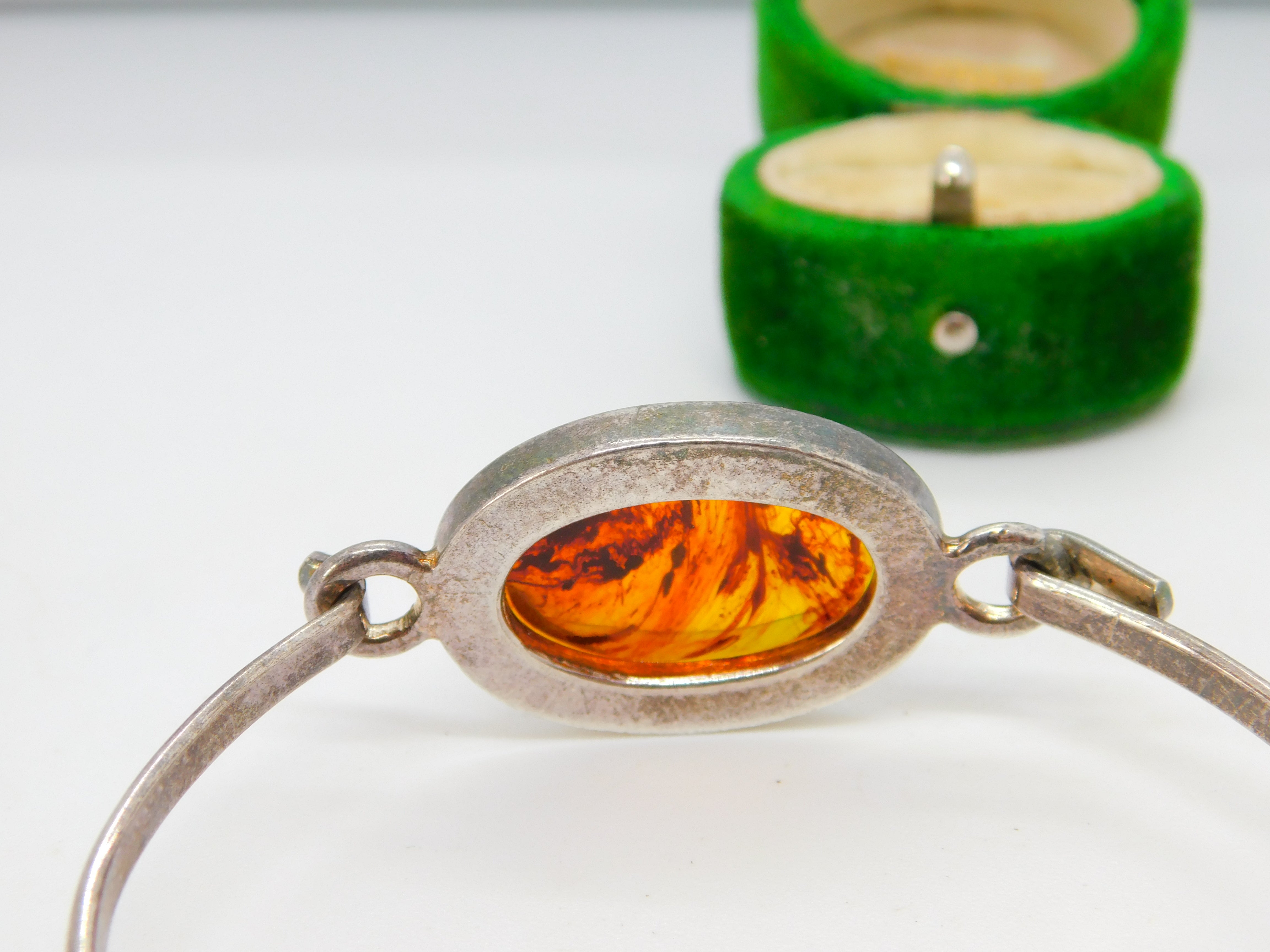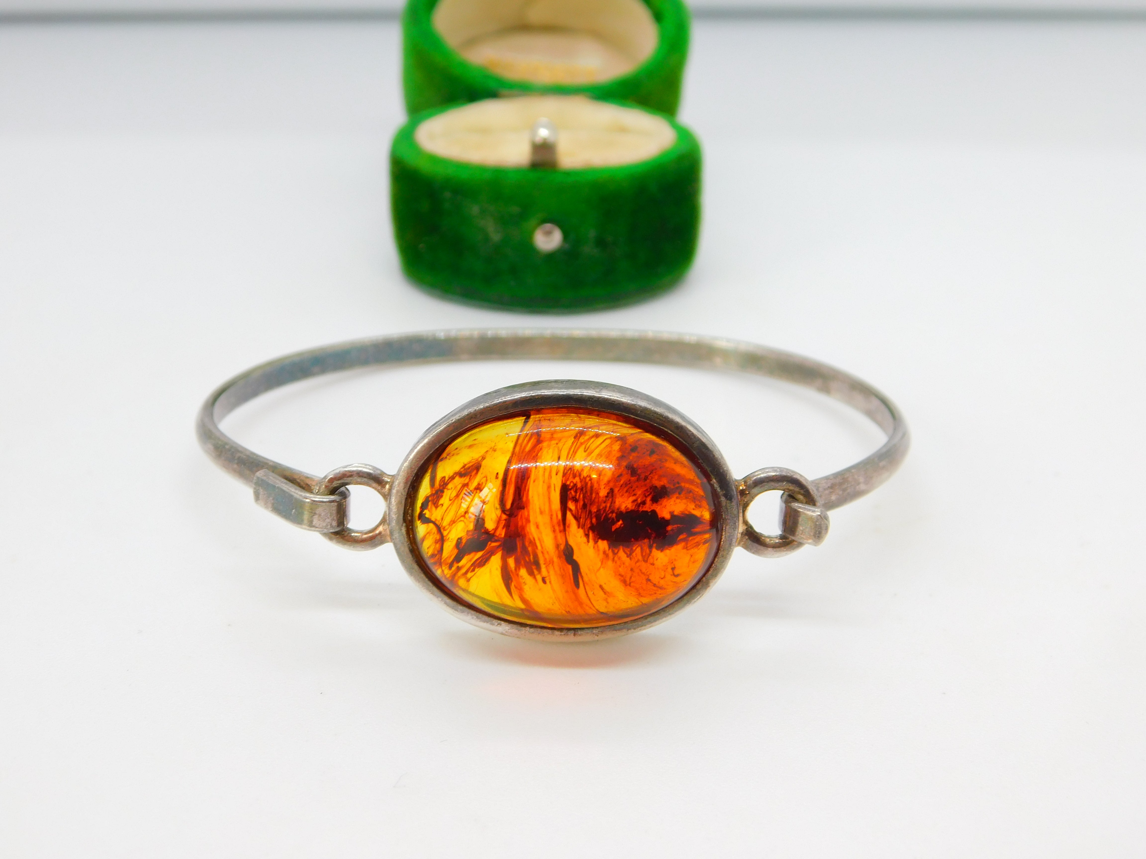 Studio Sterling Silver Cabochon Baltic Amber Bangle Bracelet Vintage c1980