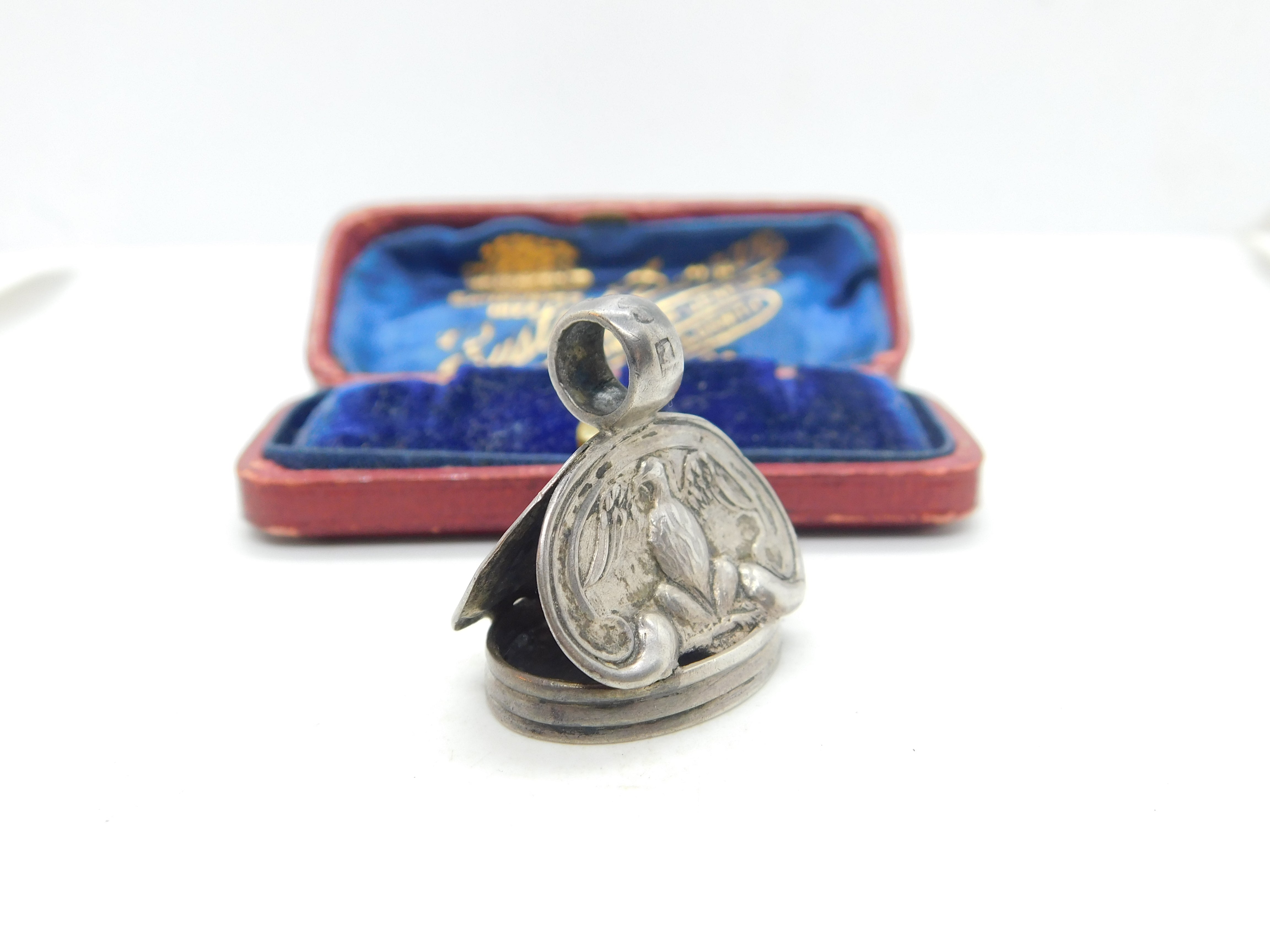 Details: A fantastic and wonderfully designed antique Georgian sterling silver Swedish seal fob with initials or a crest to the base and adorned with proud eagles to both sides hallmarked to the bale with Swedish hallmarks c1820. Fantastically unusual seal! This is a wonderful item that would make a perfect gift or addition to any collection. The BOX pictured is for PRESENTATION ONLY and is NOT included in the listings but used to frame the pictures unless specifically stated otherwise.
