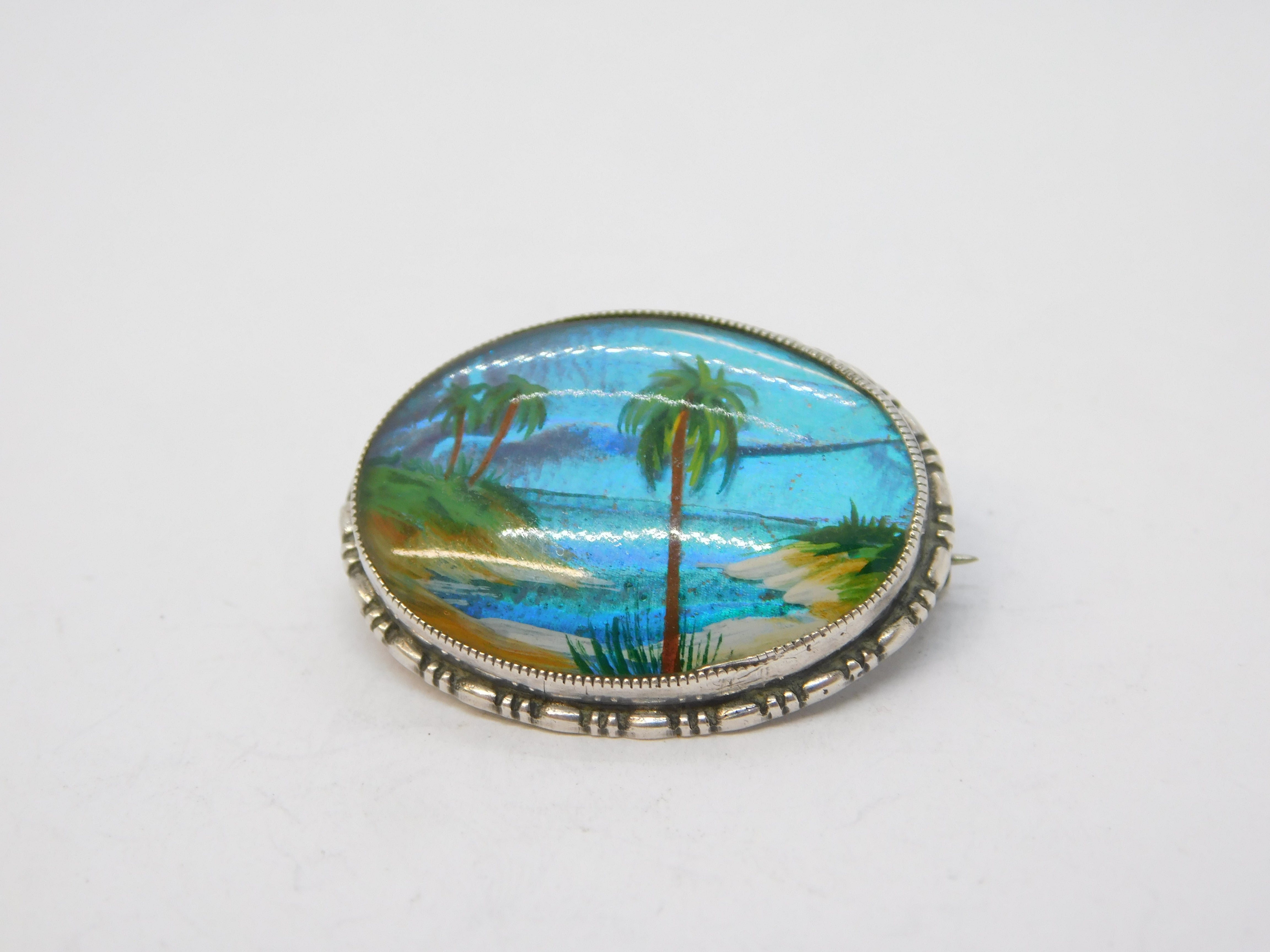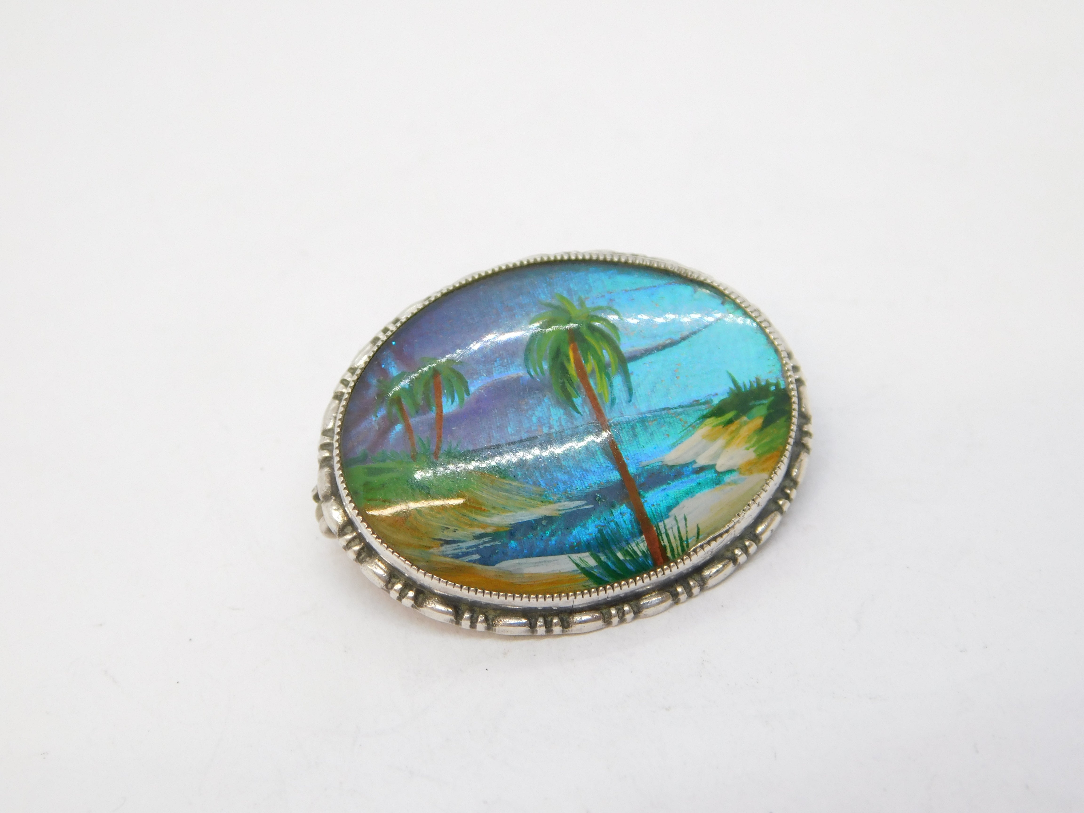 TLM Sterling Silver Morpho Butterfly Wing Island Scene Brooch Antique c1920 Deco