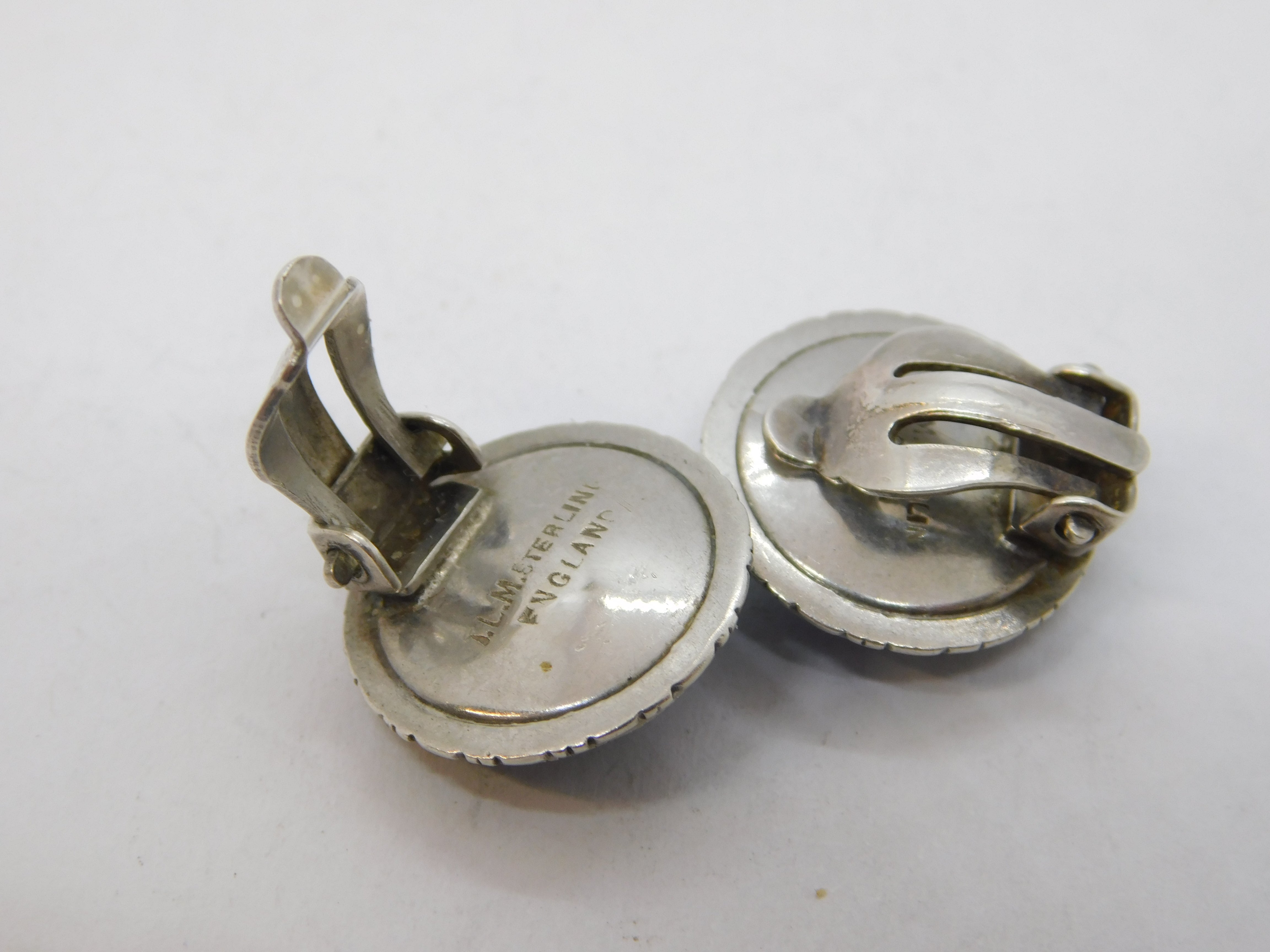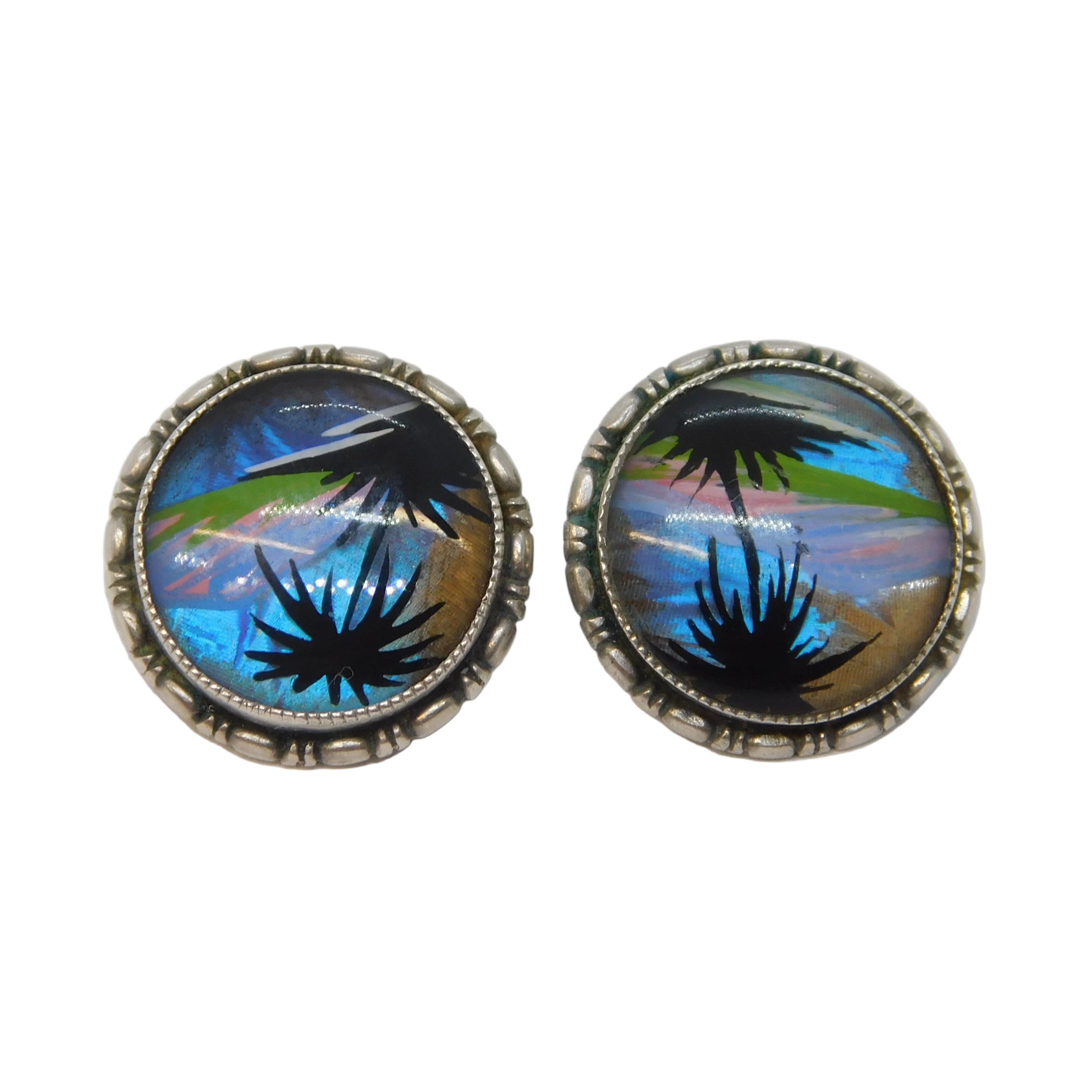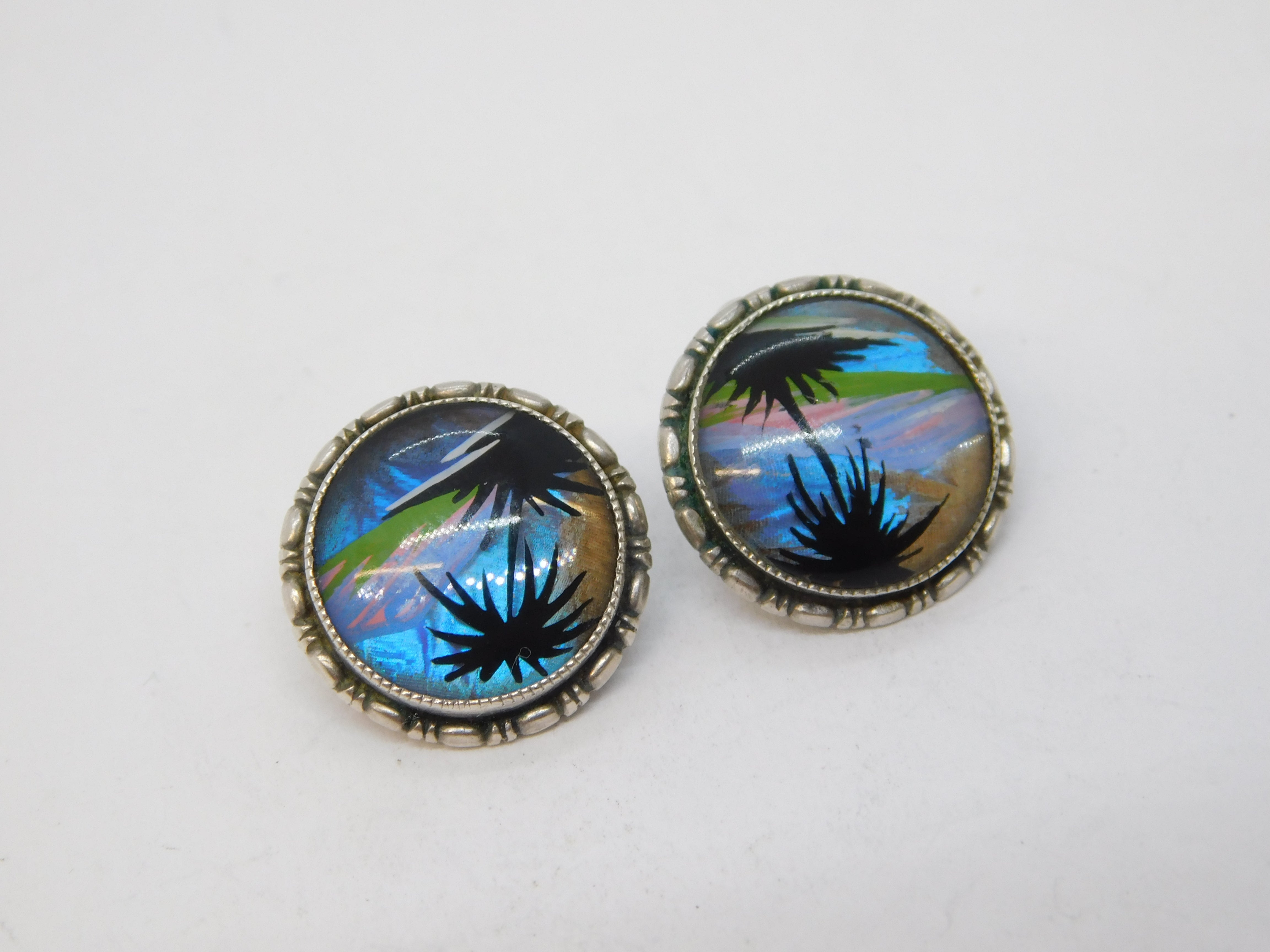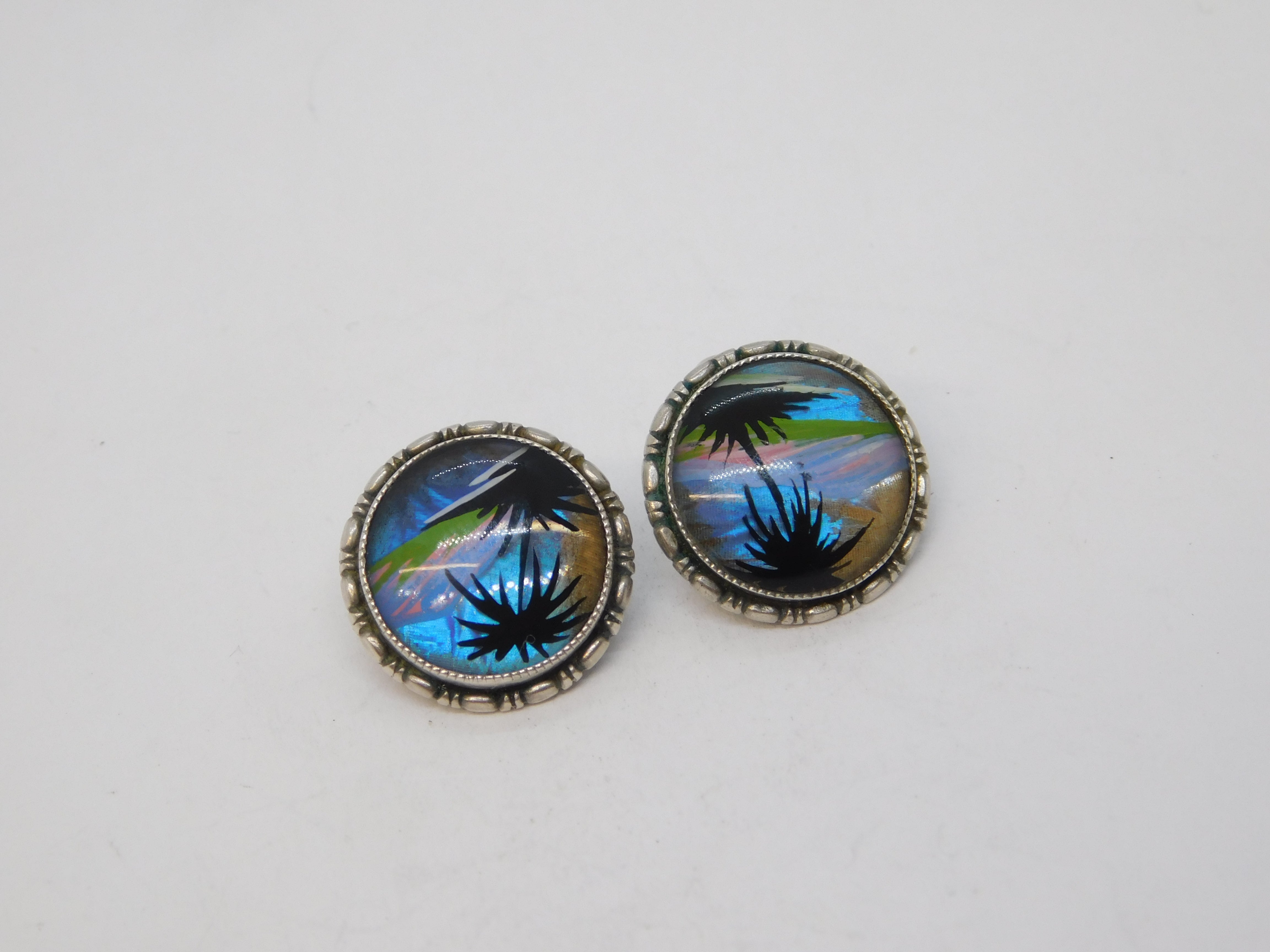 Details: A fantastic and wonderfully designed antique art deco sterling silver pair of clip-on earrings depicting island scenes set with morpho butterfly wing hallmarked to the reverse c1930. This is a wonderful item that would make a perfect gift or addition to any collection. We are more than happy to provide XRF reports for items upon request.