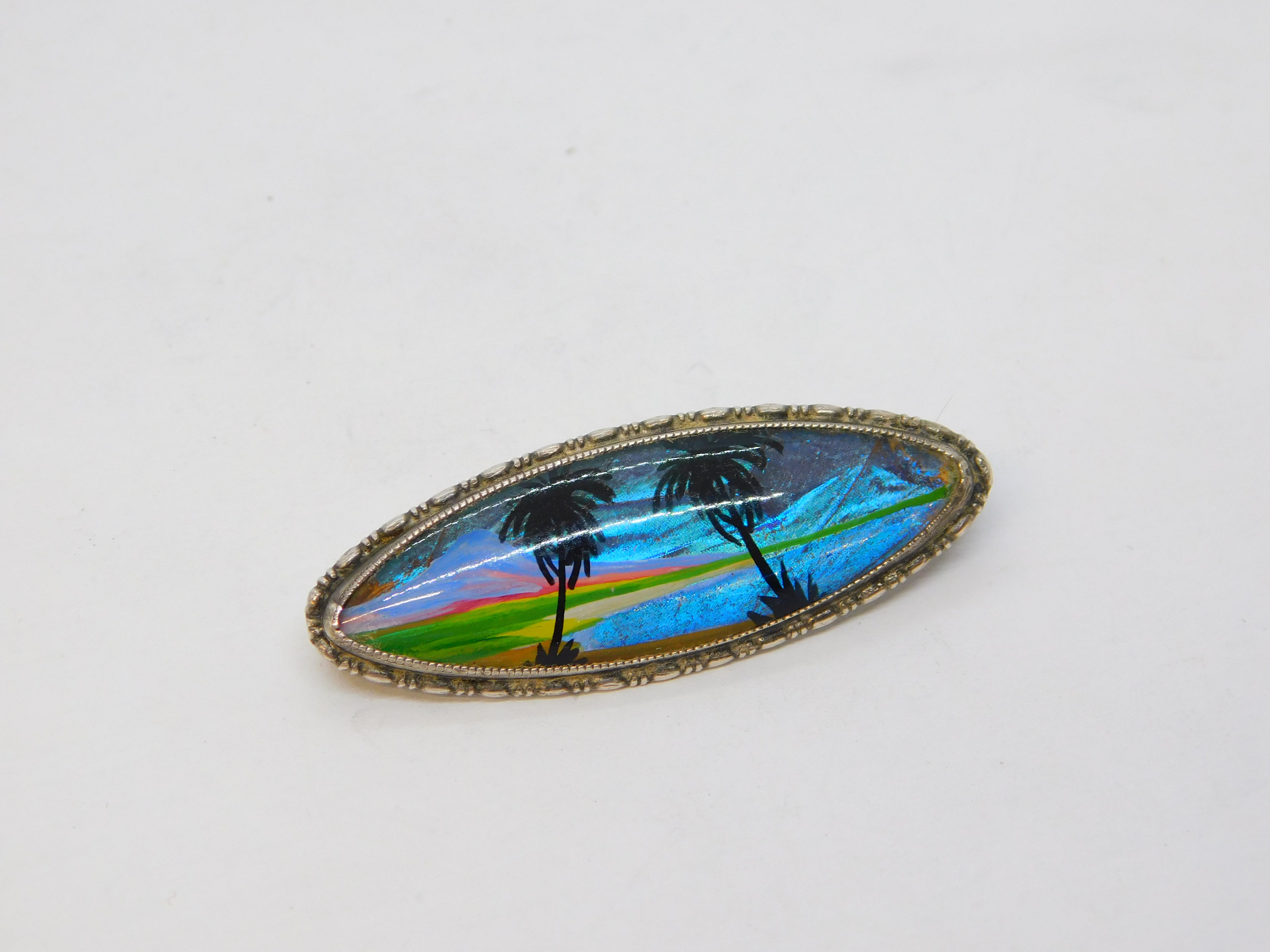 Details: A fantastic and wonderfully designed antique art deco sterling silver mounted morpho butterfly wing palm tree island scene brooch hallmarked to the reverse c1920 by TLM. This is a wonderful item that would make a perfect gift or addition to any collection.