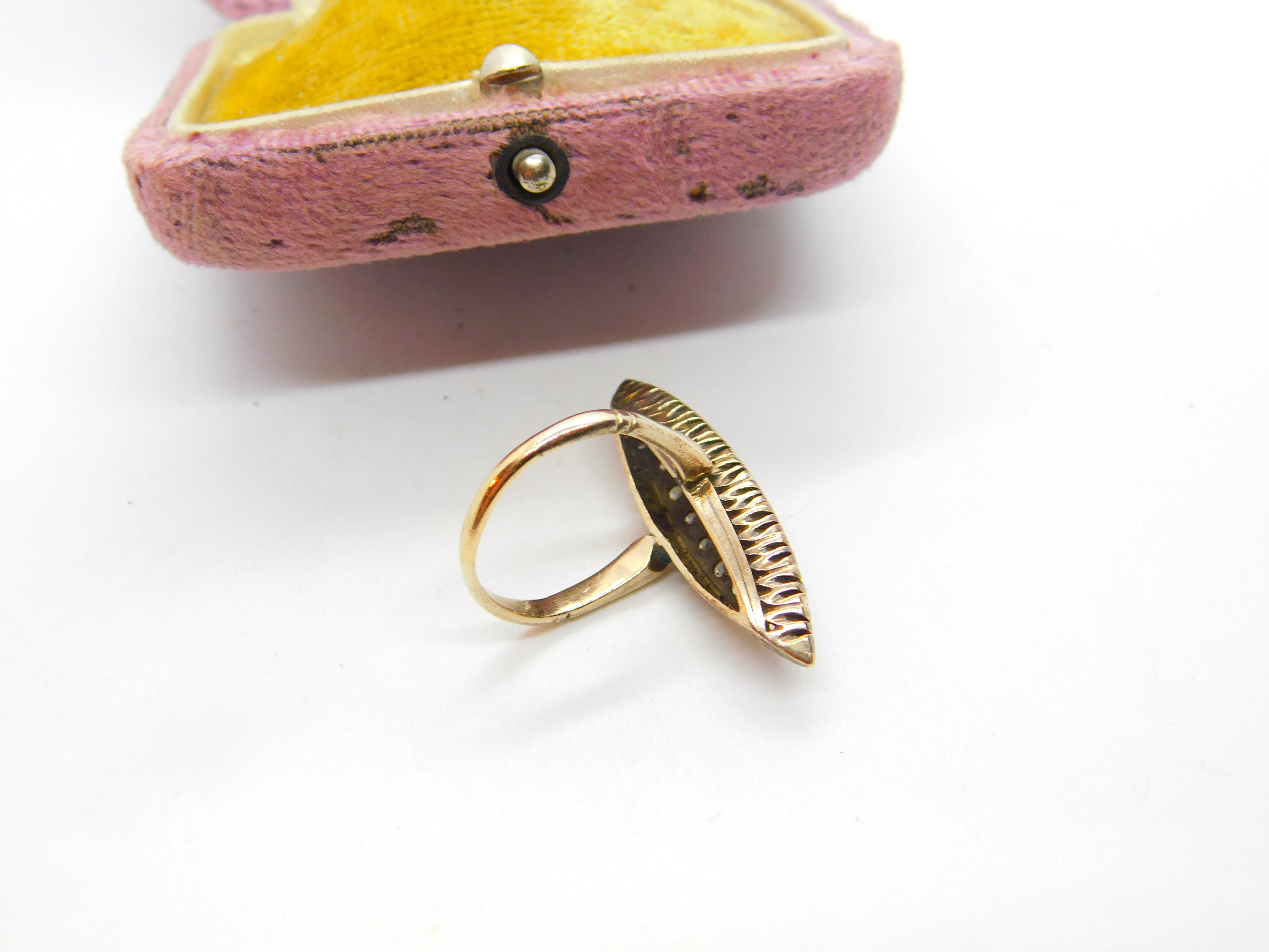 True Deco 9ct Rose Gold, Red-White Paste Stone Marquise Form Shield Ring c1930