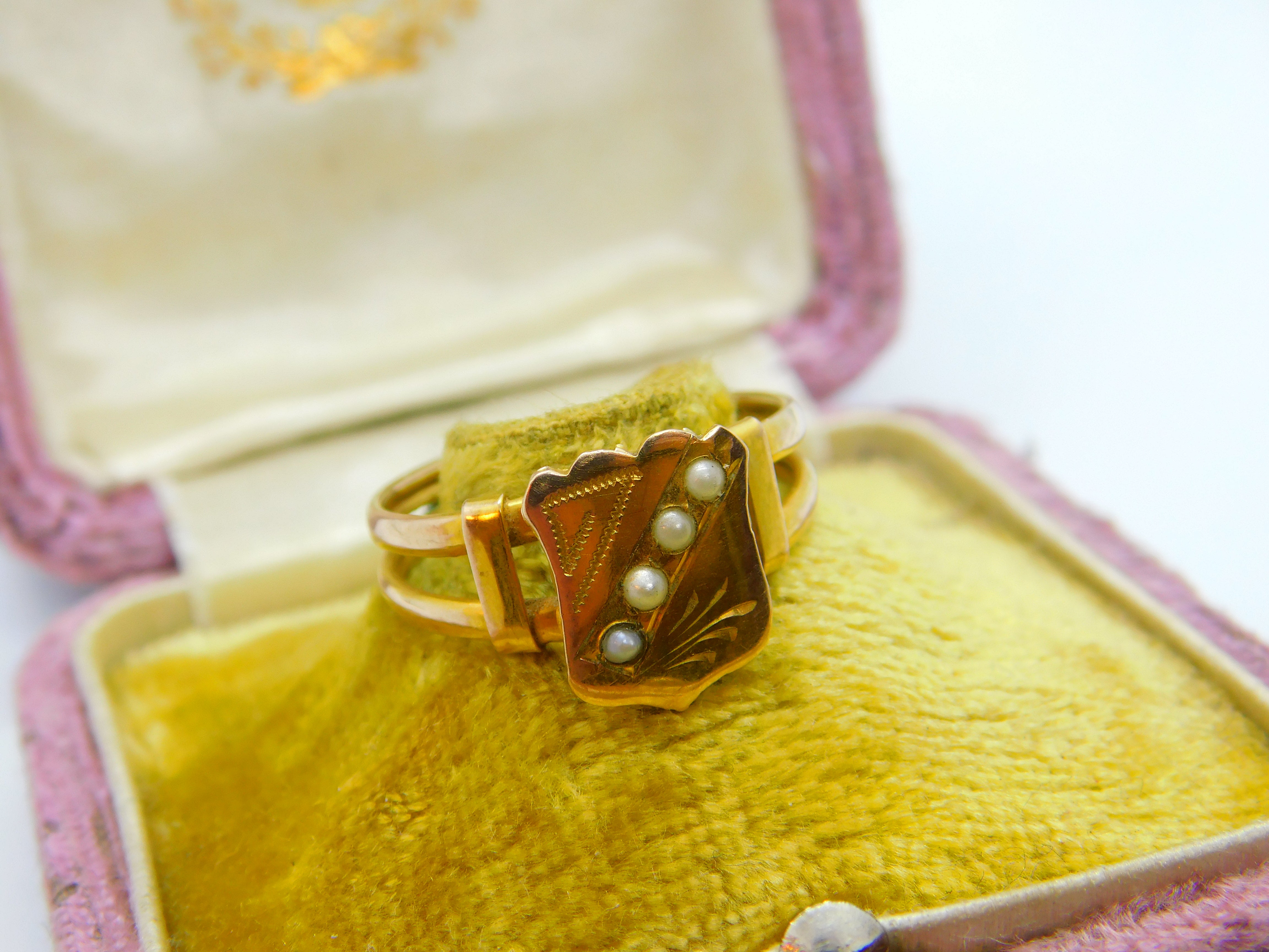 Victorian 12ct Yellow Gold & Seed Pearl Set Shield Ring Antique c1880