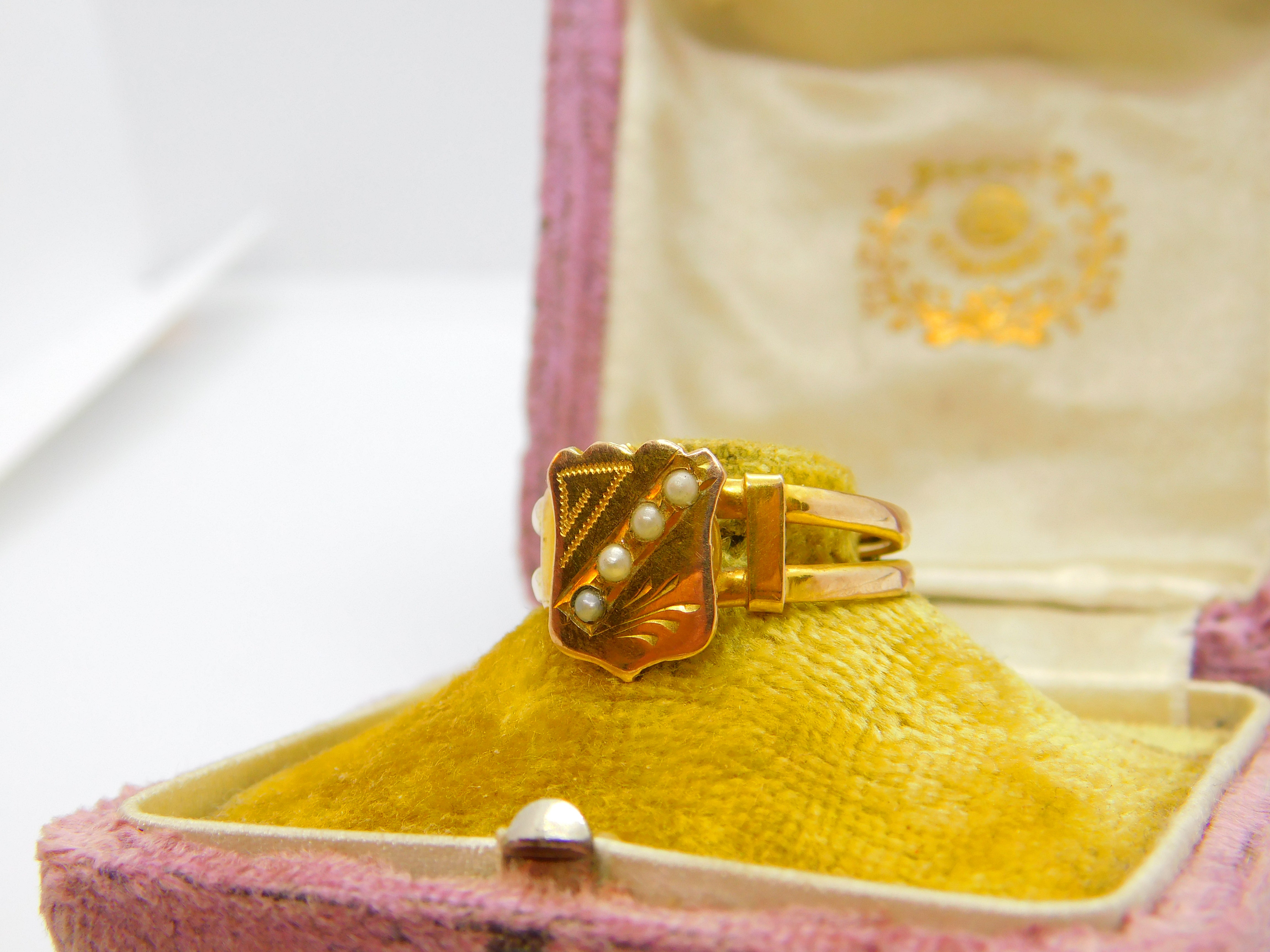 Details: A fantastic and wonderfully designed antique Victorian 12ct yellow gold shield form signet ring set with seed pearls hallmarked 12K to the interior band c1880 - an usual carat and lovely shape. This is a wonderful item that would make a perfect gift or addition to any collection. The BOX pictured is for PRESENTATION ONLY and is NOT included in the listings but used to frame the pictures unless specifically stated otherwise.