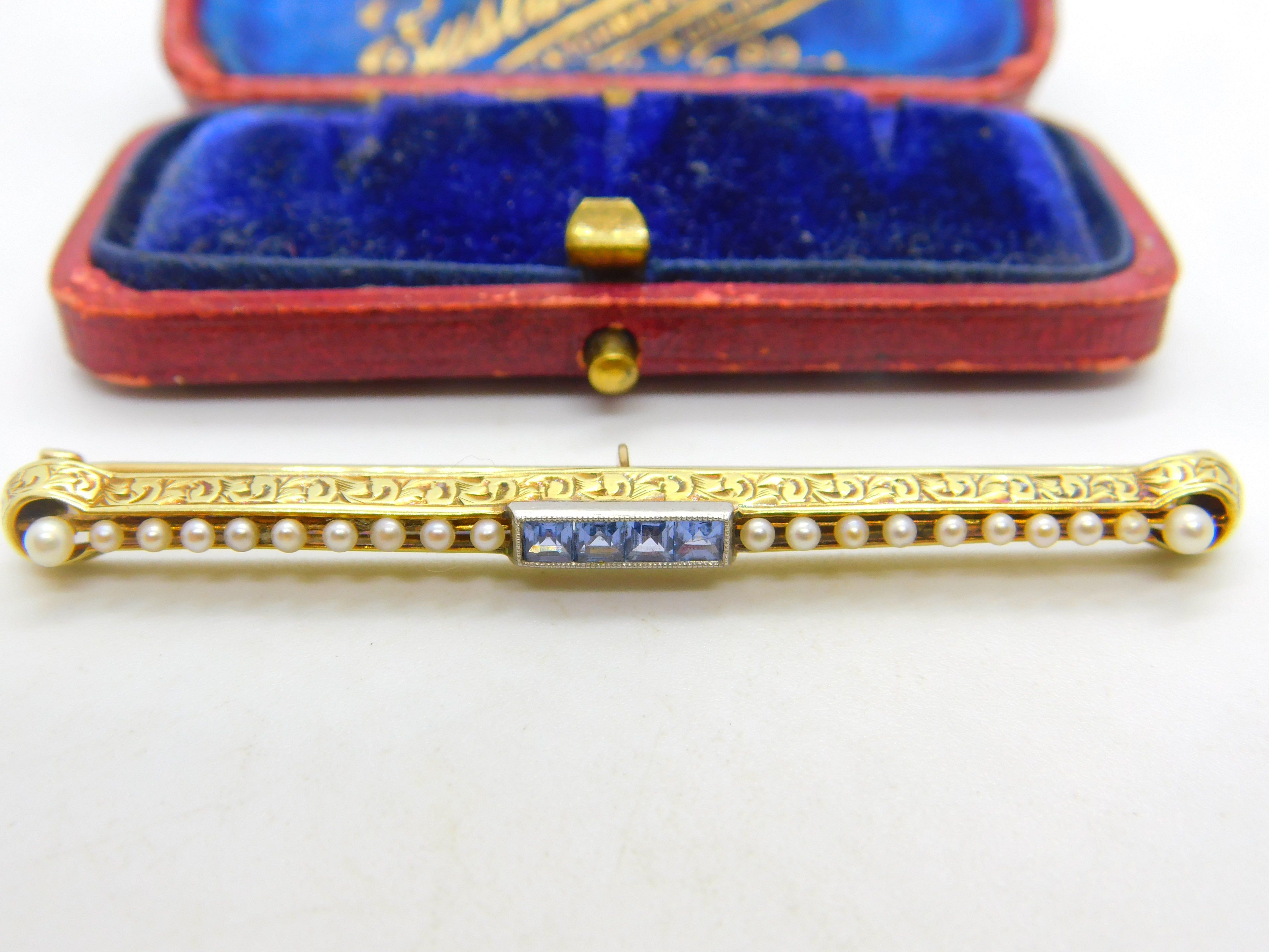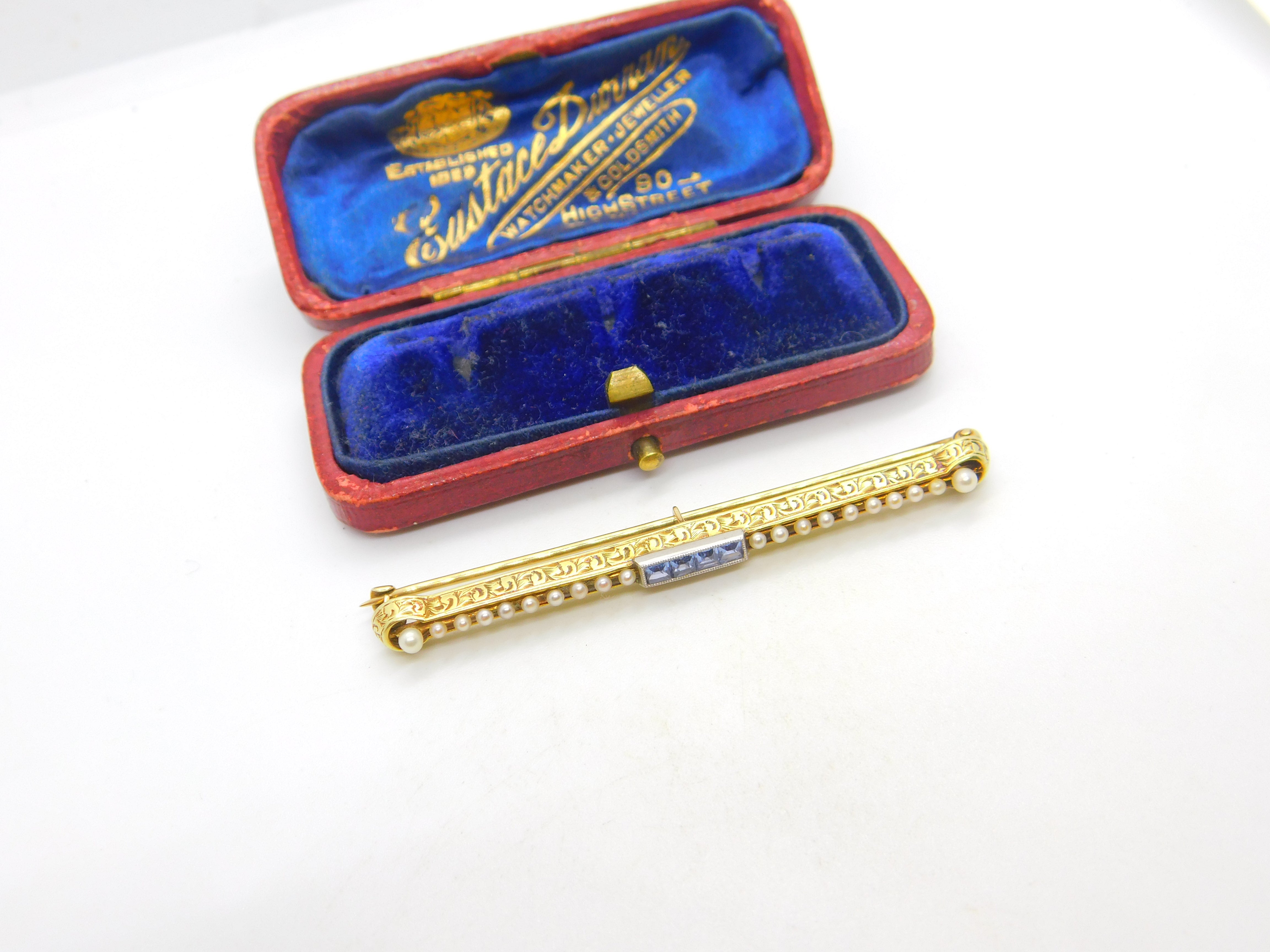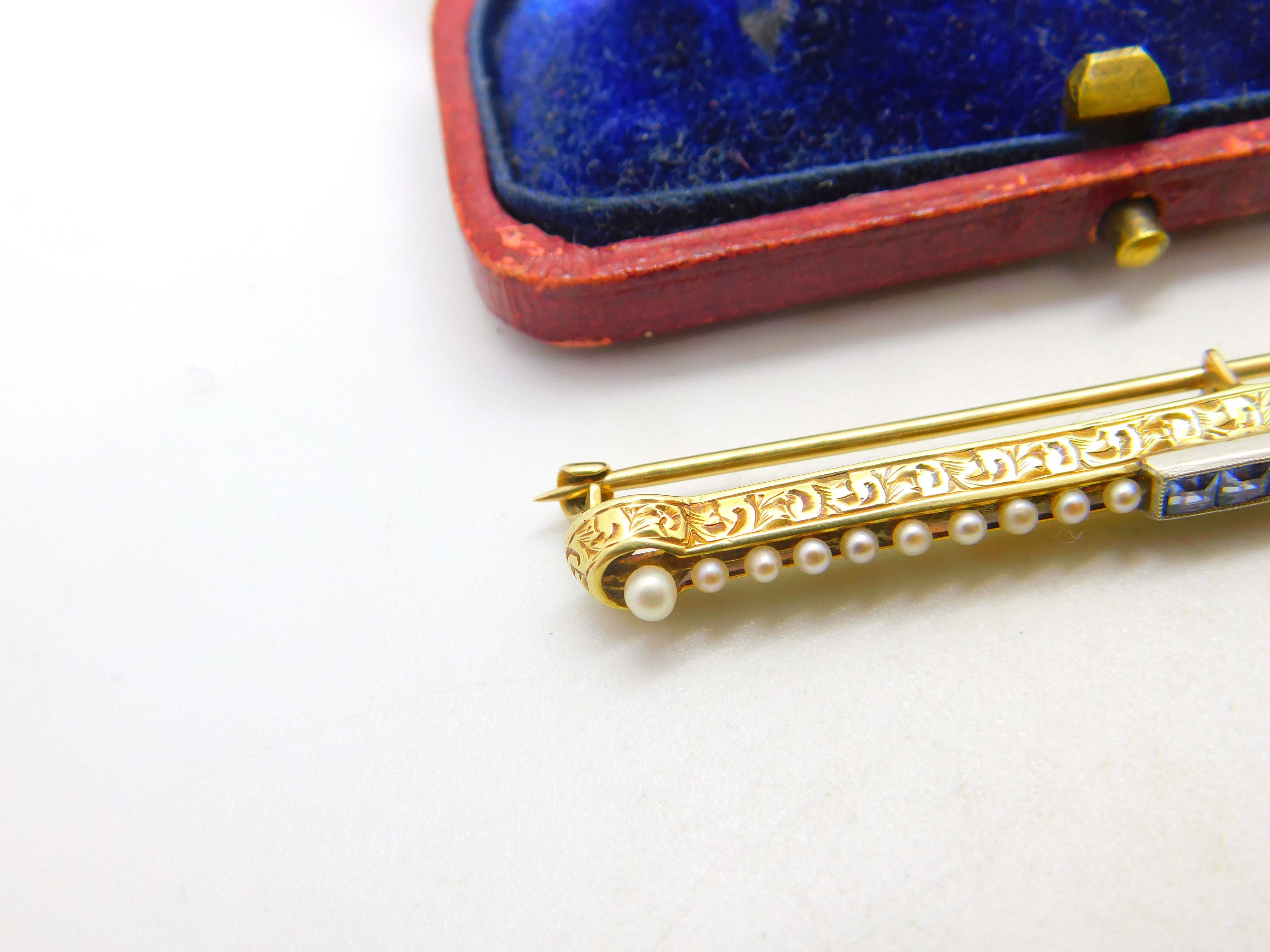 Victorian 14ct Yellow Gold, Seed Pearl & Sapphire Set Bar Brooch c1880 Antique