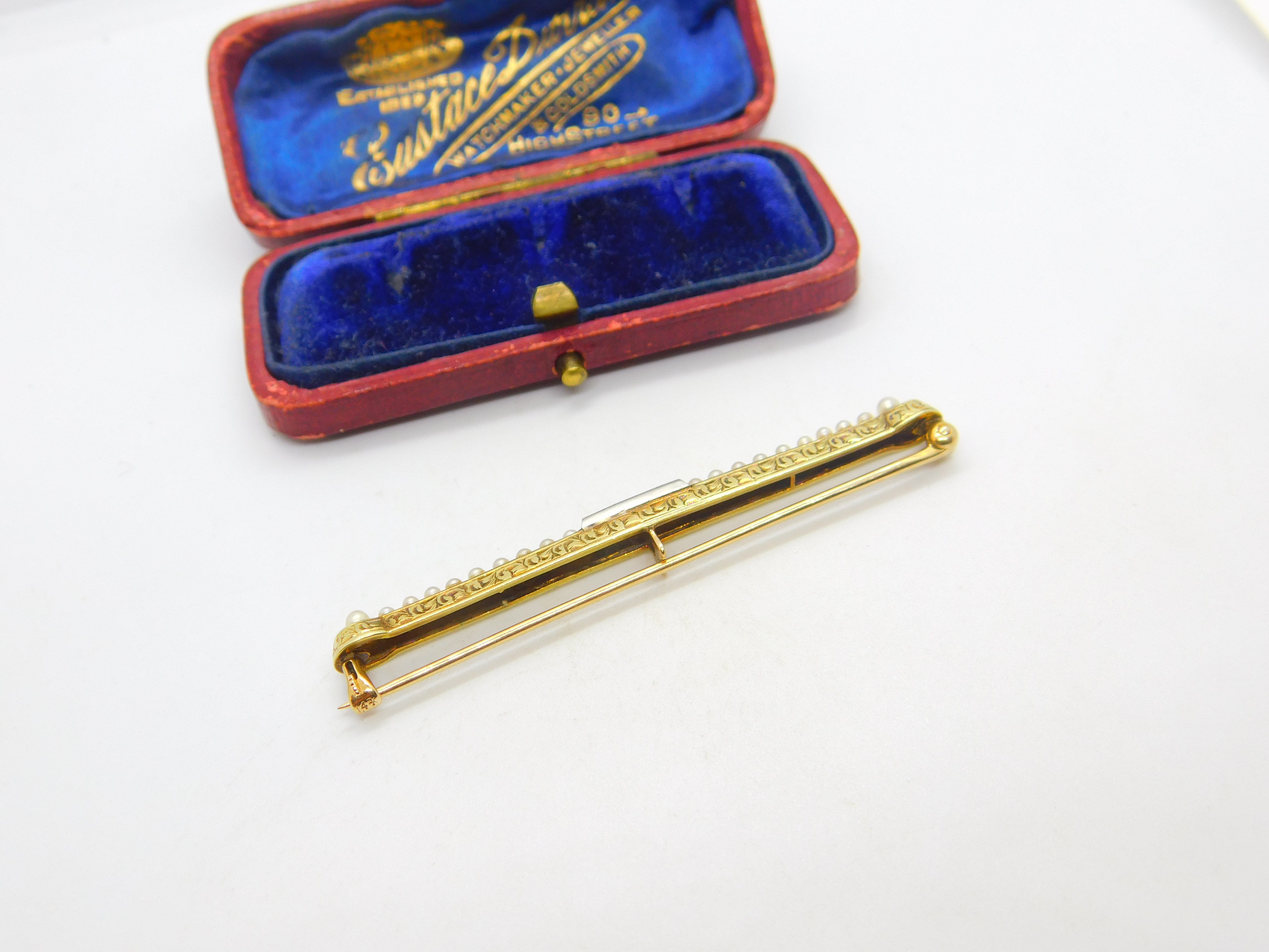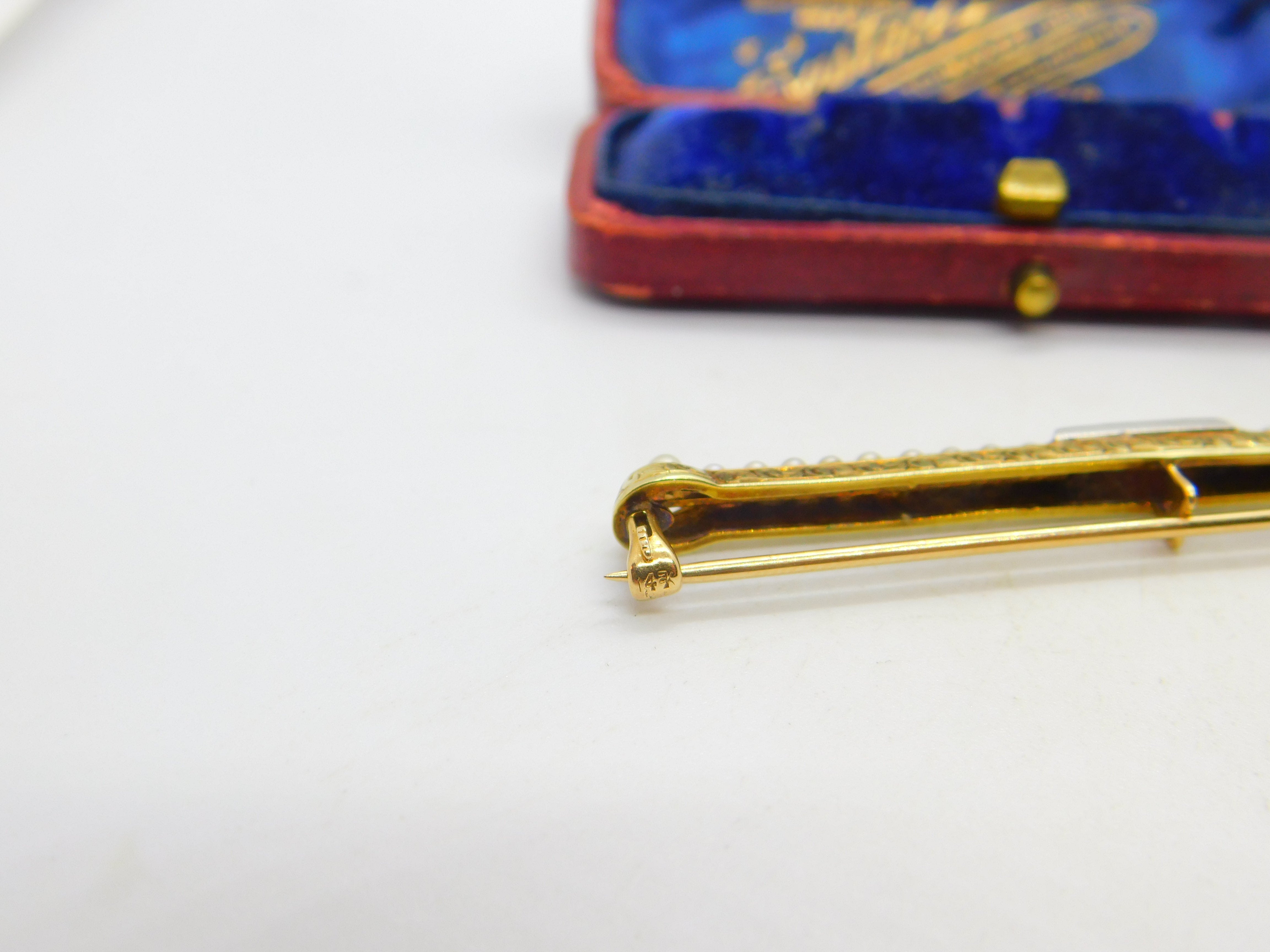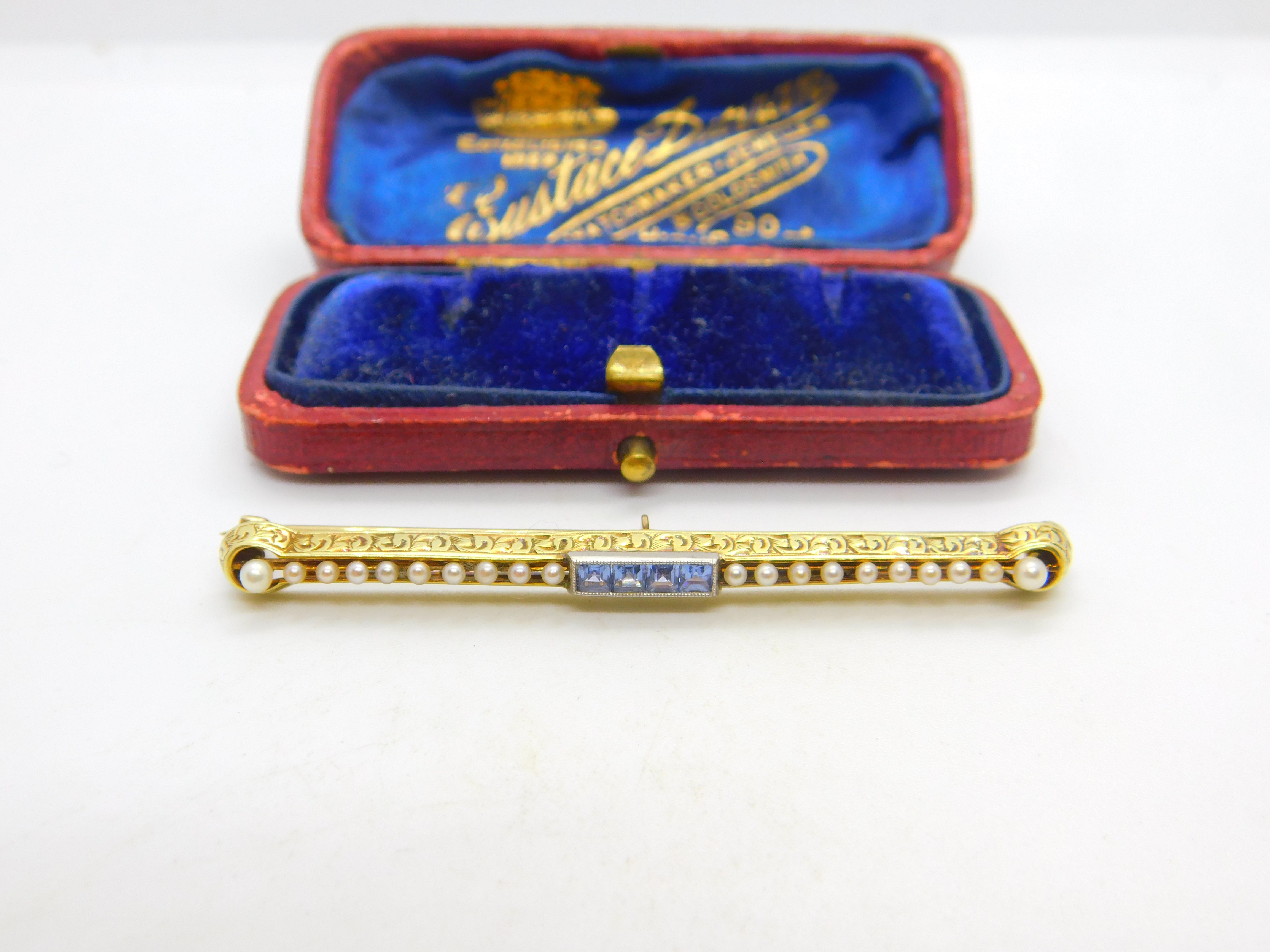 Victorian 14ct Yellow Gold, Seed Pearl & Sapphire Set Bar Brooch c1880 Antique