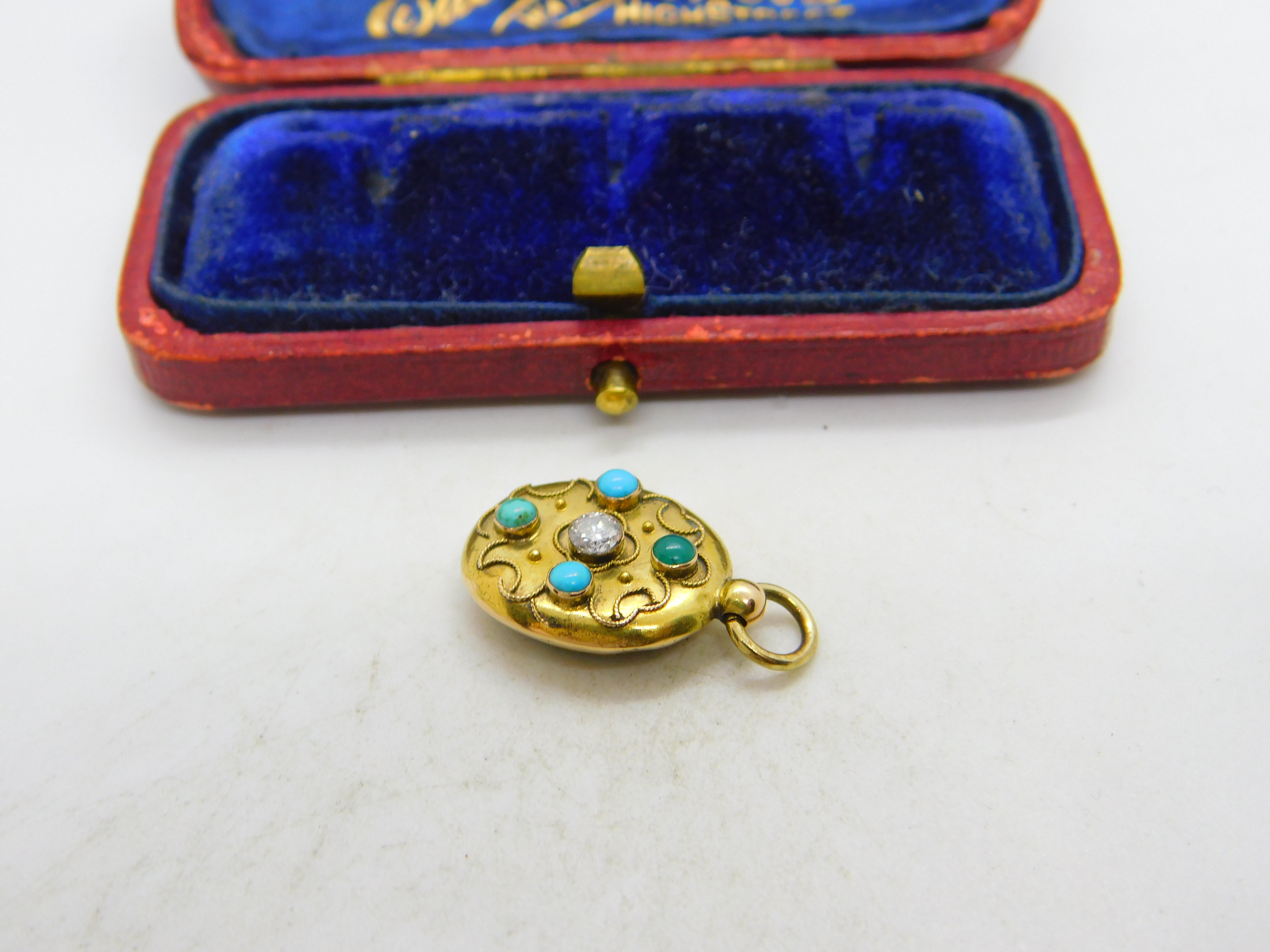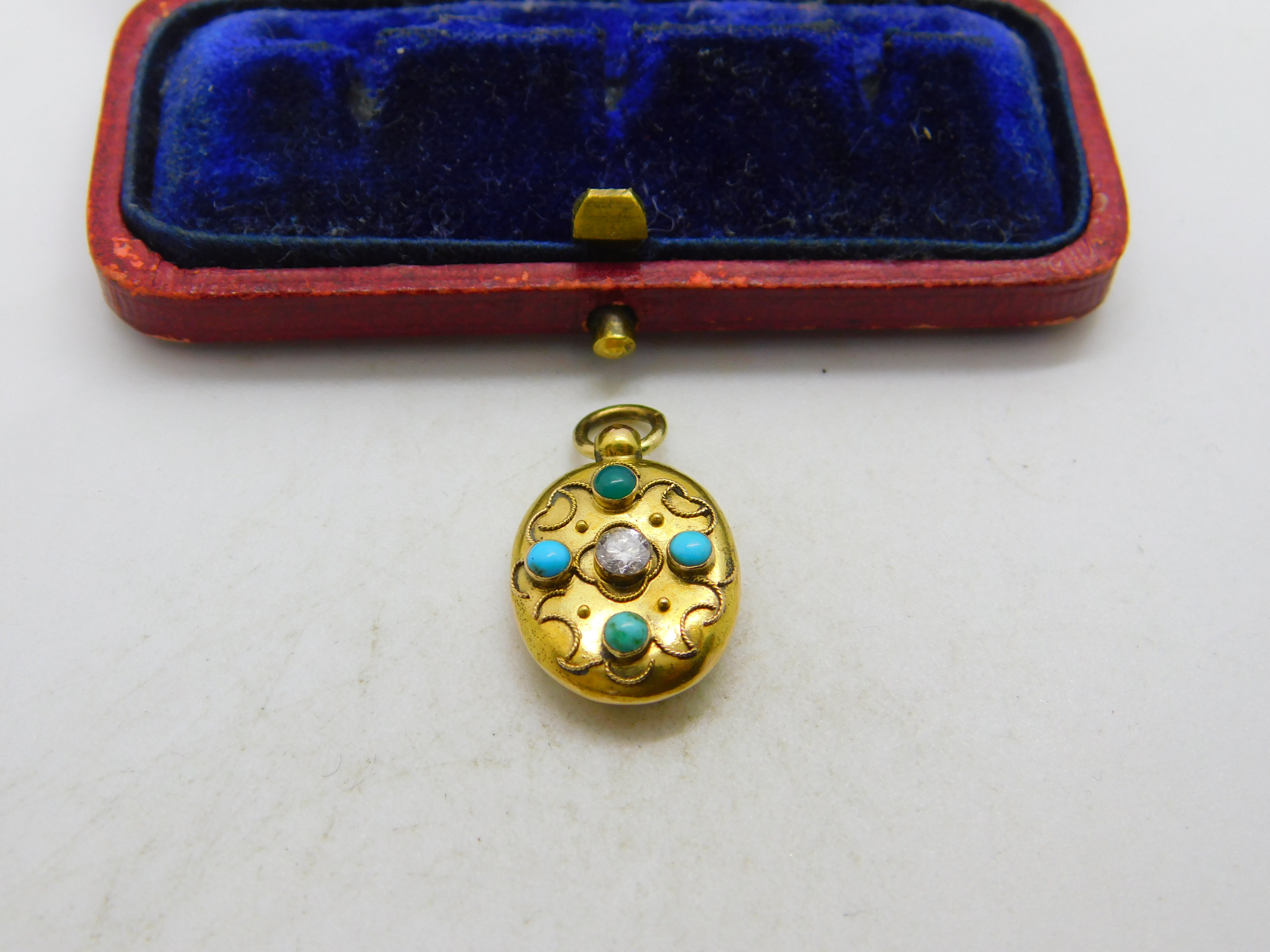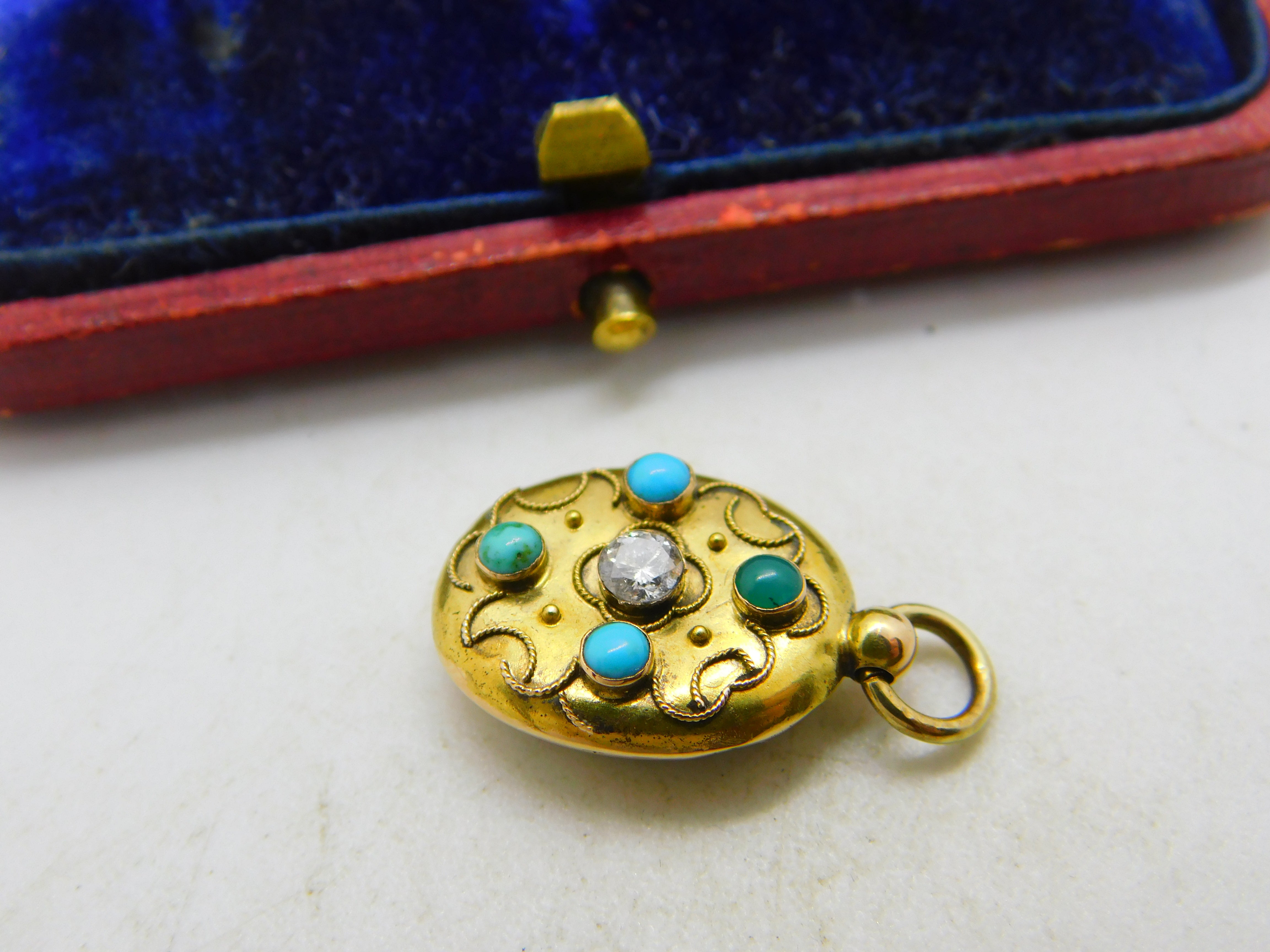 Victorian 15ct Gold, 0.1ct Diamond & Turquoise Single Locket Pendant c1880