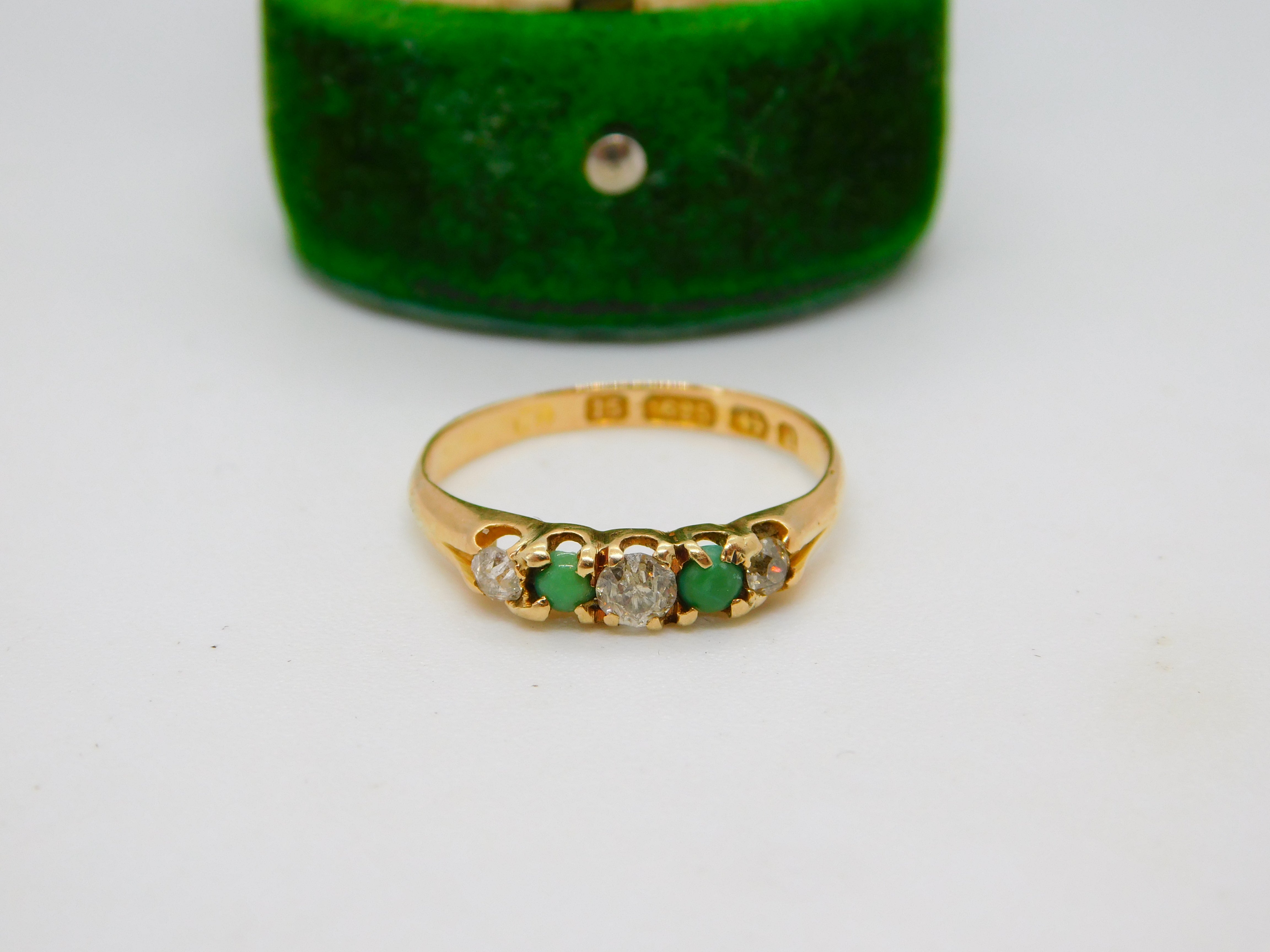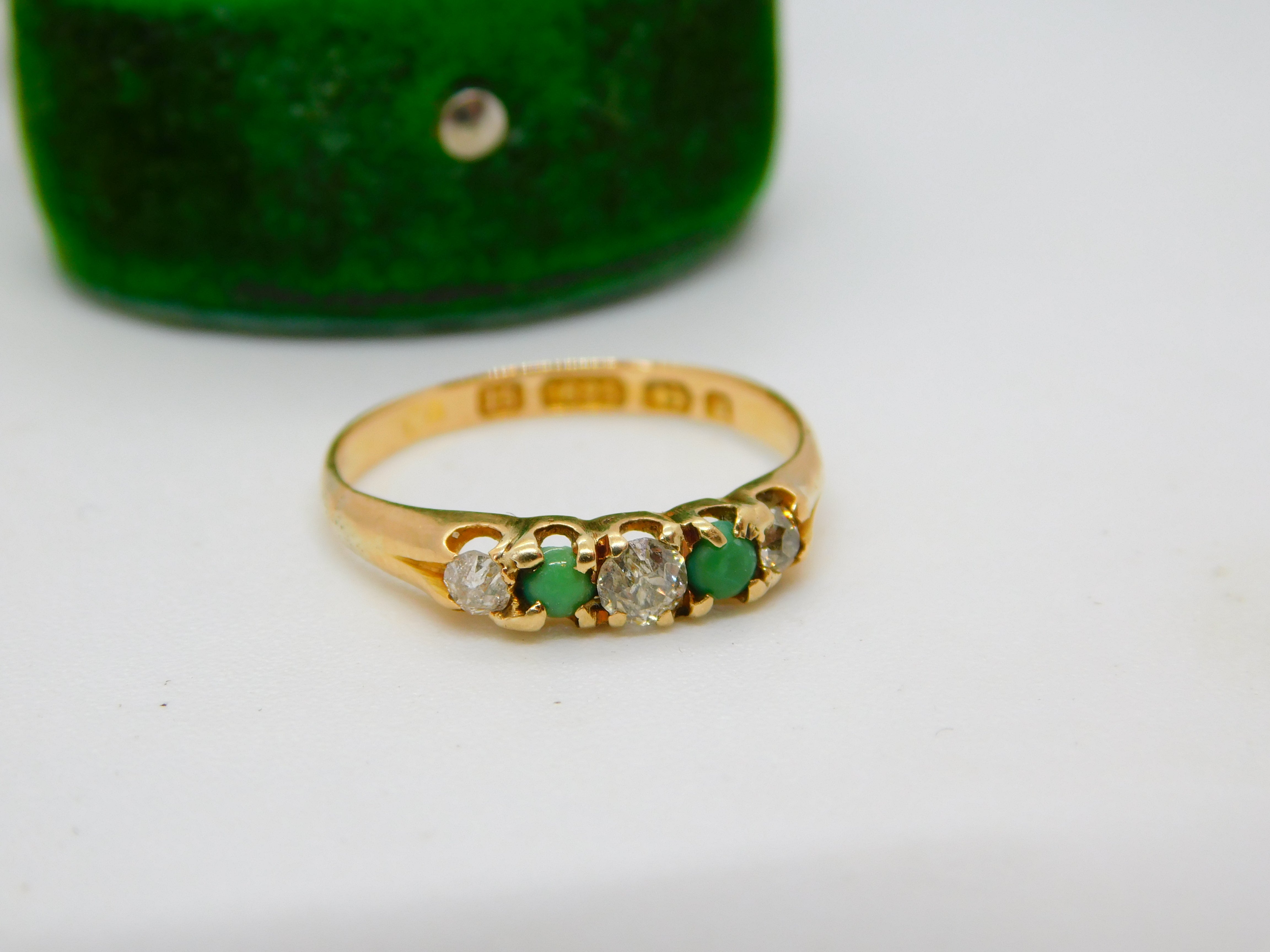 Details: A fantastic and wonderfully designed antique Victorian 15ct yellow gold boat ring set with diamonds and turquoise stones, the central stone approximately 0.1ct hallmarked clearly Birmingham 1876 to the interior band. All the stones have been tested. This is a wonderful item that would make a perfect gift or addition to any collection. The BOX pictured is for PRESENTATION ONLY and is NOT included in the listings but used to frame the pictures unless specifically stated otherwise.