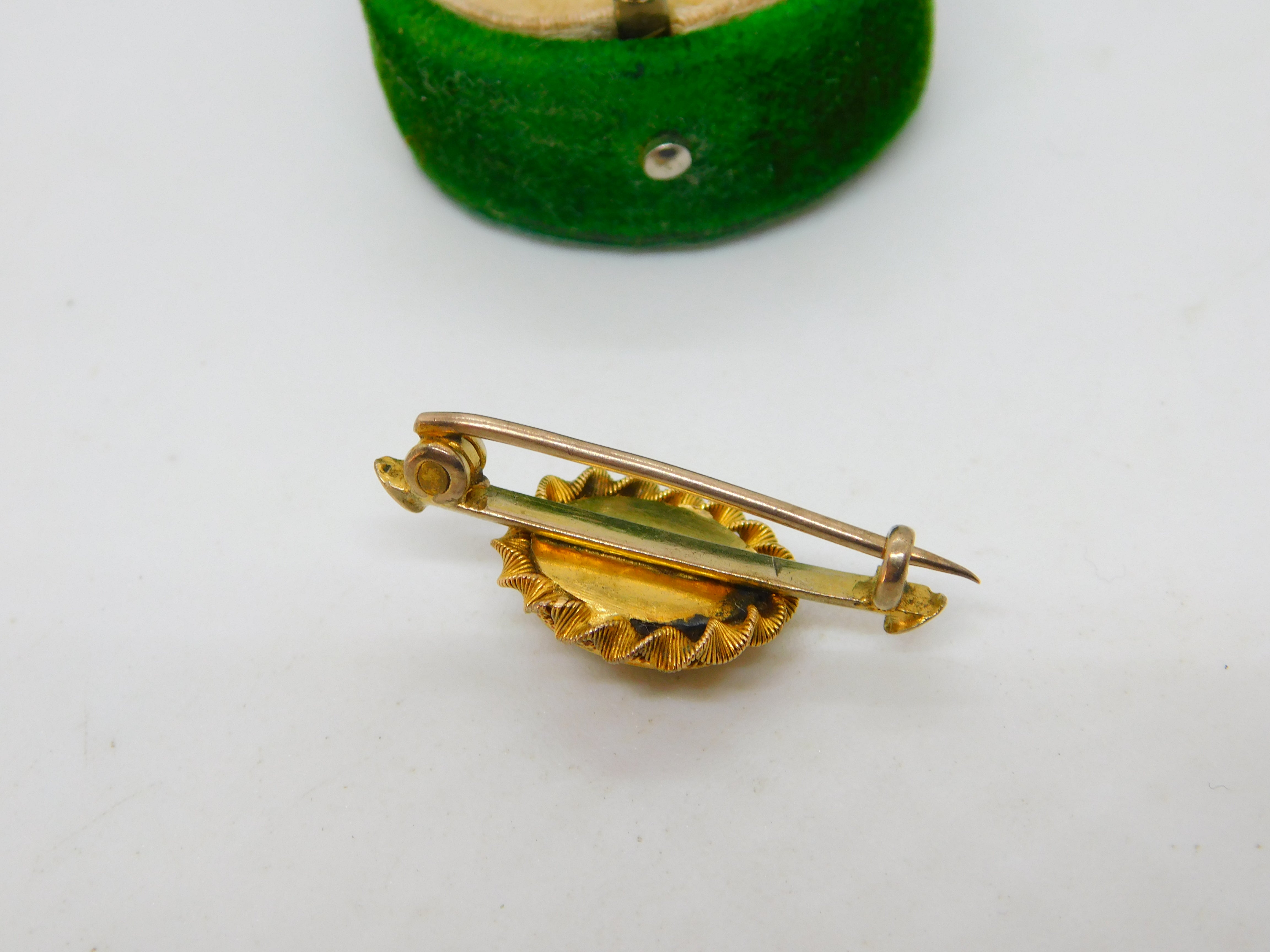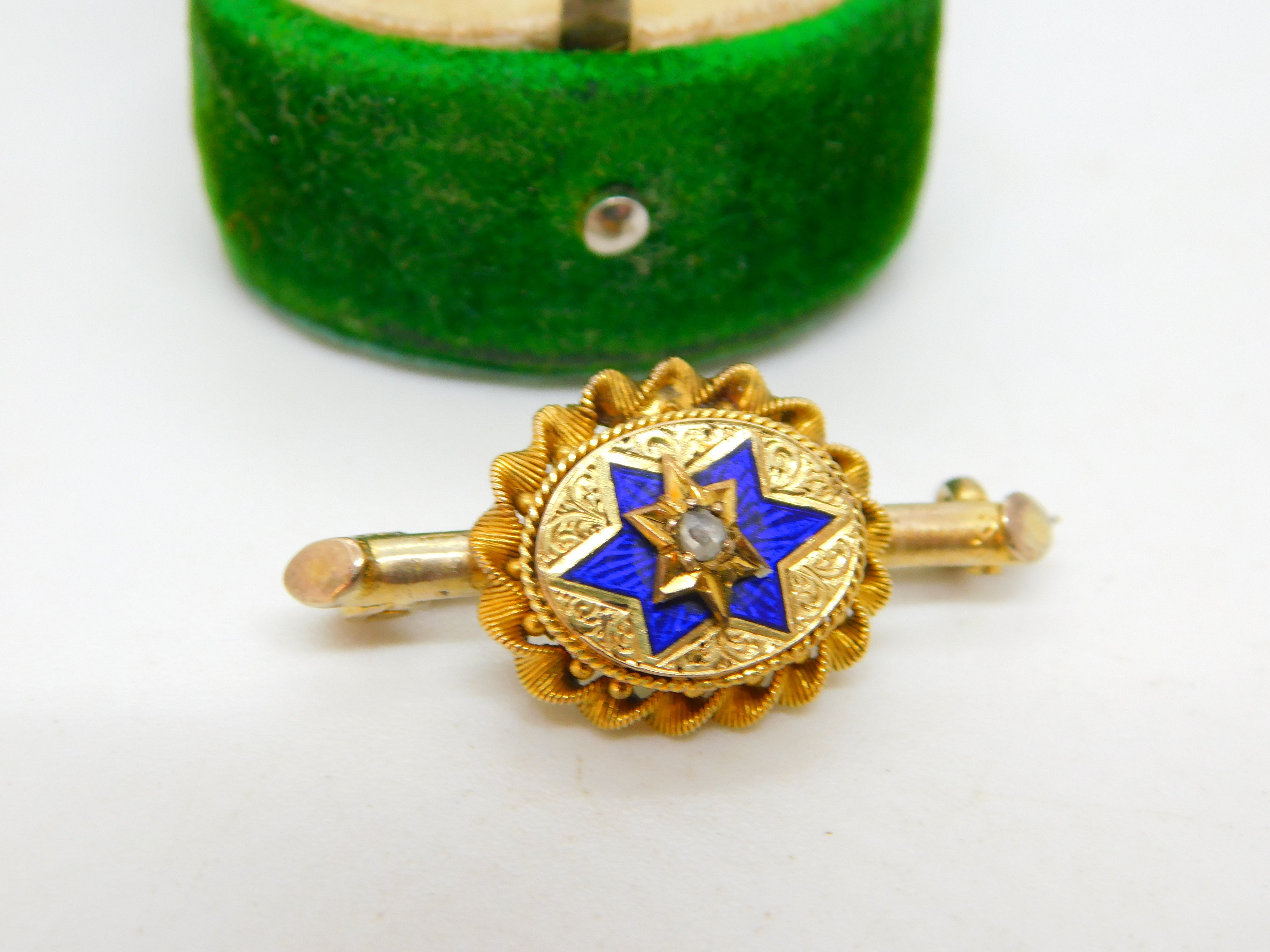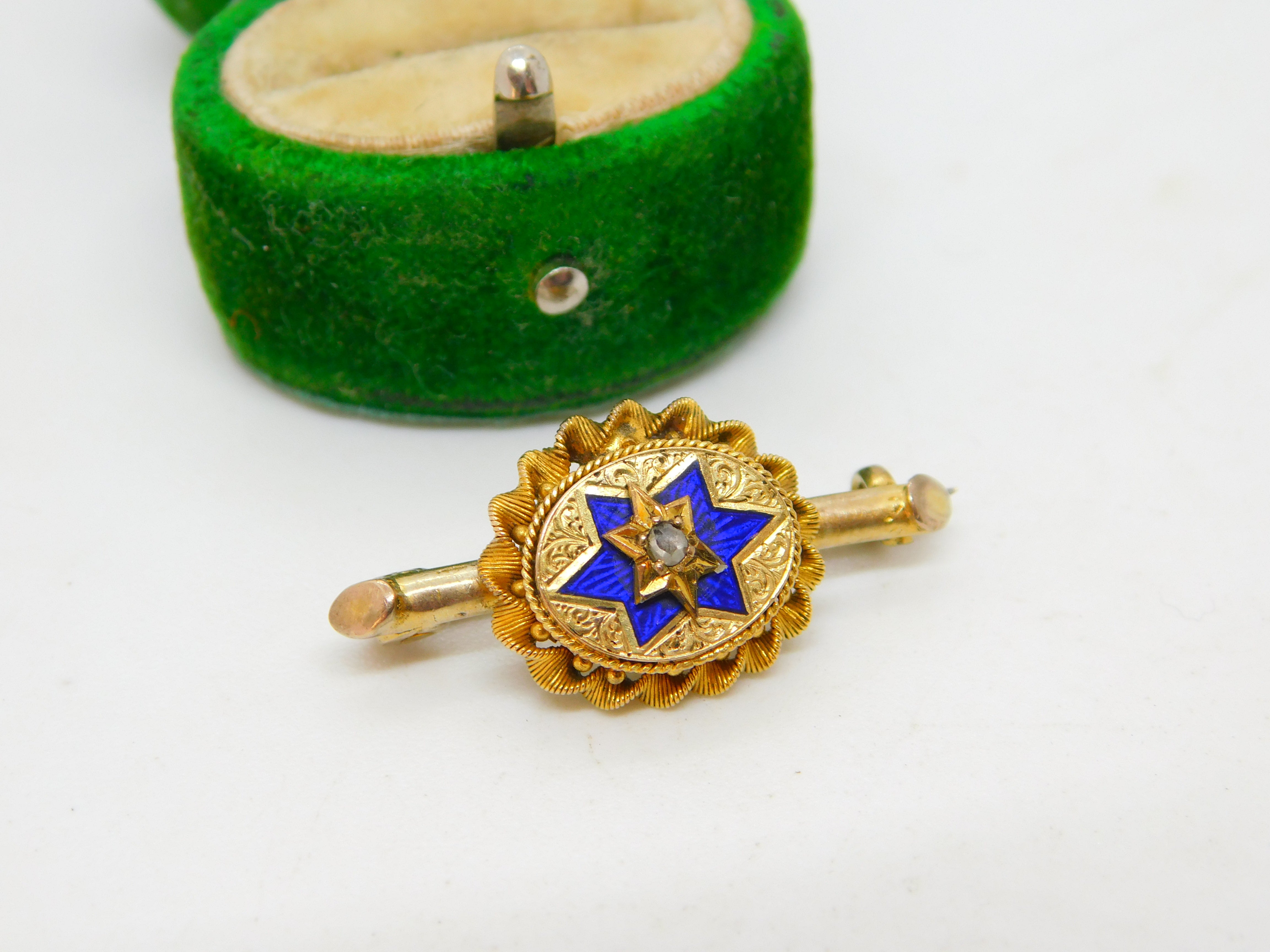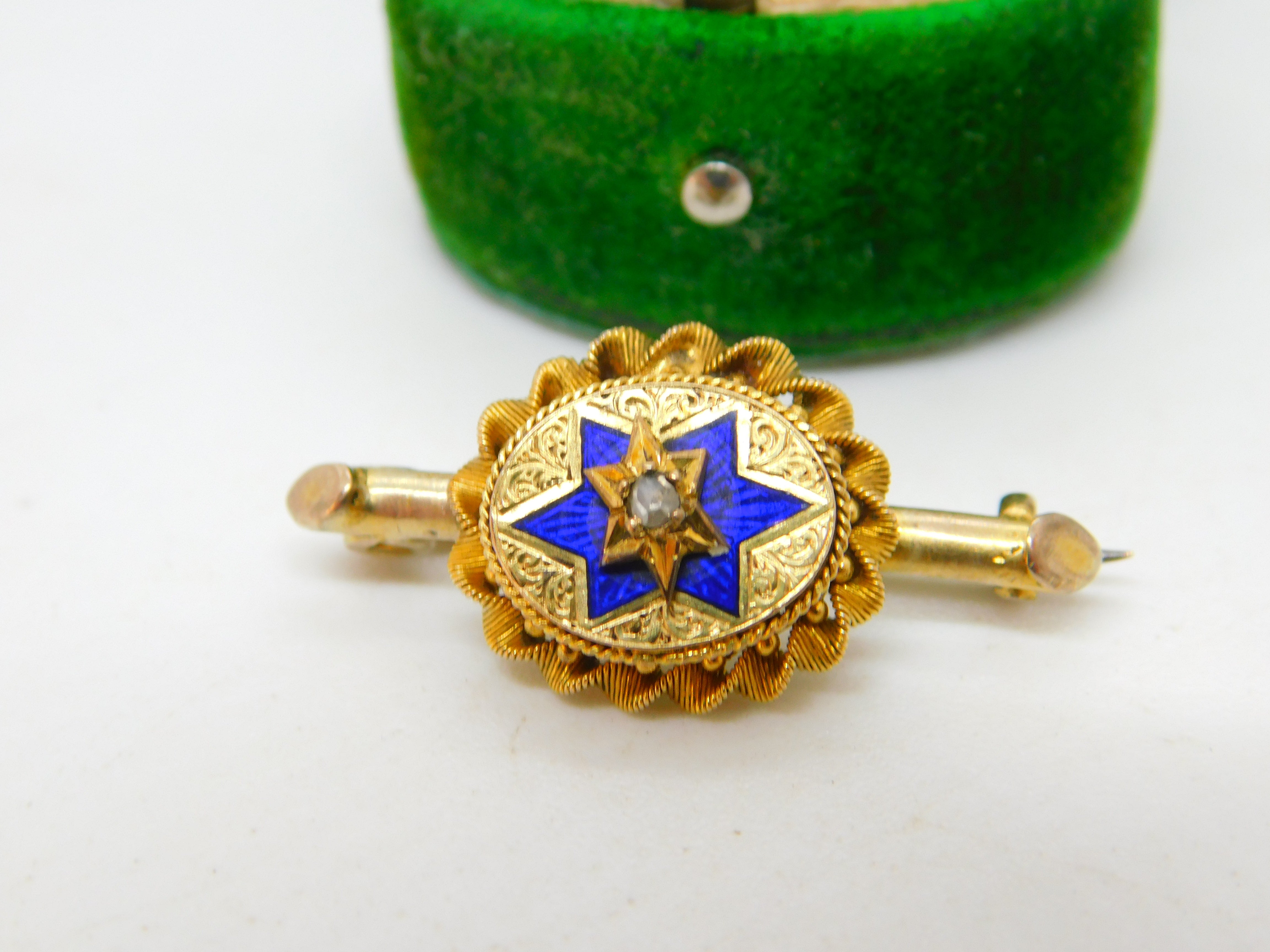 Victorian 15ct Gold, Blue Enamel & 0.1ct Old Cut Diamond Brooch Antique c1860