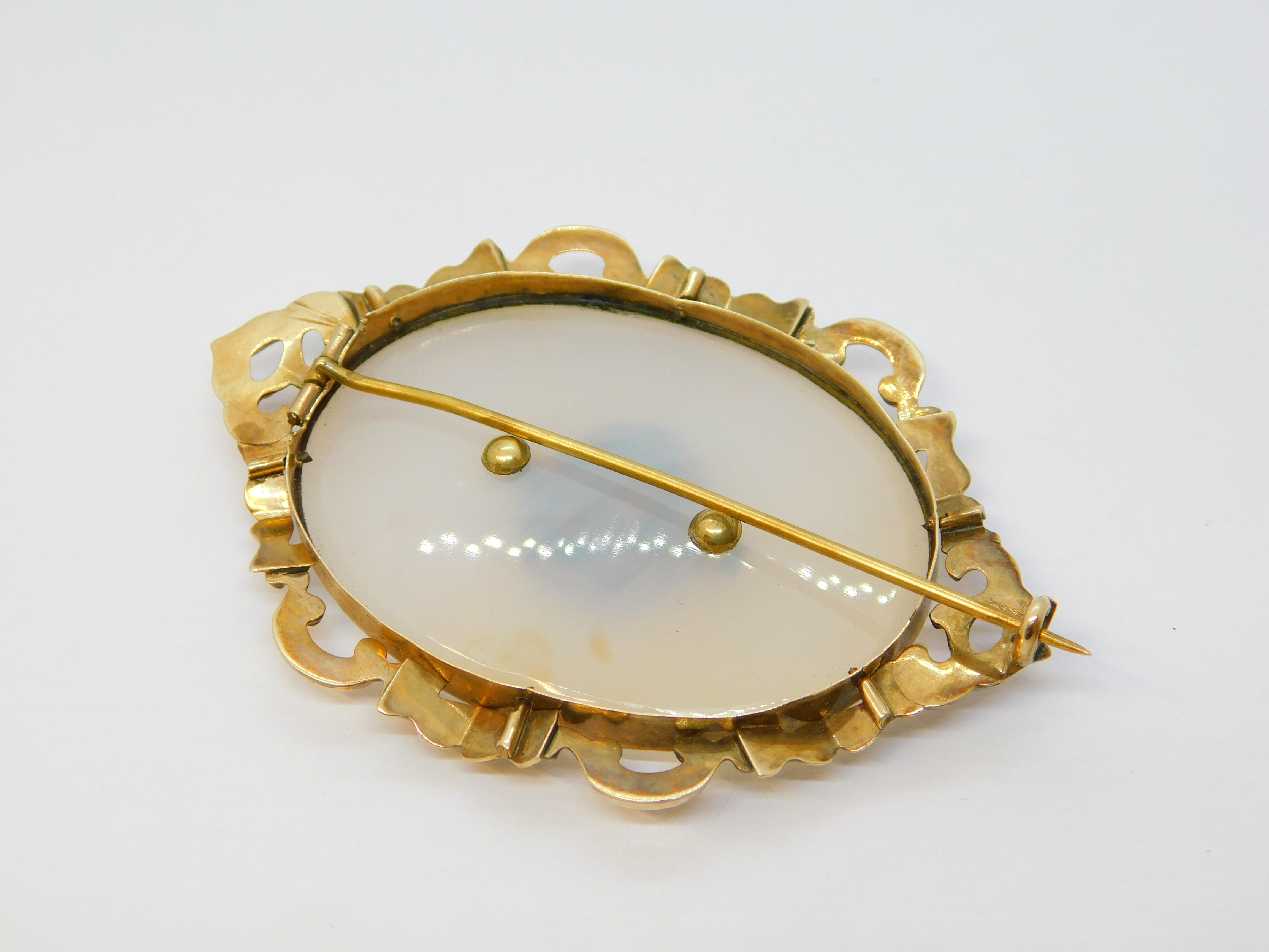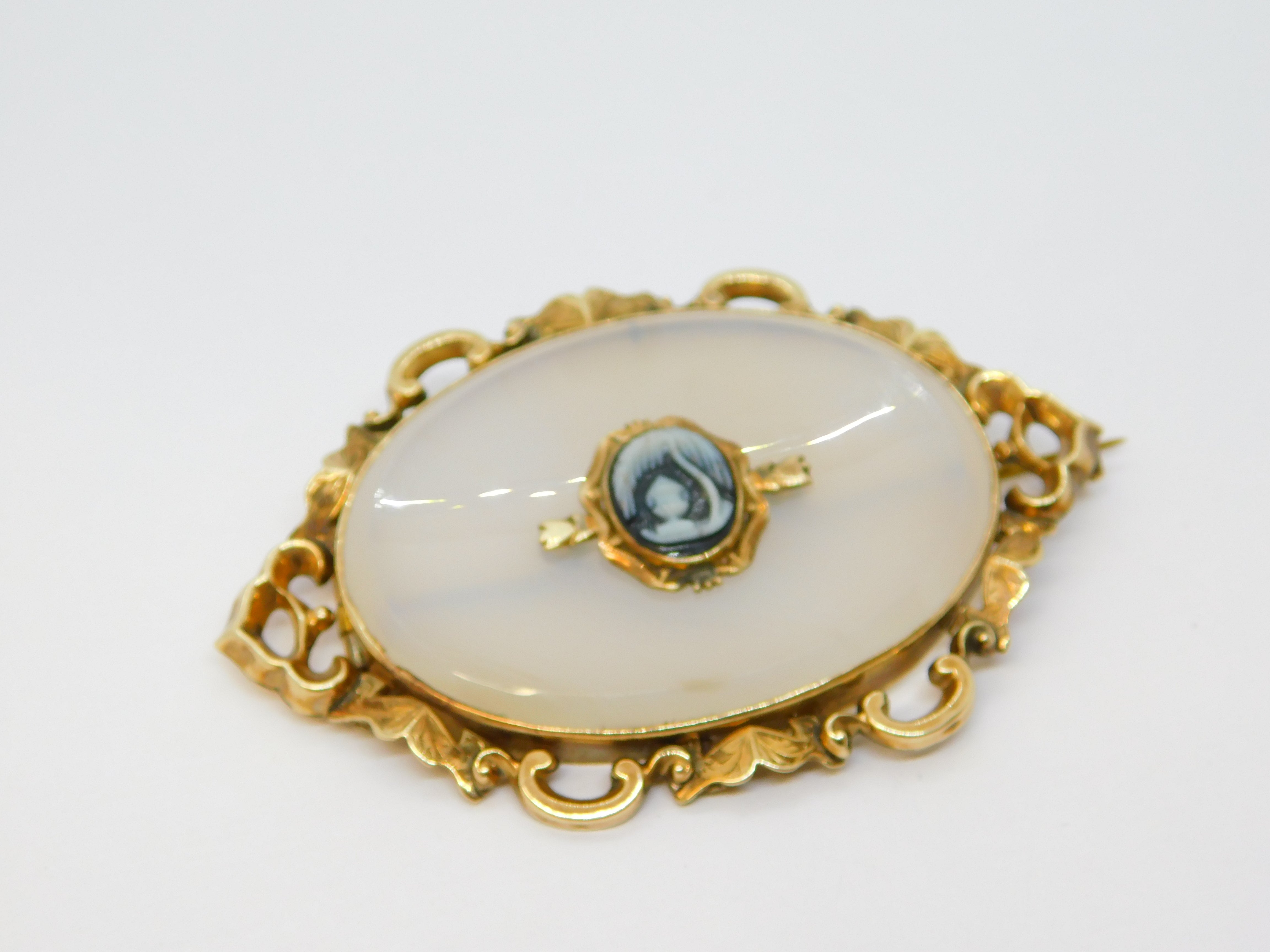 Details: A fantastic and wonderfully designed antique mid-Victorian 15ct yellow gold large mourning brooch set with a small carved hardstone plaque depicting an urn underneath a tree symbolic of mourning, set within a large panel of chalcedony agate, the gold has been XRF tested as it is unmarked. This is a wonderful item that would make a perfect gift or addition to any collection. The BOX pictured is for PRESENTATION ONLY and is NOT included in the listings but used to frame the pictures unless specifically stated otherwise.