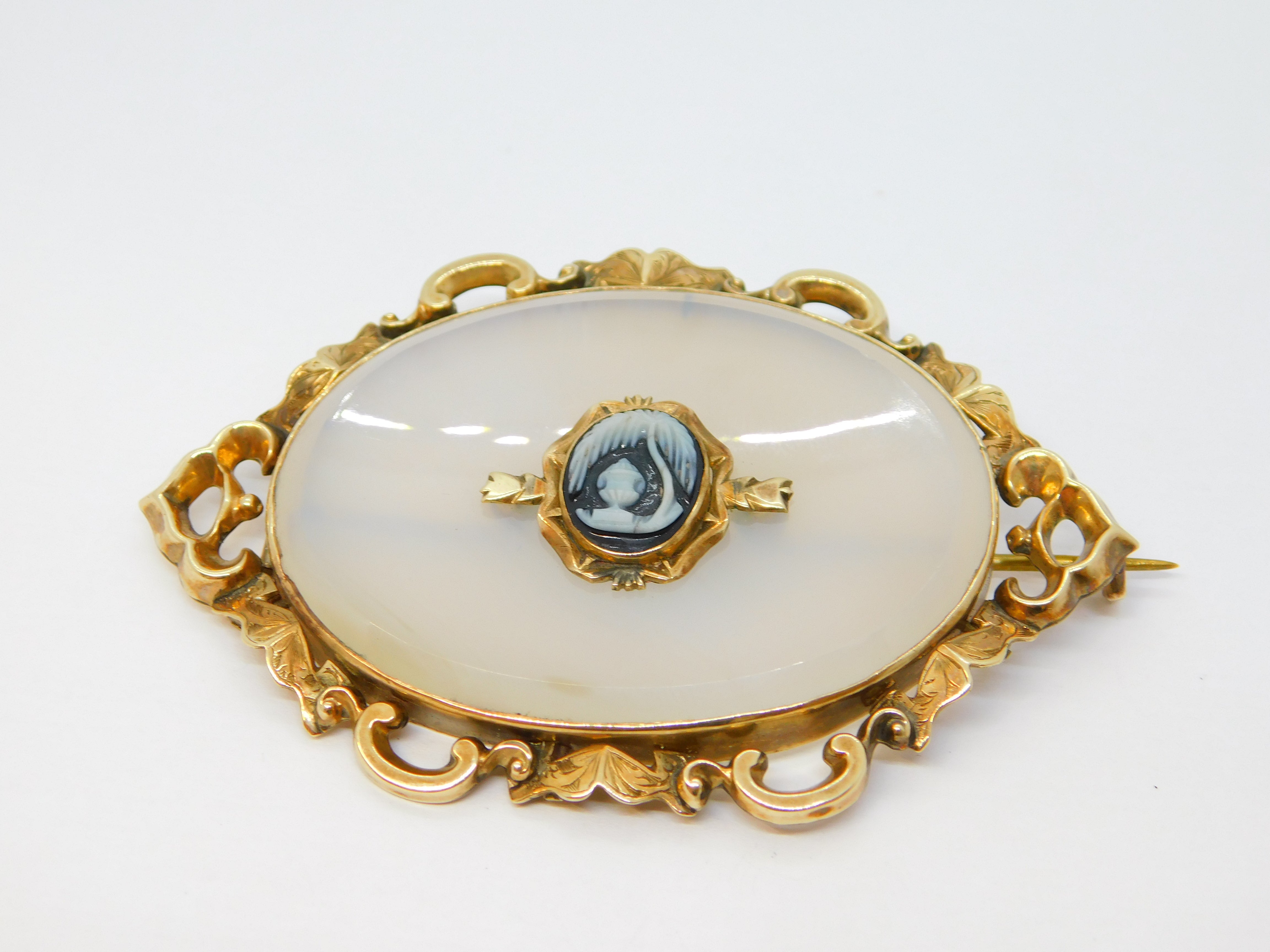 Victorian 15ct Gold, Chalcedony Agate & Hardstone Urn Mourning Brooch Antique c1860
