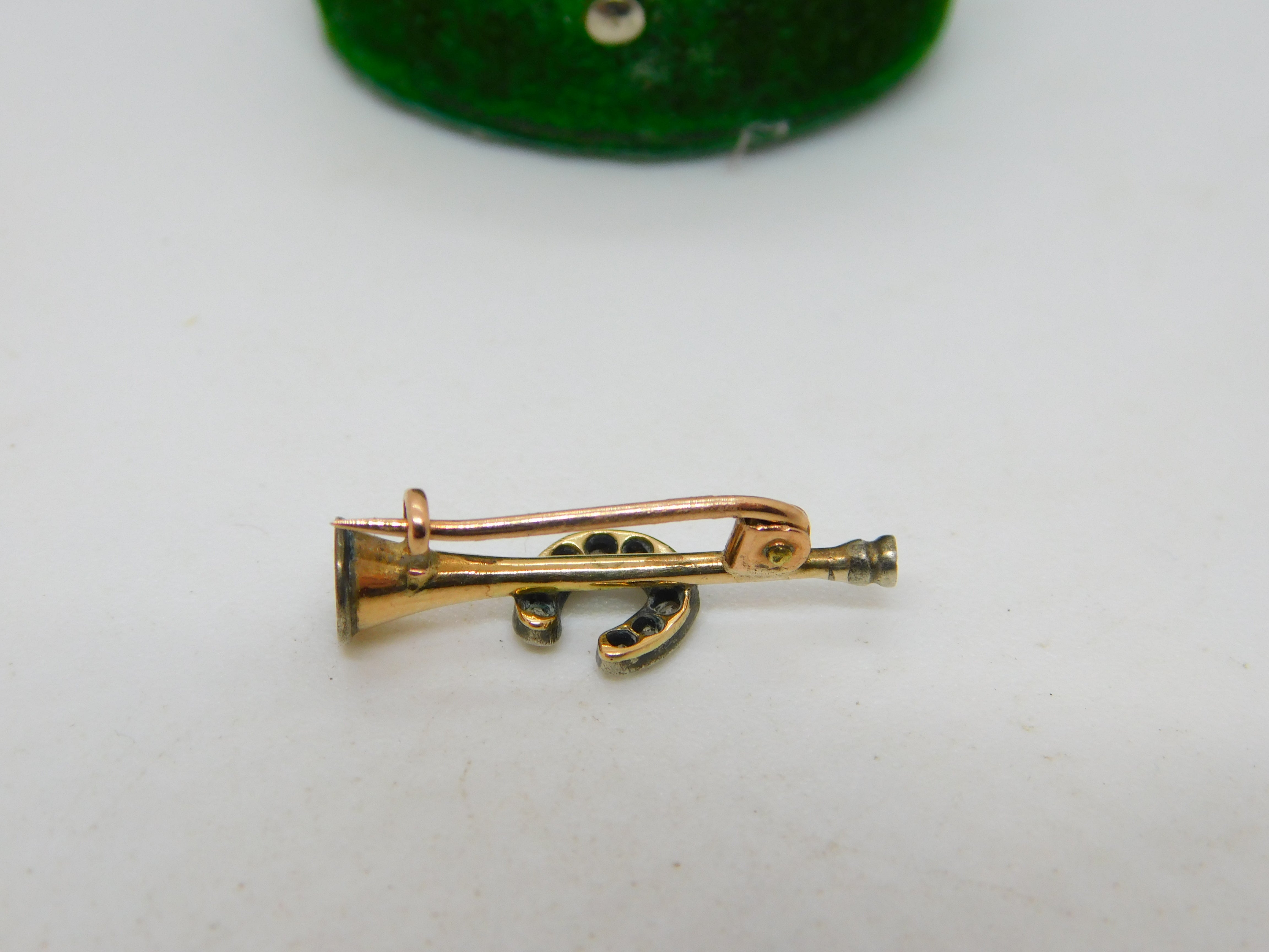 Victorian 15ct Gold & Diamond Horseshoe & Hunting Horn Brooch Antique c1840