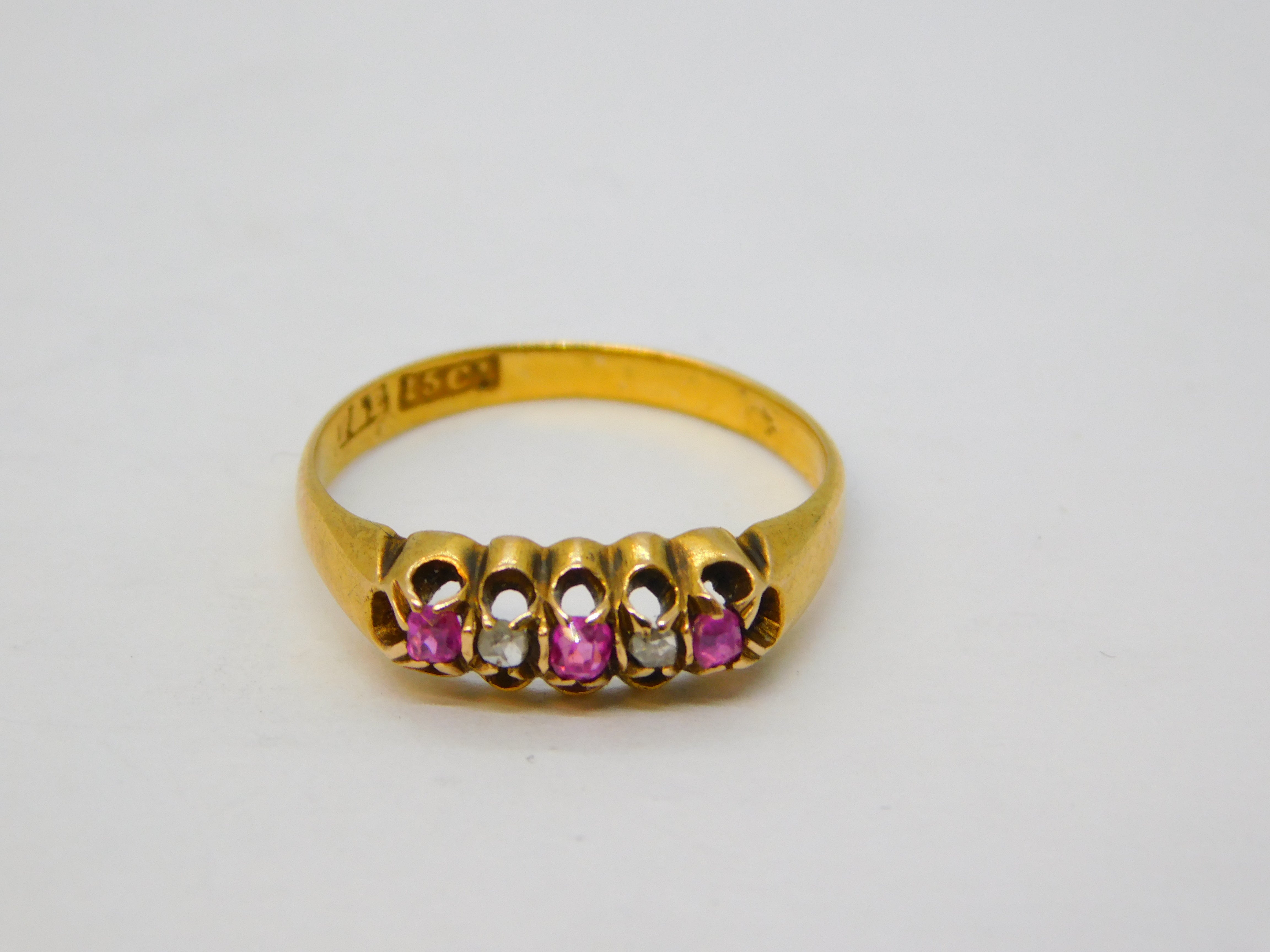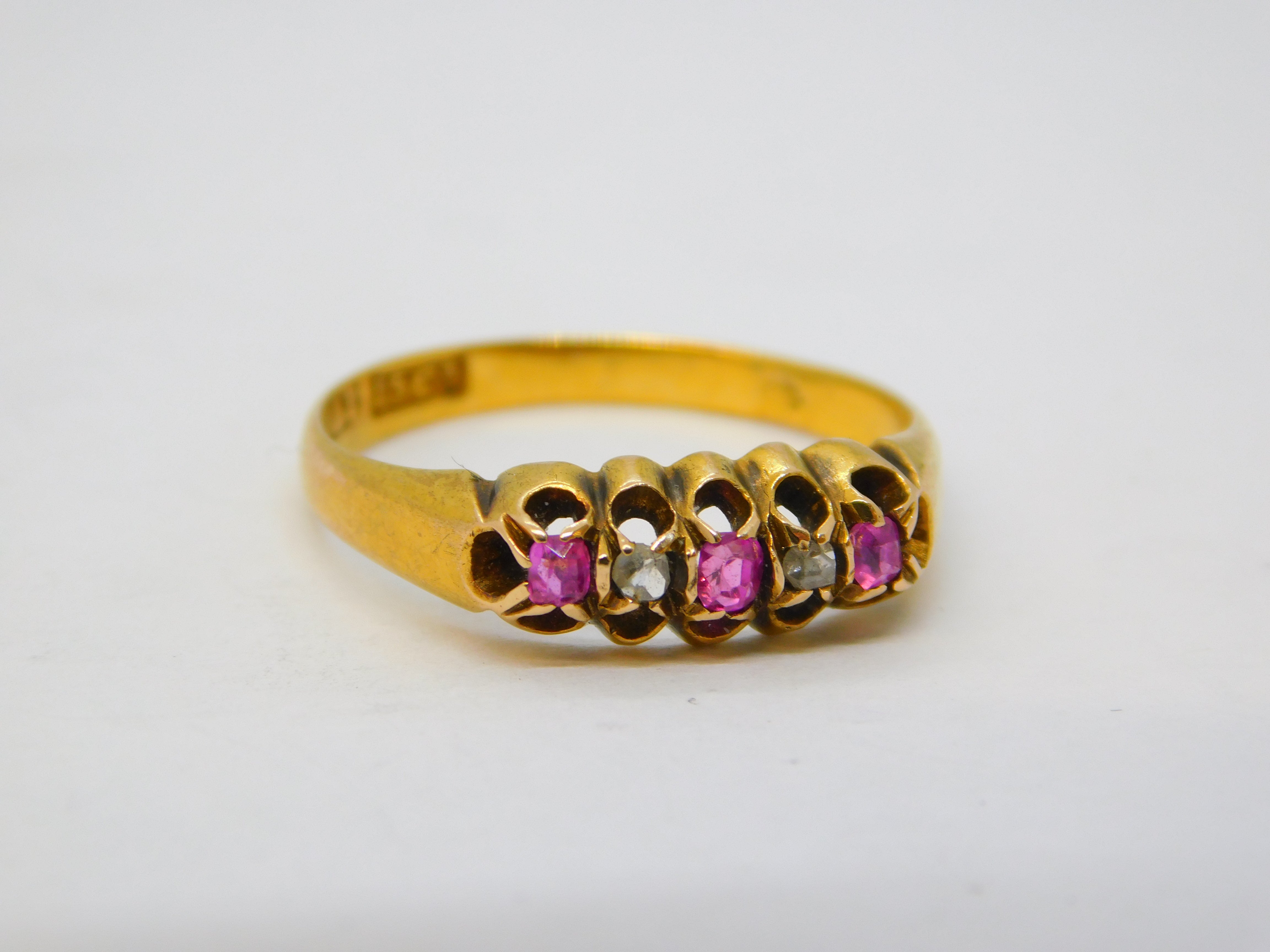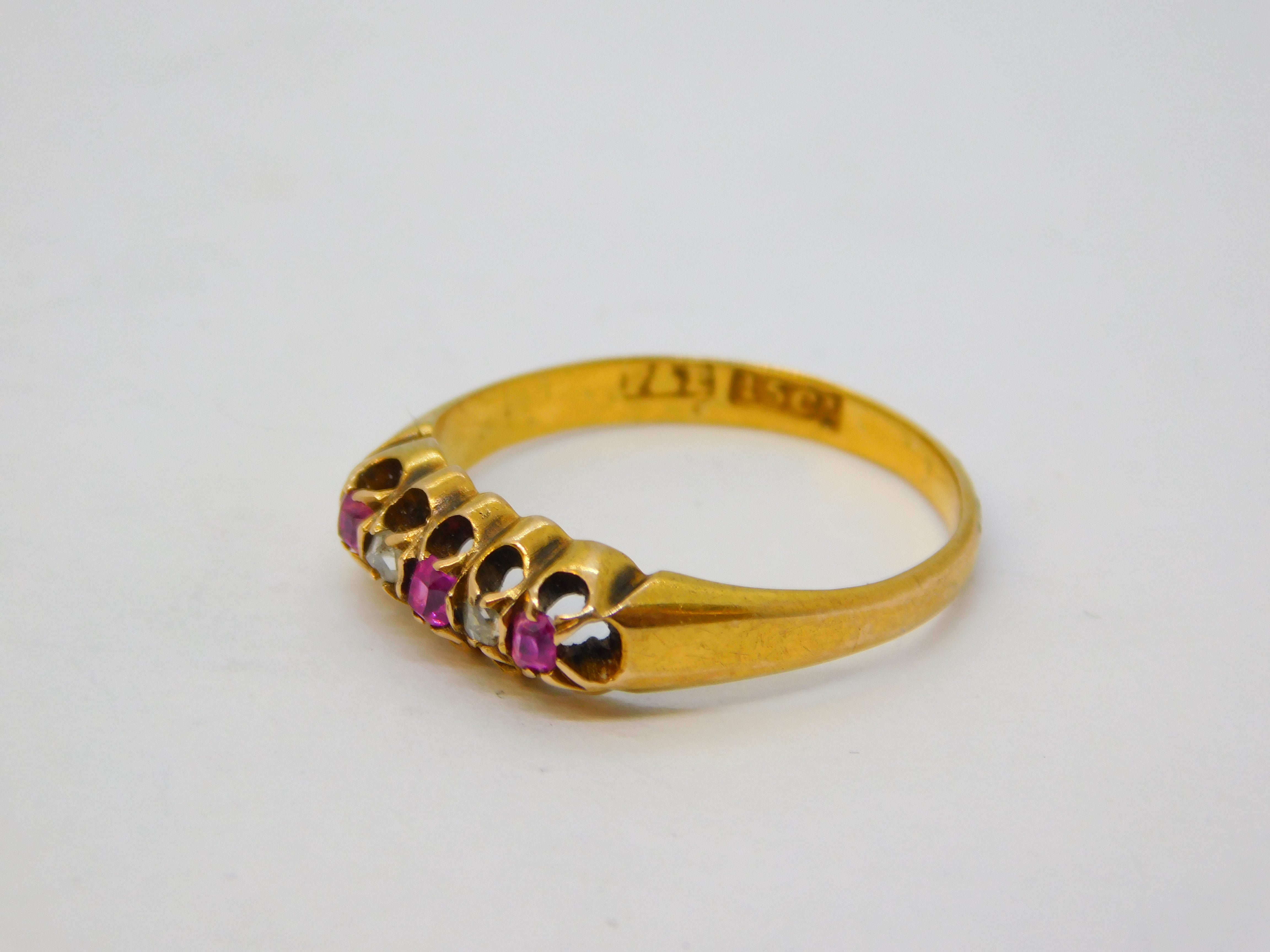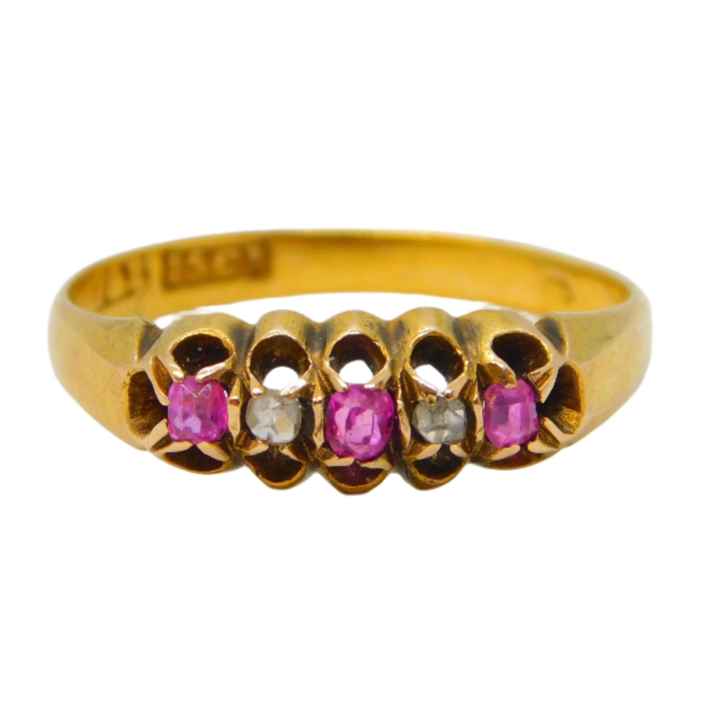 Details: A fantastic and wonderfully designed antique Victorian 15ct yellow gold boat ring set with graduating ruby & diamond stones hallmarked to the interior c1890, the stones have been tested. This is a wonderful item that would make a perfect gift or addition to any collection.