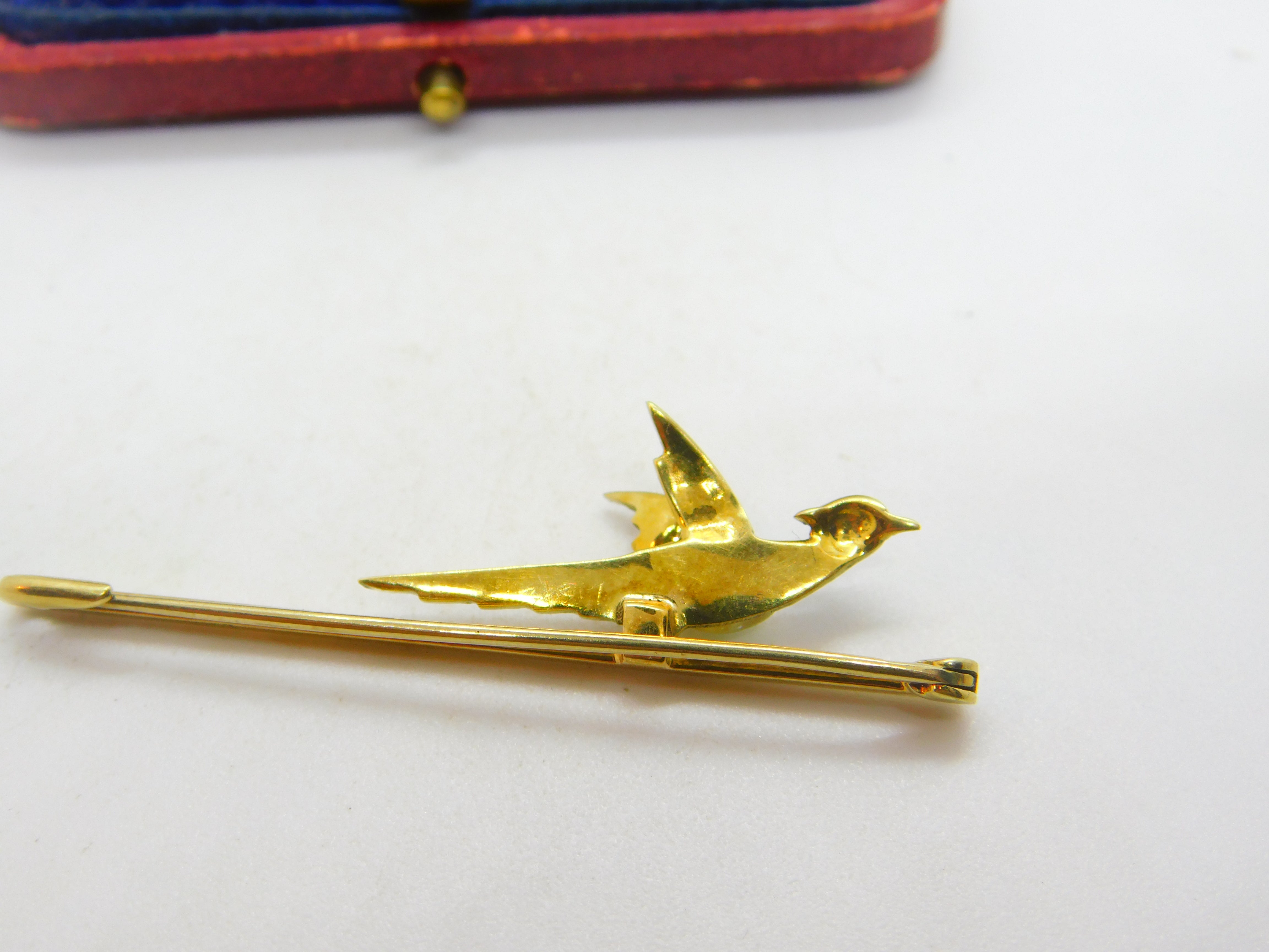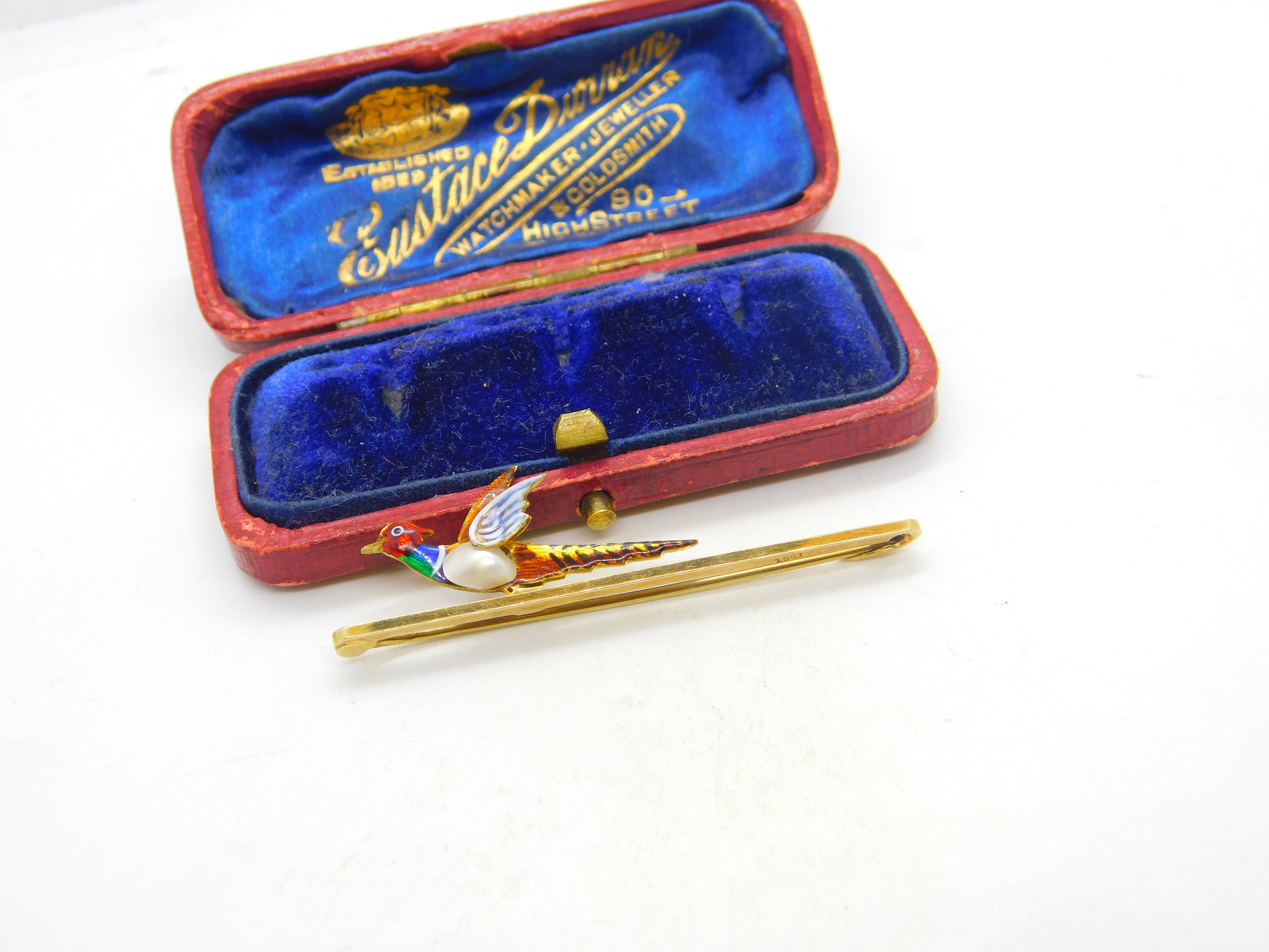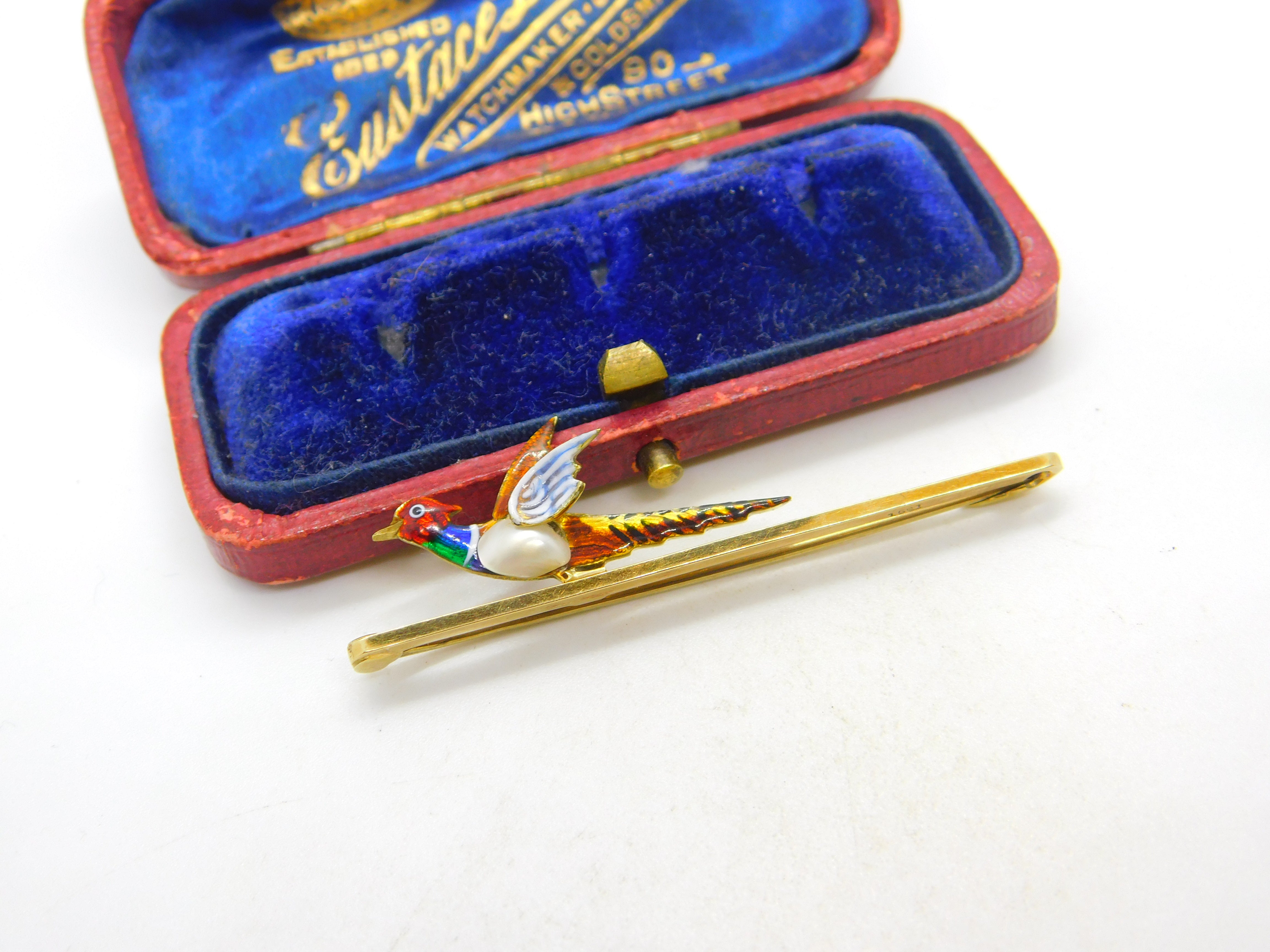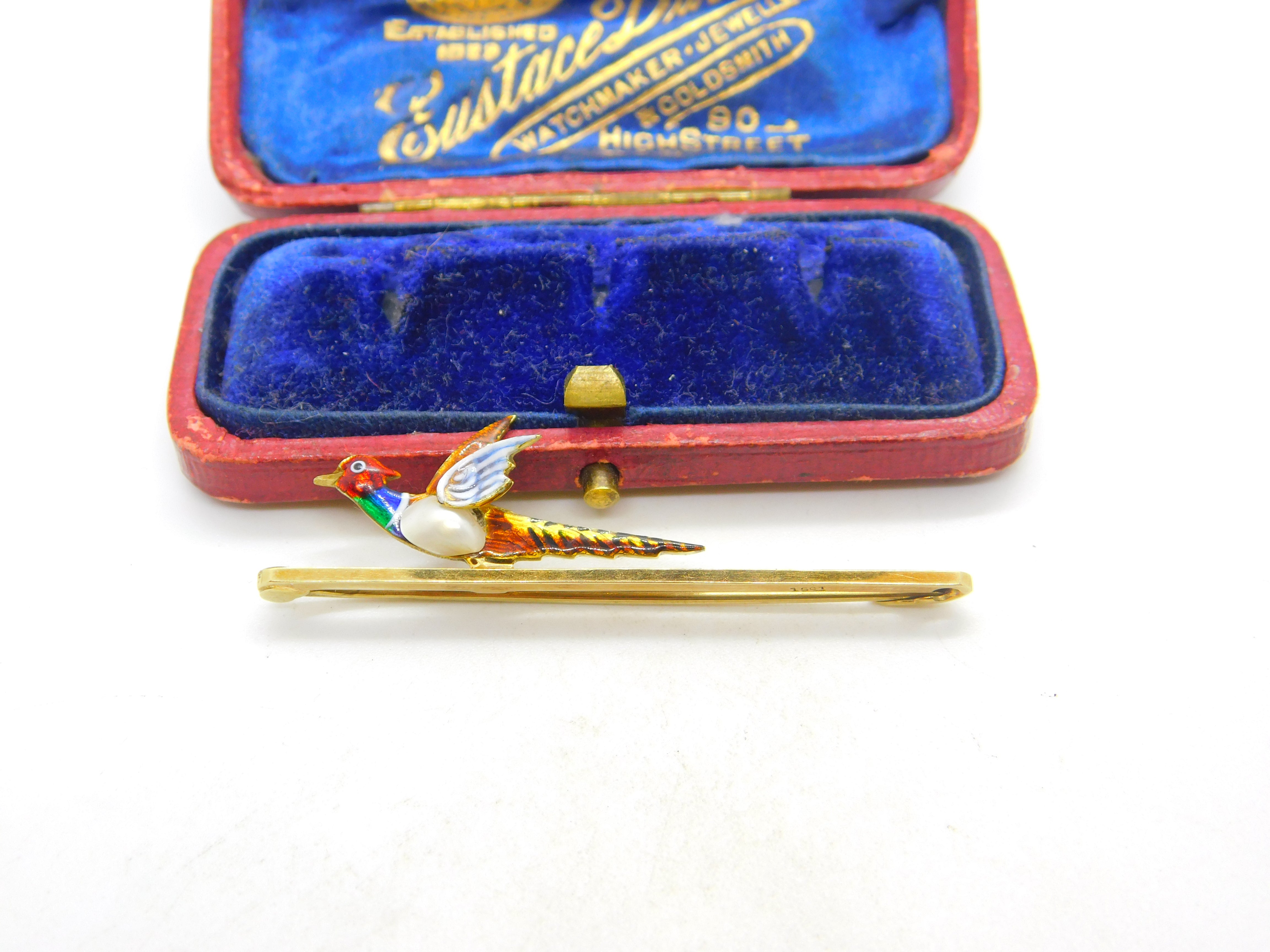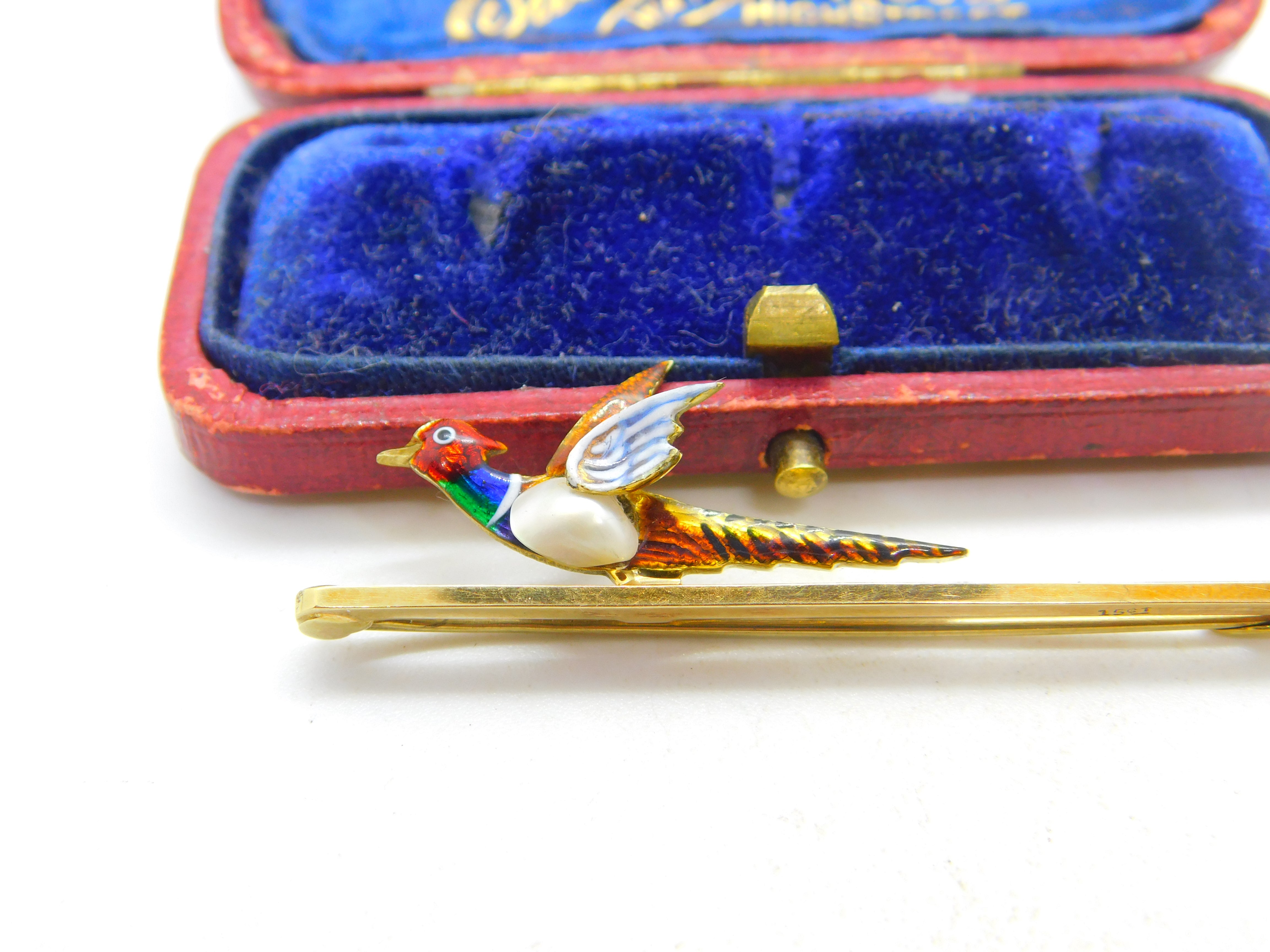 Details: A fantastic and wonderfully designed antique Victorian 15ct yellow gold colourful enamel and baroque pearl set pheasant shooting interest brooch pin with lovely design marked 15ct to the bar c1890. A gorgeous example. This is a wonderful item that would make a perfect gift or addition to any collection. The BOX pictured is for PRESENTATION ONLY and is NOT included in the listings but used to frame the pictures unless specifically stated otherwise.