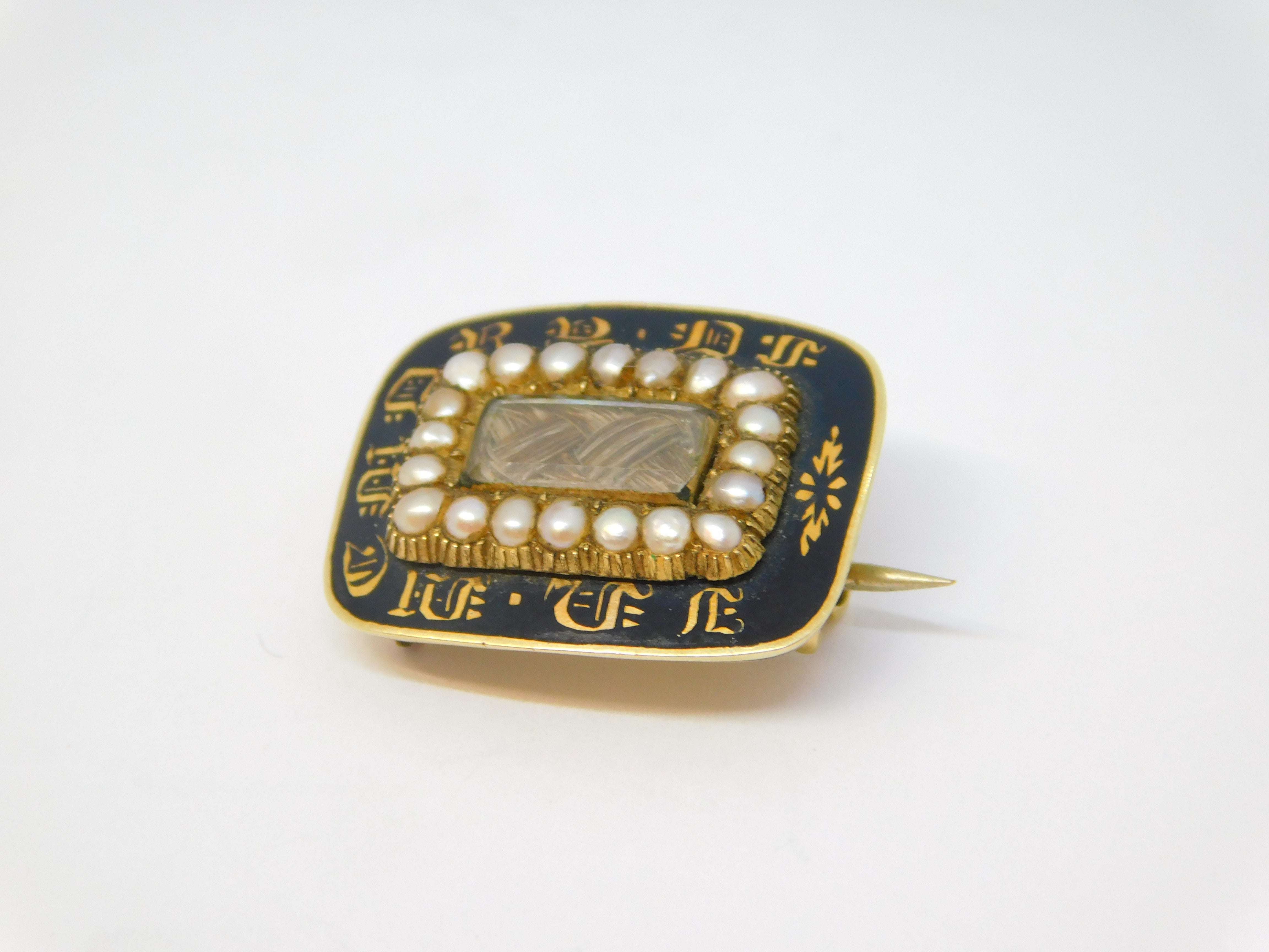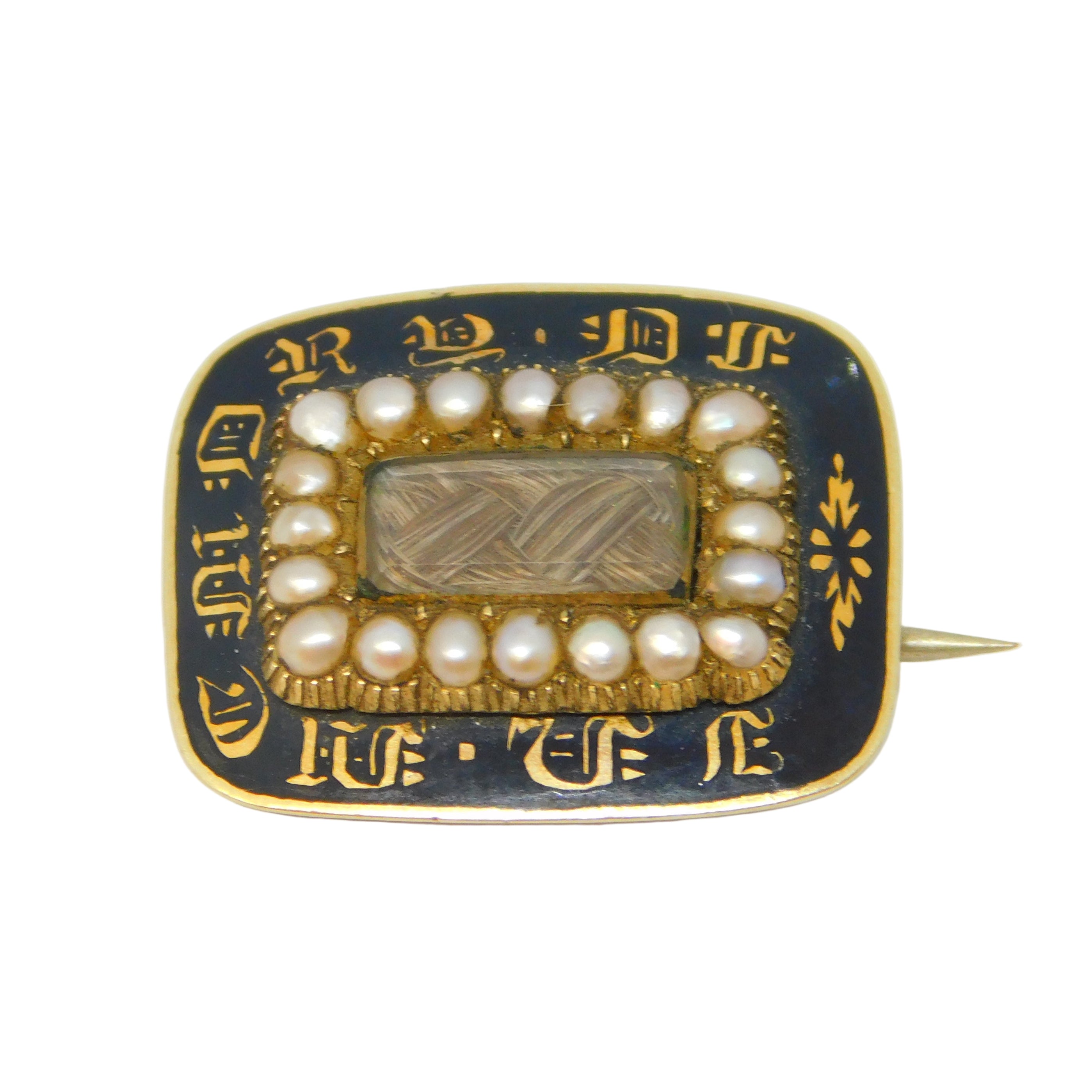 Details: A fantastic and wonderfully designed antique early-Victorian 15ct yellow gold mourning brooch adorned with black enamel, seed pearls & hair lock, engraved 'Mary Poile, Ob. 20 Mar. 1840 Oct 65', the gold has been XRF tested as it is unmarked. This is a wonderful item that would make a perfect gift or addition to any collection. We are more than happy to provide XRF reports for items upon request.