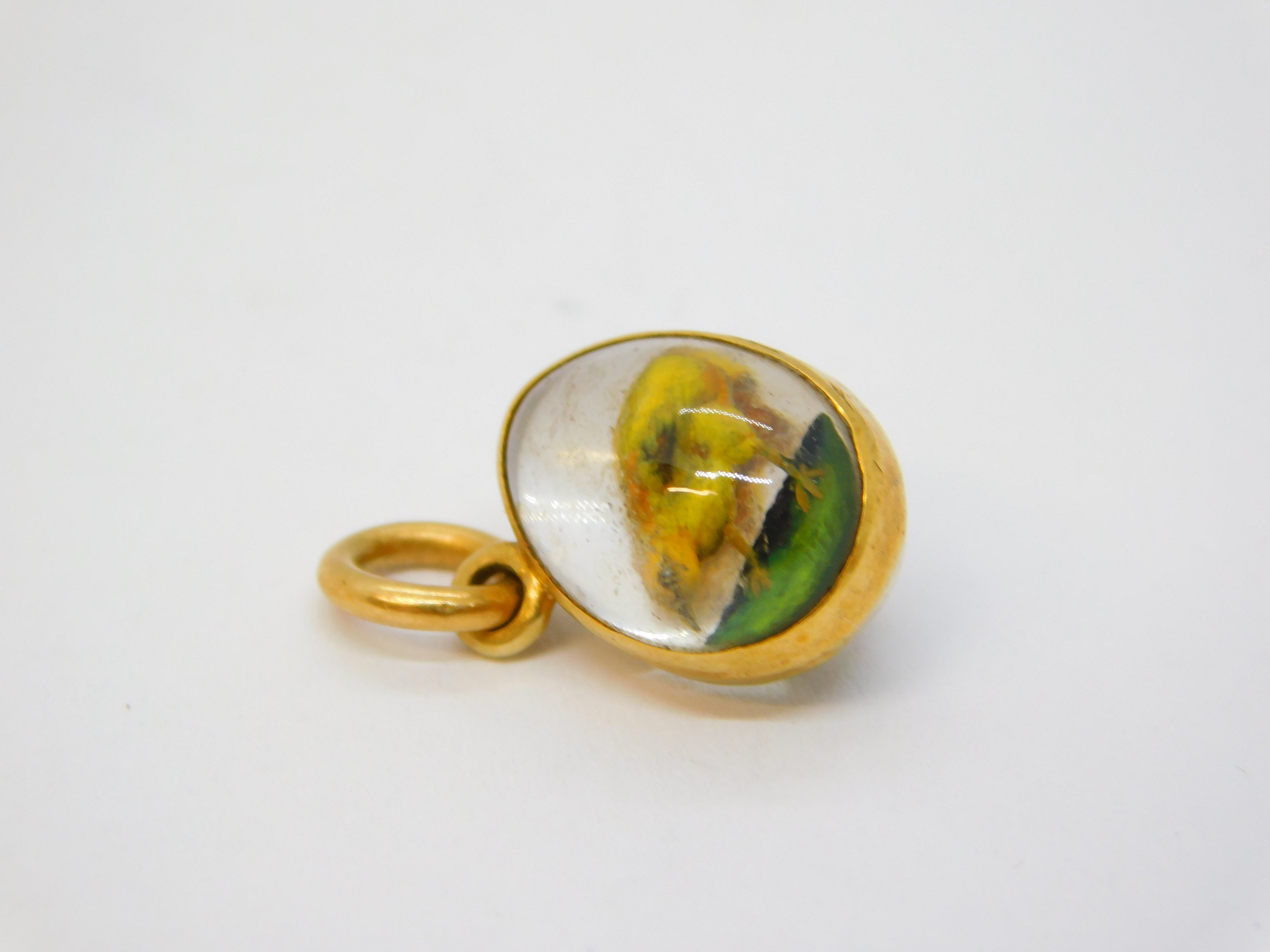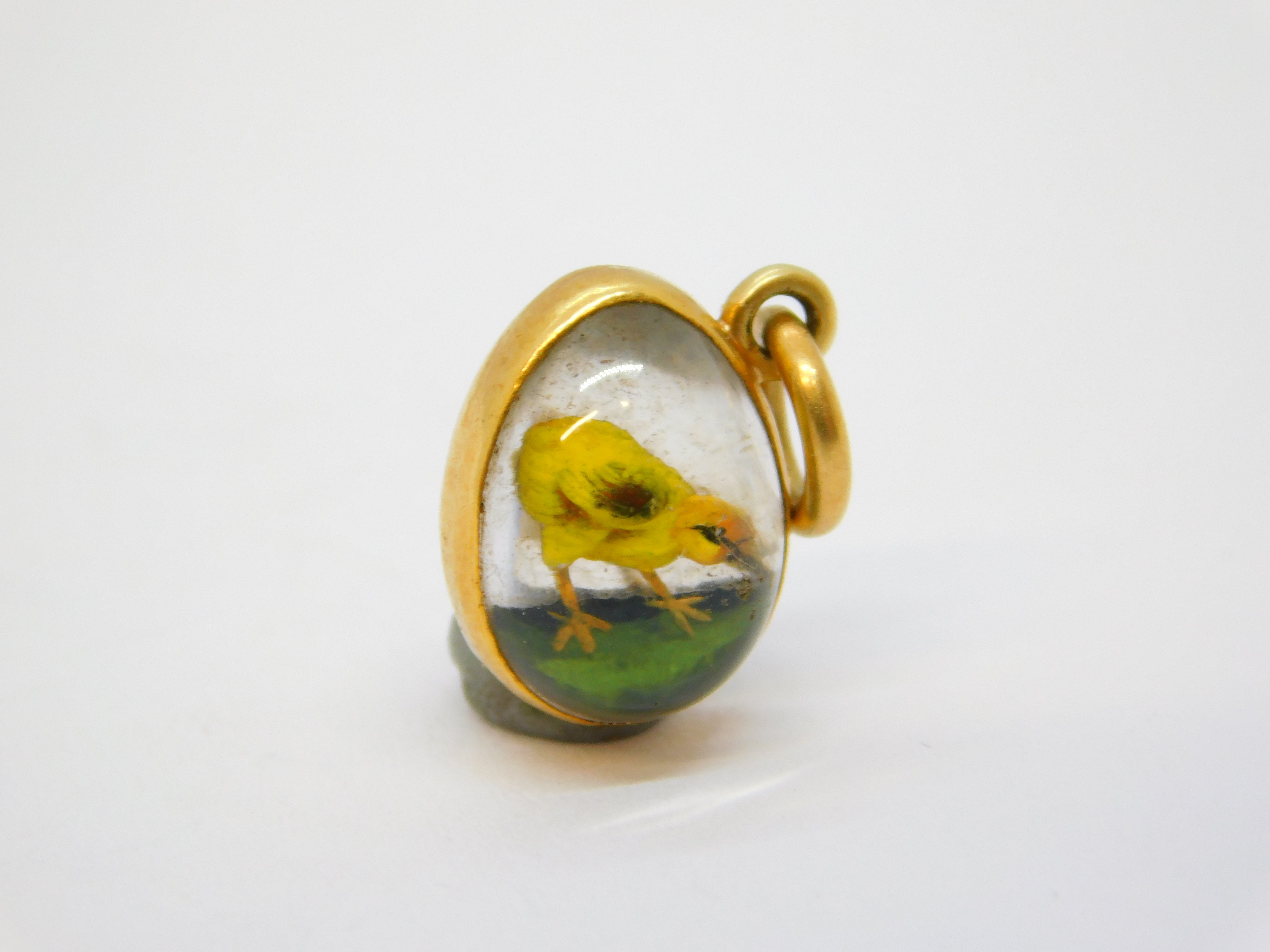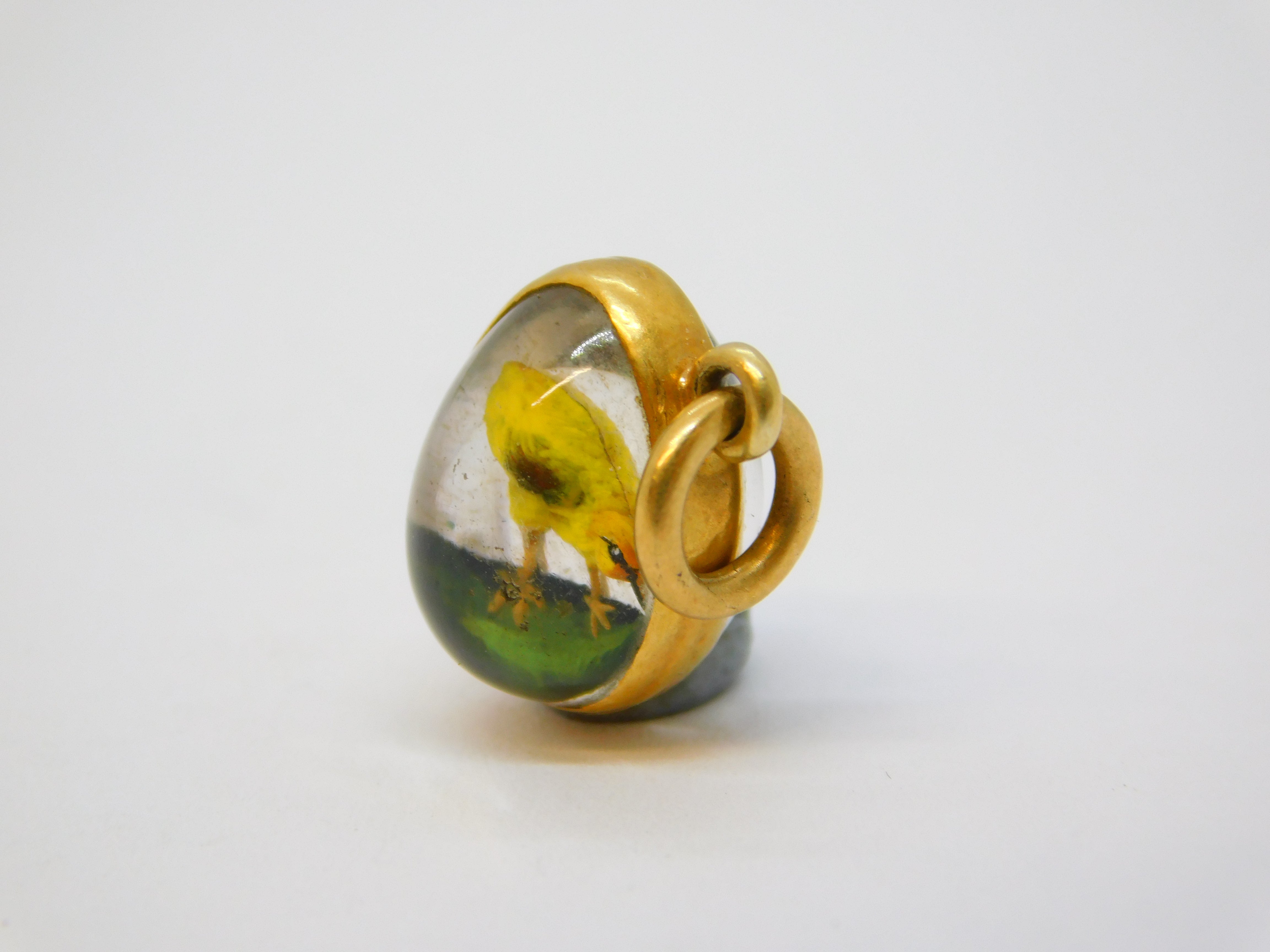 Details: A fantastic and wonderfully designed antique Victorian 15ct yellow gold mounted reverse carved Essex crystal charm or pendant depicting a little chick in egg form, hand painted carved crystal, a double-sided stunning example, the gold has been XRF tested - please see pictures for report. This is a wonderful item that would make a perfect gift or addition to any collection. We are more than happy to provide XRF reports for items upon request.